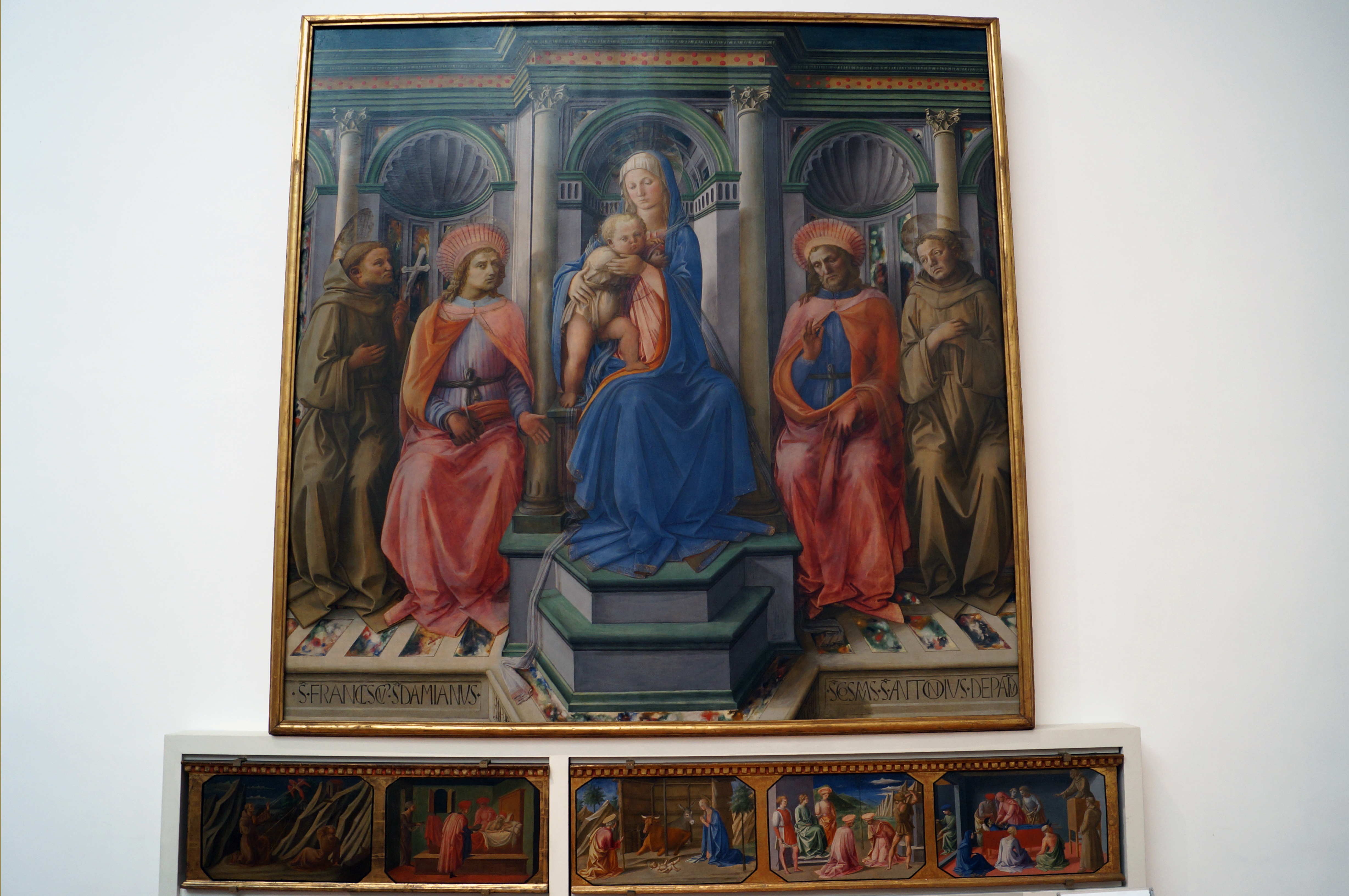 Микеллоцо, придворный архитектор Козимо Старшего, в 1445 году завершил строительство капеллы Новициато во францисканской церкви Санта Кроче. Художника Филиппо Липпи Козимо Старший пригласил для украшения алтаря и написания надалтарной картины. И, должно быть, именно к этому меценату, которому великий мастер доверял, относится его похвала:"редкие умные люди голубой крови не ослы-ямщики". Здесь на архитектурном фоне представлен классический сюжет – в соответствии со вкусом самого Микилоццо. На выплненной во фламанской манере многоцветной картине, с красными медичейскими эмблемами по фризу вверху и цветными мраморными полами, изображены Мадонна на троне с Младенцем и святые, сидящие в следующем порядке: Франциск (небесный покровитель церкви Санта Кроче), Дамиан и Косма (патроны семейства Медичи) и Антоний Падуанский. В пределле: Св. Франциск получает стигматы и С. Космас и Св. Дамиан исцеление Юстиниана (копии); Рождество; мученичество святого Космы и святого Дамиана, чудо святого Антония. 1440-1445.