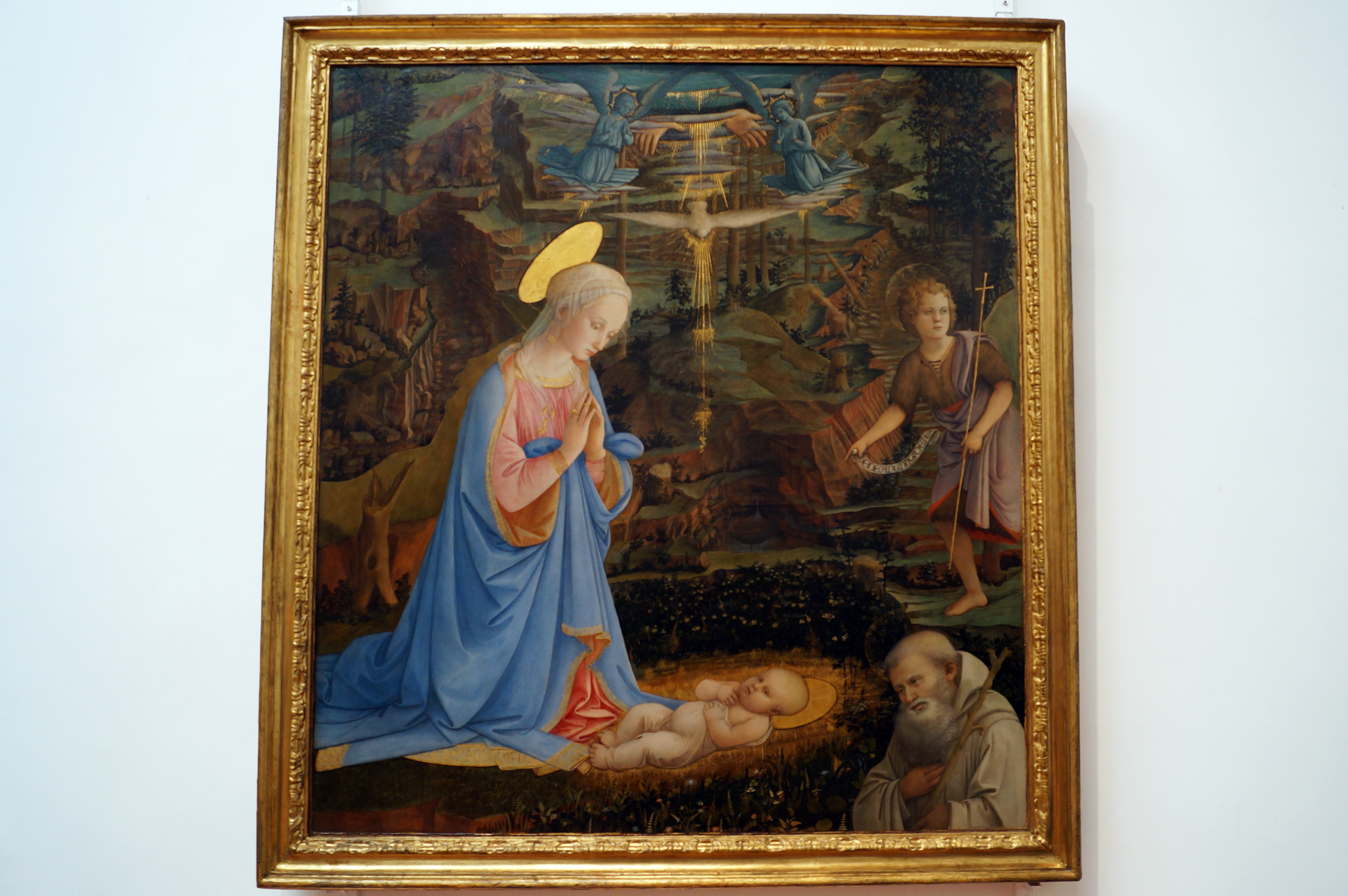 Филиппо Липпи (1406 - 1469) был одним из самых. любимых художников семьи Медичи. Картина "Поклонение новорожденному Христу с Молодым Иоанном Крестителем, Святым Ромуалом, Ангелами, Руками Бога Отца и Святым Духом", изображённым как Голубь, была заказана Пьеро де Медичи для семейной обители в Камальдоли, материнского дома монашеского ордена, основанного Св. Ромулдом. Скалистый пейзаж на заднем плане, доходящий до неба, подчеркивает мистический характер картины. Филиппо Липпи и Пьеро де Медичи, прозванный из-за болезни "Пьеро-подагрик", дополнили сцену ещё несколькими версиями композиции (1463).