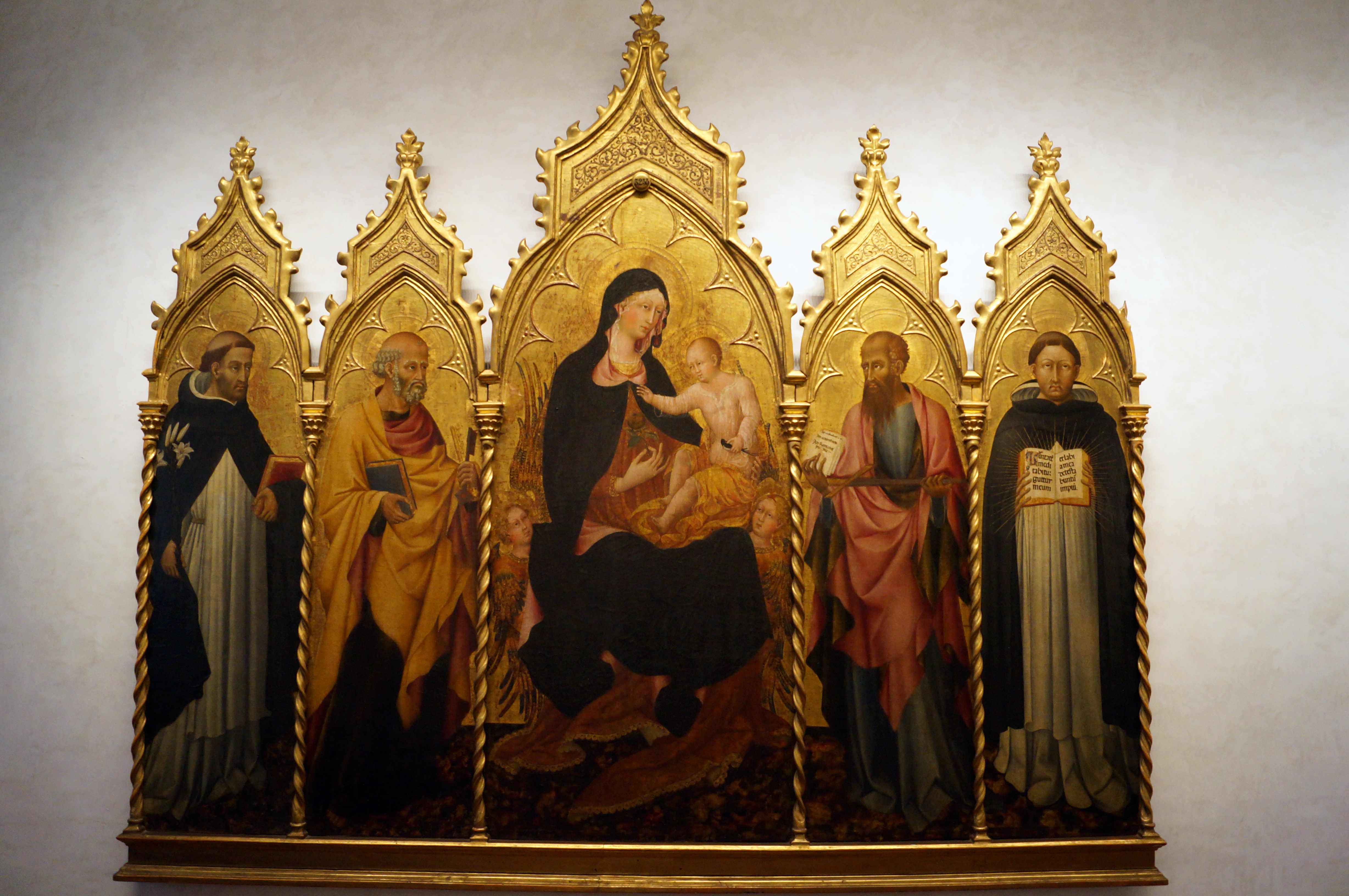 Подписанный и датированный 1445 годом, полиптих "Мадонна с младенцем со св. Домиником, Св. Петром, Павлом и Фомой Аквинским" был идентифицирован как алтарь, написанный одним из самых значительных последователей сиенской школы живописи Джованни ди Паоло (Giovanni di Paolo di Grazia; ок. 1400 – 1482) для семьи Гуэльфи в церкви Святого Доминика в Сиене. Документ 17-го века сообщает о том, что у него также была пределла со Страшным Судом и эпизодами из Бытия. Панель теперь находится в музее Метрополитен в Нью-Йорке. Полиптих был приобретен Коррадо Риччи (Corrado Ricci), директором галереи Уффици, у частного коллекционера по имени Нокколо Джакконе (Noccolo Giaccone) в 1904 году. Это единственная работа во Флоренции мастера пятнадцатого века из Сиены. В большом полиптихе, выполненном в традиционном стиле, Мадонна с Младенцем с ангелами представлена на золотом фоне среди святых Доминика, Петра, Иоанна Евангелиста и Фомы Аквинского. Ссылки на международную Готику очевидны в драпировке, на цветочном лугу, в вытянутых силуэтах. Художник был вдохновлен произведениями Сассетты (Sassetta, настоящее имя Стефано ди Джованни, итал. Stefano di Giovanni; 1392 – 1450/1451), который был немного старше его.