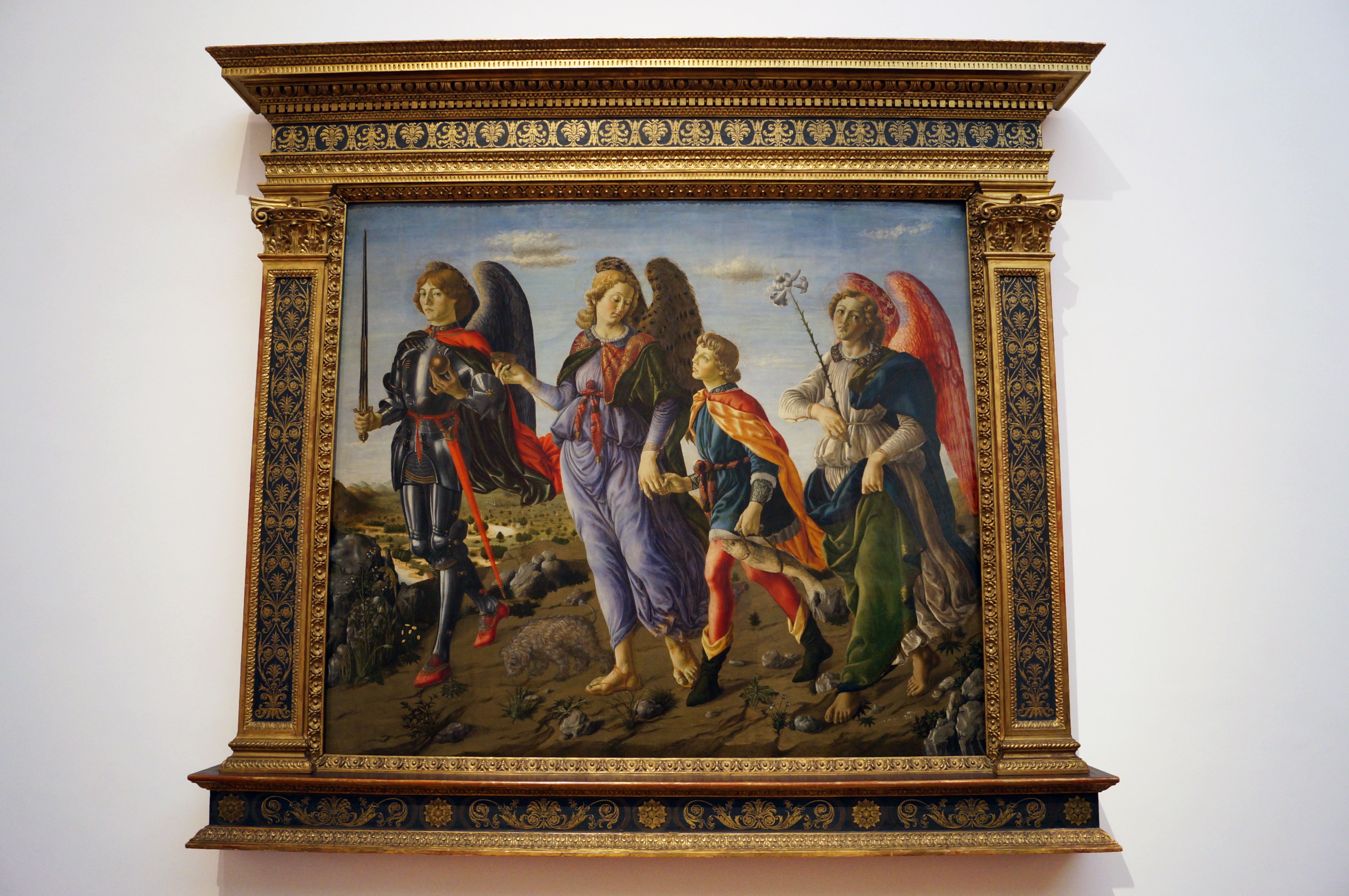 Панель "Три Архангела и Товий" написана в период 1470 - 1475 гг. флорентийским мастером Франческо Боттичини (1446 - 1497). На ней художник изобразил библейскую историю из Книги Товита, которая не была включена в канонический текст. В отличие от работы на эту тему его учителя Андреа Верроккьо, художник увеличил число персонажей, включив ещё двух архангелов – Михаила (с мечом) и Гавриила (с цветком лилии в руке). Товия вместе с Рафаэлем сопровождает обнюхивающая землю маленькая белая собачка. В то время собаки редко упоминались в библейских историях как человеческие спутники, но в эпоху Возрождения они стали символом верности. Товий держит рыбу, которой был почти съеден во время купания, но по указанию Архангела поймал и извлёк из неё сердце, печень и желчь. Рафаэль показывает, как держит в правой руке желчный пузырь в маленькой коробке. Хотя пейзаж по стилю итальянский, река, которая видна вдали, вероятно, представляет собой реку Тигр. За свою карьеру Боттинини написал как минимум семь версий этой истории, которая была популярна у торговцев и путешественников, особенно в Флоренции конца пятнадцатого века. Популярность этой истории привела к идее ангелов-хранителей позднего Ренессанса, которые сопровождают каждого верующего. С шестнадцатого века подобные изображения были обычными, хотя без рыбы или собаки, представленной здесь, а Товий часто изображется гораздо более молодым. Боттинини был известен тем, что использовал яркие цвета, увиденные здесь в смелой окраске чулок. Другие цвета со временем исчезли: зеленый пейзаж ранее был еще более зеленым, розовый туники Рафаэля с накидкой Товия более тональными, а синий плащ Рафаэля и крылья намного ярче. Эффективное моделирование фигур Боттинини, особенно лицо мальчика, иудлиненные пальцы и мягкий наклон головы Рафаэля, сильно повлияло на стиль и технику Боттичелли. Влияние Андреа дель Верроккио также ясно просматривается в деталях складок и драпировок.