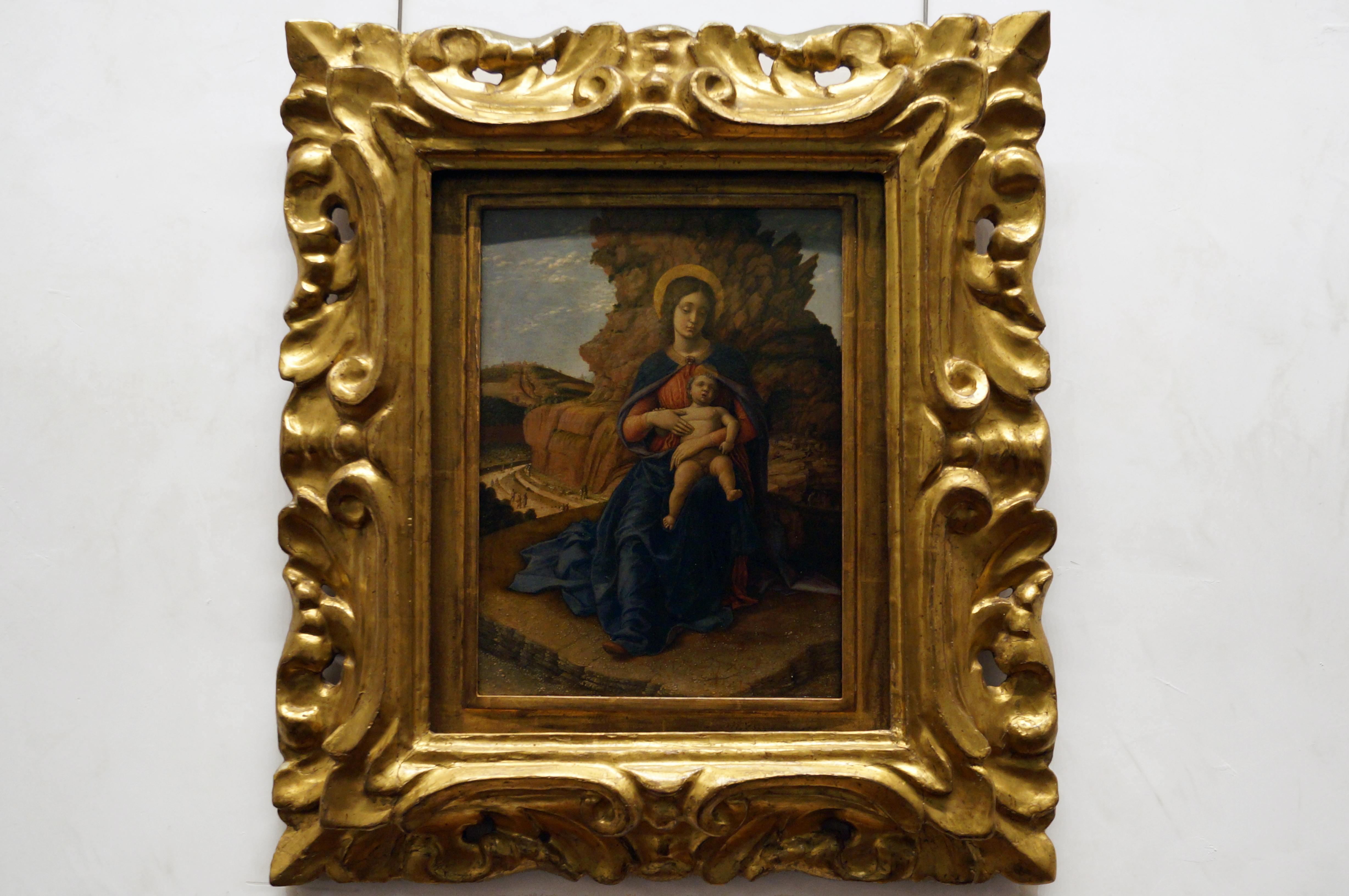 Почти ничего не известно об этой маленькой панели, упомянутой Вазари в 1568 году в коллекции Франческо I де Медичи. Картина Андреа Мантенья (1435-1506) "Мадонна Печерская" (Madonna delle Cave) написана ок. 1488 - 1490 гг.. Мадонна с Младенцем кажутся изолированными в запустении скалистого хребта. Работа названа по имени каменного карьера на правом фоне, где камнетёсы вырезают саркофаг, который, возможно, предвосхищает будущие бичевание и жертву Христа. На переднем плане изображена Мадонна с Младенцем на коленях. Богоматерь сидит на скалистой платформе с трапециевидной формой. Она одета в традиционное красное платье, которое символизирует сострадание и голубой плащ, напоминающий о Церкви, застёгнутый пряжкой с драгоценным камнем. Платье особенно мягкое, падает на все её тело и на часть каменной плиты, которая занимает почти половину нижней части картины. Кажется, что это величие, сидящее на естественном троне. У Мадонны очень молодой вид и она смотрит вниз в левый угол. В её образе есть серьезное и завуалированное выражение грусти. Обнажённый Иисус лежит в объятиях матери на её левом колене. и выглядит восторженным в экстатической фазе. Скала, на которой сидит Богоматерь, может быть предназначена для напоминания на вершину Голгофы, в то время как слева видны пастух и его стадо, собирающие сено с поля крестьяне, замок и дорога, ведущая к далекий город. При написании картины Андреа Мантенья пользуется красками с преобладанием коричневых тонов, которые усиливаются и становится серыми в затенённых областях. В освещенных завуалированным солнцем фрагментах картины, цвет становится более желтым. Мантия Мадонны синеватая, серая, очень темная, в то время как её платье традиционно красное, но не очень насыщенное. Цвет лица Младенца и Мадонны устремлён к золотому, поэтому он гармонизирует с цветами пейзажа. Небо не синее, а склонное к серому и усеяно мягкими белыми облаками. Некоторые интерпретируют переход от темного фона к светлому, перемещая взгляд справа налево, как аллегорию искупления через Христа и Церковь, а Марию – как мать обоих.