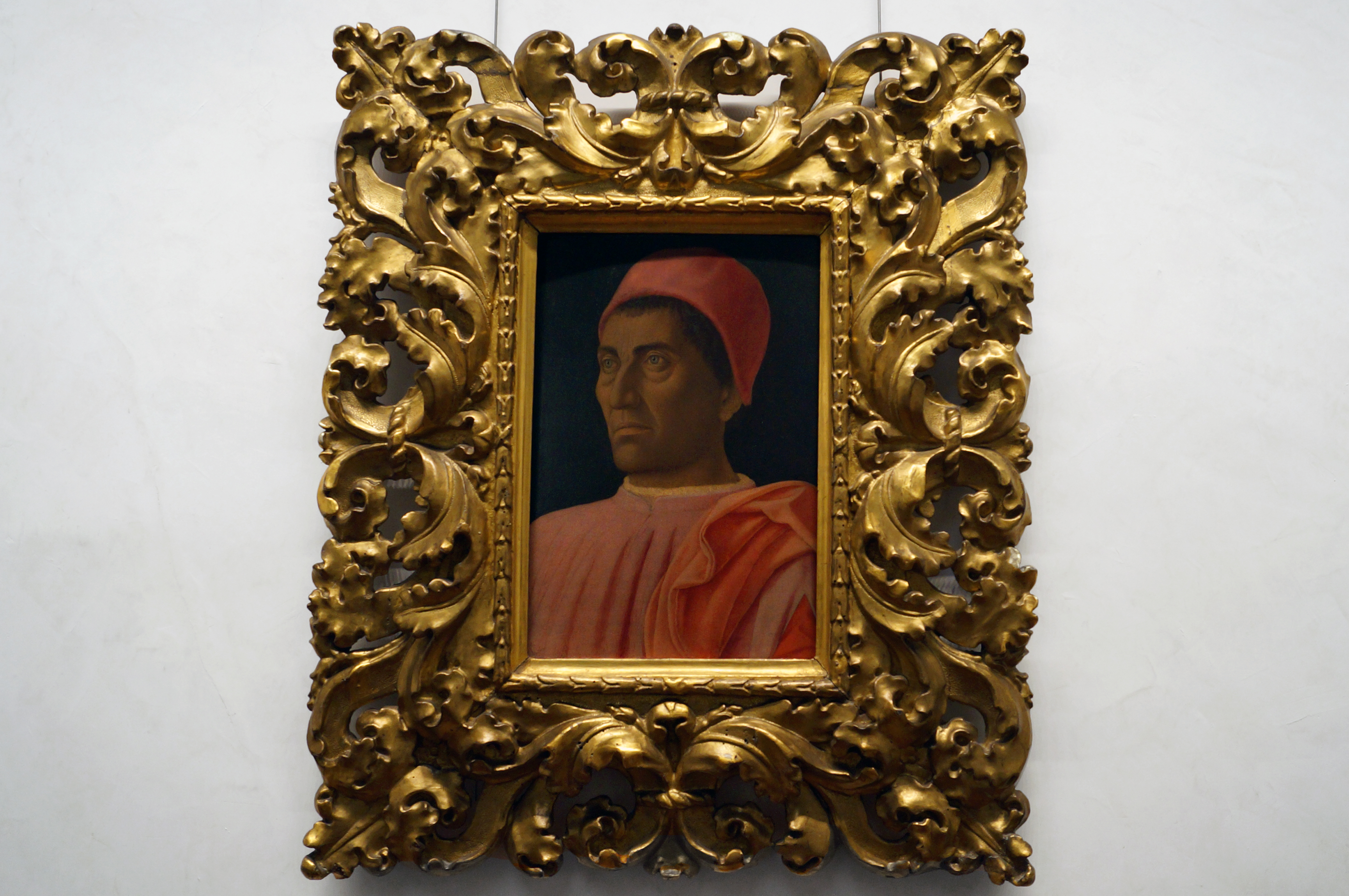 Так же мало что известно о происхождении этой картины. Работа была датирована 1459-1460 годами, когда Андреа Мантенья прибыл в Мантую и получил множество заказов на написание официальных портретов (этот человек был идентифицирован как Людовико Гонзага, епископ Мантуи), когда художник, возможно, путешествовал во Флоренцию. Считалось, что портрет был сделан в Мантуе во время консилиума 1459 года, а не во время пребывания художника во Флоренции. Возможно, это был эскиз для изображения на надгробии. Фигура прелата проявляется в трехмерном виде на фламандский манер. В настоящее время наиболее предпочтительой является гипотеза того, что на портрете изображён Карло де Медичи, незаконнорожденный сын Козимо де Медичи Старшего и черкесской наложницы, о чем свидетельствуют ясные голубые глаза этого человека. В 1912 году копия портрета была включена в родословную Дома Медичи. Однако, она отличается от идентификации Карло как персонажа в рассказах Филиппино Липпи о Св. Стефане и Иоанна Крестителя в соборе Прато. Ссылка на Мантейну тоже была неоднозначной, так как долгое время картина считалась работой Доменико Венециано. Темнокожий мужчина носит одежду протонотационного апостола, положение, которое имел Карло с 1463. Официальная природа картины объясняет отсутствие какого-либо психологического элемента и внимание к деталям, таким как платье и шляпа.