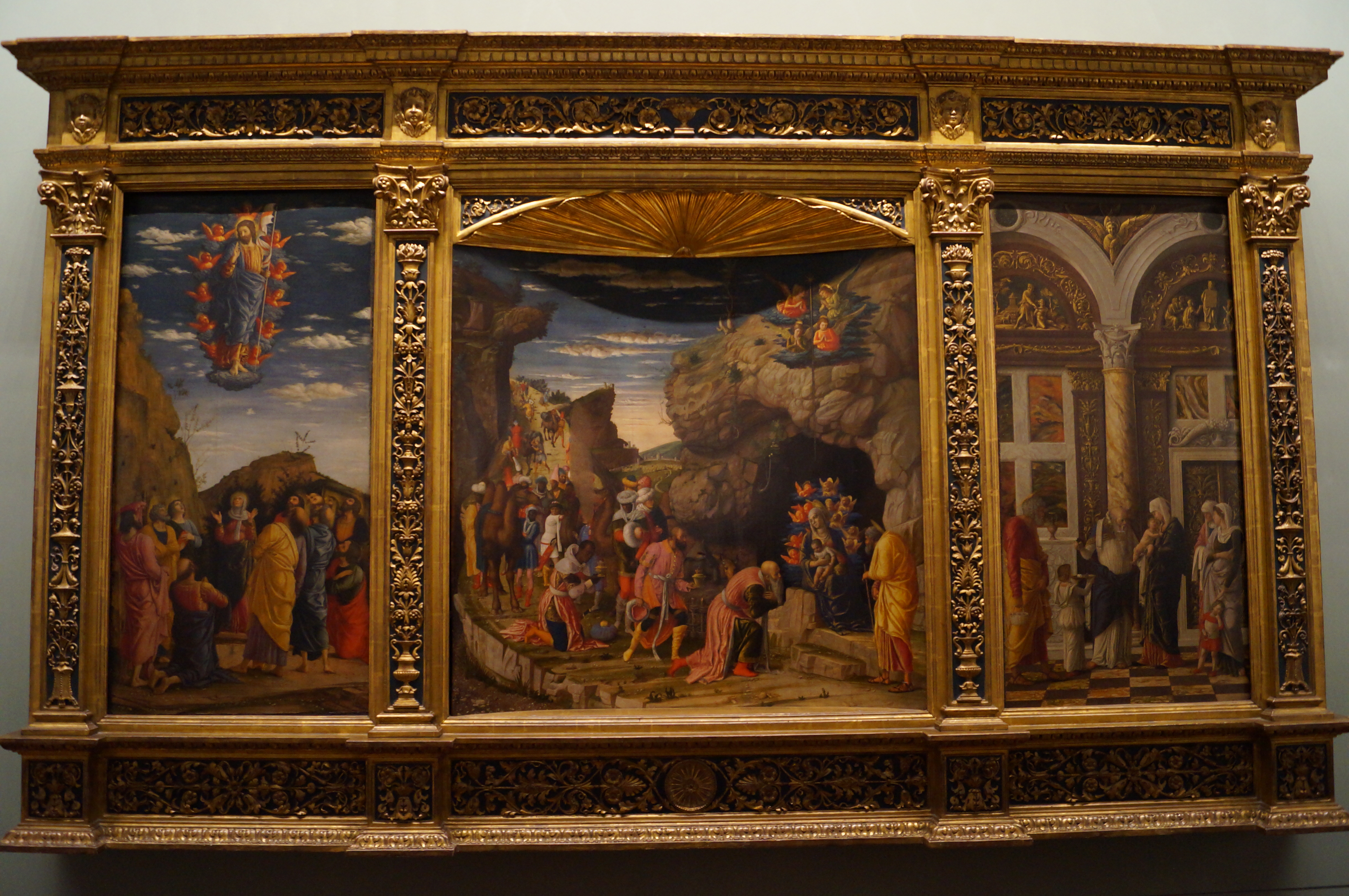 Триптих с Поклонением волхвов, Обрезанием и Вознесением был написан венецианским художником из Падуи Андреа Мантенья (1431-1506) по заказу маркграфа Лудовико Гонзага для капеллы при его фамильном дворце в Мантуе. В центральной части художник представил сцену поклонения волхвов: среди столь любимого им каменистого пейзажа движется длинная процессия людей в роскошных одеяниях. Они идут поклониться Младенцу, сидящему на коленях Марии. Вокруг вьются ангелы. Сухое и яркое письмо Мантеньи заставляет изображение буквально сиять, еще и благодаря особому "воздуху" в картинах – совершенно прозрачному, разреженному, какой бывает только высоко в горах. Поэтому в созданном художником мире видно все: и тропинку вдали, и светлый замок, к которому она ведет, и шерсть верблюда, и жесткие травы, и тоненькие золотые нити, которыми пронизаны одежды. И в то же время сцену можно представить развернутой во всю стену капеллы. Мантенья это знал и, чтобы усилить эффект монументальности изображенного, написал его на вогнутой поверхности. В сцене "Обрезание" художник старательно выписал орнамент стен, композиции в люнетах – "Жертвоприношение Исаака" и "Моисей, вручающий народу скрижали Завета", корзину с голубками в руке Иосифа, поднос с принадлежностями для обрезания, который мальчик протягивает первосвященнику. Трогателен образ маленького Иоанна Крестителя, который сосет палец, держа в другой руке надкушенный бублик. Вся эта детально прописанная сцена подошла бы и для большой фрески. И только в третьей композиции –"Вознесение" – почти нет тщательно изображенных подробностей, она аскетичнее и мощнее, в ней опять виден каменистый ландшафт, и даже облако, на котором стоит Христос, кажется вырезанным из мрамора. Но, как и прежде, тонко переданы чувства персонажей: изумление и надежда Марии и апостолов, легкая грусть и обещание встречи на небесах во взгляде Спасителя.