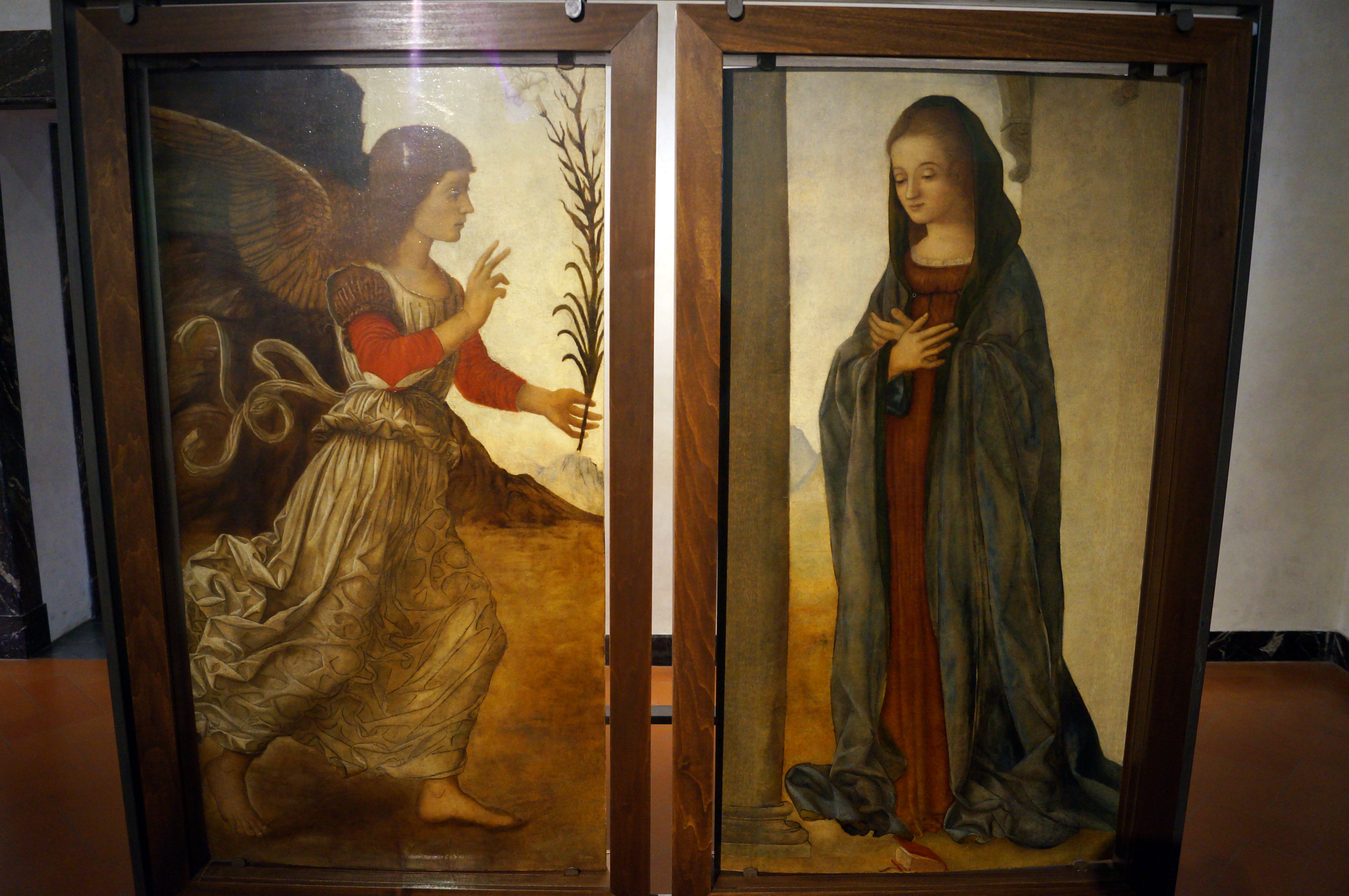 "Святой Иоанн Богослов" Витторе Беллиньано и "Сивилла" Николо Рондинелли. Долгое время картины приписывали кисти Витторе Карпаччо как одной из его первых работ для школы святой Урсулы во Флоренции, где он написал на полотне большую часть Истории о жизни и смерти этой святой. Сомнения в авторстве возникли в 1912, когда антиквар Луиджи Баруффи ди Ровиго (итал. Luigi Baruffi di Rovigo) обратился письмом в Главное управлению Флоренции с просьбой продавать “две картины работы Carpaccio за 700.000 итальянских лир, согласно данному 9 января 1912 извещению ”. Речь шла о двух панелях со Святым Иоанно Богословом и Сивиллой. Главный инспектор управления Флоренции Джино Фоголари (итал. Gino Fogolari) в то время писал, что картины “были бы хороши в такой галерее, как наша Академии [...], но с ценой не высше 50.000 лир”, убежденный, что они переоценены на рынке, потому что считаются оригиналом Витторе Карпаччо. Возникло замешательство в отношении авторства картин. После проведения более глубоких исследований сомнения остались и сделка не состоялась. В конце апреля 2004 на реставрацию Уффици поступили картины Профет и Сивилла (итал. Profeta и Sibilla), которые были приобретены в 1989 у тайного итальянского агента, занимавшегося поиском произведений искусства, украденных от Италии во время Второй мировой войны, Родольфо Сивиеро (итал. Rodolfo Siviero). Произведения оказались хорошего качества. Согласно заключению Института истории искусства Флоренции (истооорик Анкизе Темпестини/итал. Anchise Tempestini), портрет Сивииллы был признан работой Никколо Рондинели (итал. Niccolo Rondinelli). Друое произведение, названное ранее "Профет", представляет некоторые иконографических характеристики свойственные Святому Иоанну Богослову и была признана работой Витторе ди Матео Беллиниано (итал. Vittore di Matteo Belliniano) из Венеции.