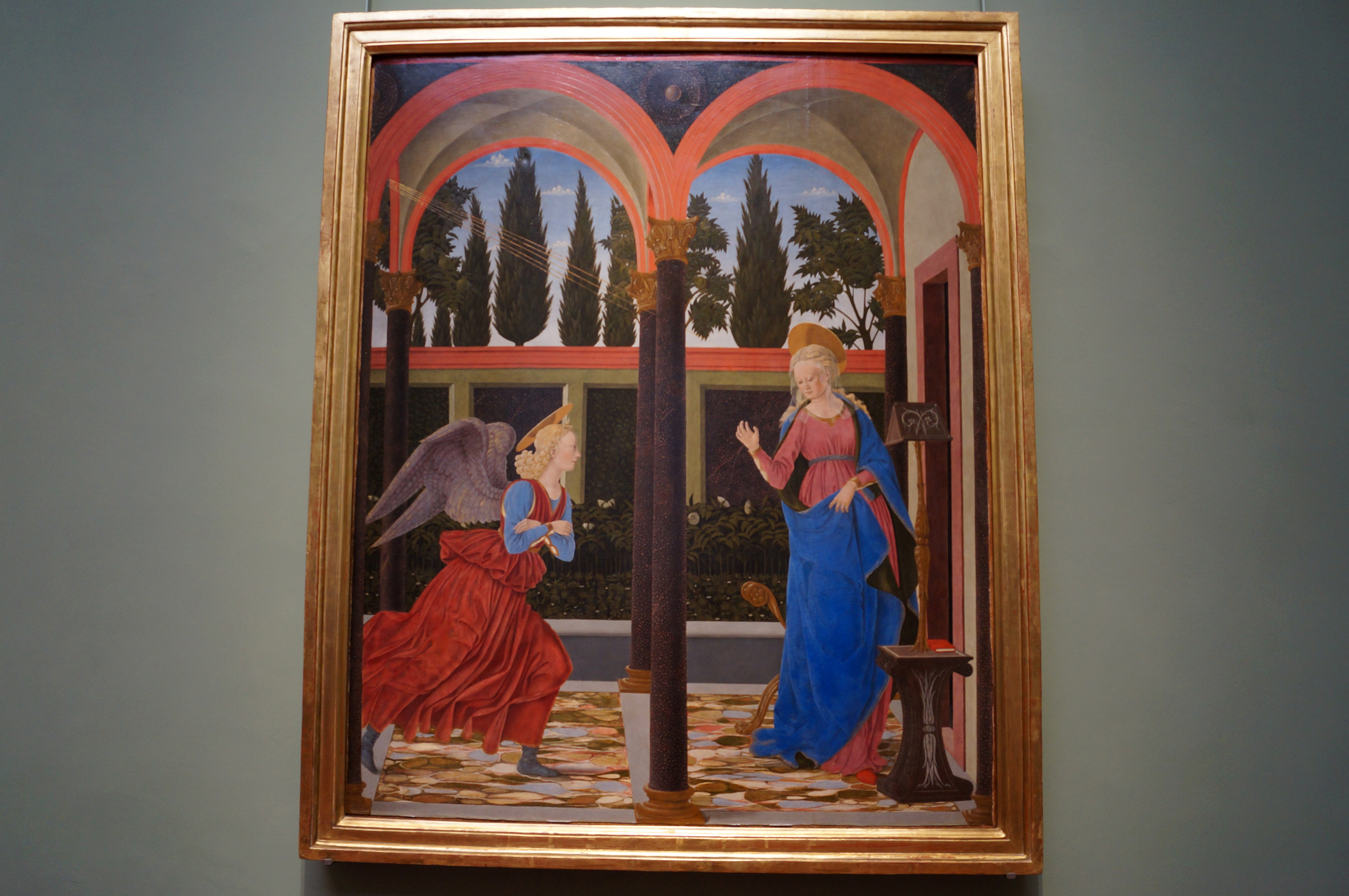 Картина "Благовещение" написана Алессо Балдовинетти (Alesso Baldovinetti) для сильванских монахов церкви Св. Георгия на берегу (San Giorgio alla Costa) валломброзанского монастыря около 1457 г. и хранится в галерее Уффици во Флоренции. Вазари ошибочно принял её за работу Пезеллино (Pesellino). Сцена происходит в лоджии, закрытой высокой стеной на заднем плане, за которой видны вершины кипарисов и фруктовых деревьев, напоминающие уголки земного рая. Богородица с элегантно вытянутой фигурой слегка удивлённым жестом стоит перед маленьким столиком, на котором лежит небольшая красная книга, которую она читает, расположив, вероятно, на очень высоком пюпитре. Ангел явился с левой стороны в рифлёном от быстрого движения плаще, и, скрестив руки в знак смирения, приносит ей новость, которую она принимает в момент снисхождения с небес золотых лучей божественного оплодотворения.
