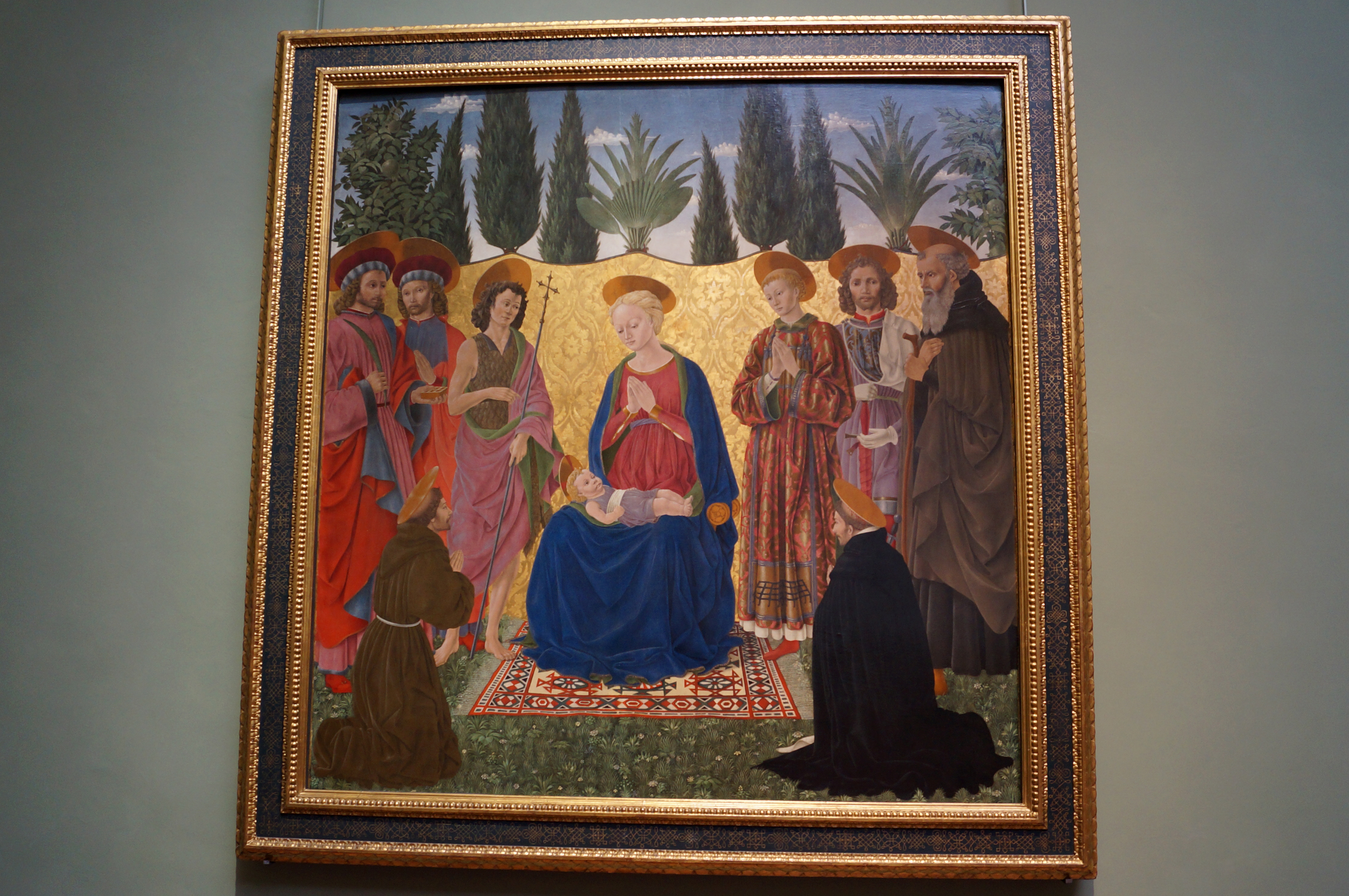 Козимо Росселли (Cosimo Rosselli; 1439 - 1507). Мадонна с Младенцем на престоле с ангелами, святителем Николаем и игуменом Антонием. 1468-70. Темпера по дереву. Это панно, поступившее в Уффици из церкви Сан-Пьер-Скераджо в 18 веке, представляет собой юношескую работу Козимо Росселли, самого известного члена семьи художников, работавших во Флоренции в 15 и 16 веках. Высоко оцененный современниками, Росселли был вызван в Рим вместе с Боттичелли, Гирландайо и Перуджино для росписи Сикстинской капеллы в Ватикане.
