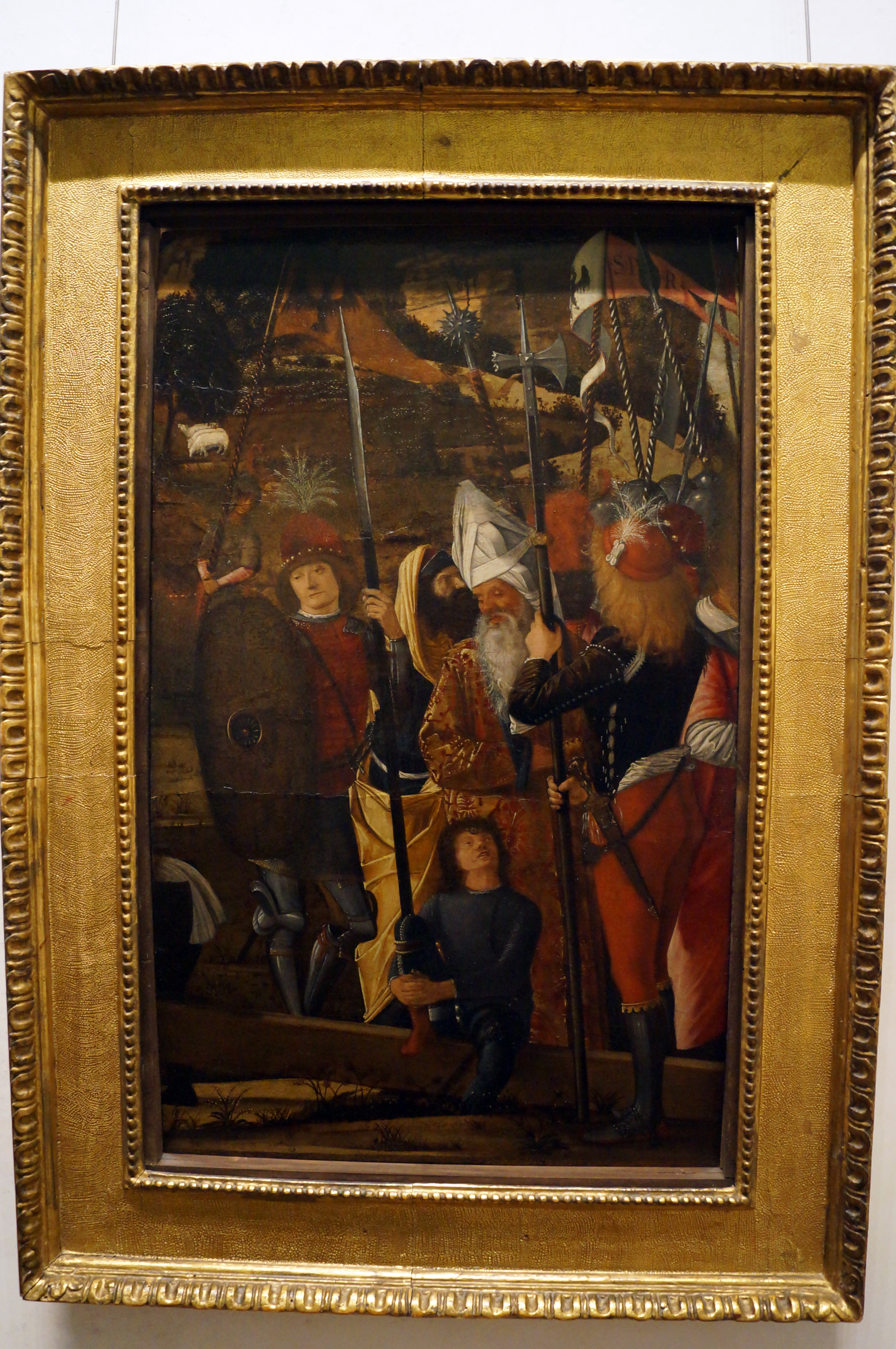 Панель "Алебардщики и старцы" Витторе Карпаччо (Vittore Carpaccio; 1460/1465 – 1525/1526) написал в период 1490 – 1493 гг. Витторио был одним из главных творцов живописи в Венеции между пятнадцатым и шестнадцатым веками, став, возможно, лучшим свидетелем жизни, костюмов и необычайной внешности Венецианской республики в те годы. Отмеченная ранее в коллекции Изабеллы Бьянчиарди-Пини во Флоренции, картина "Алебардщики и старцы" поступила в Уффици в 1882 году. Она был куплена флорентийским музеем за 11500 лир. Сцена изображает солдат с алебардами, расположенных в разных позах почти полукругом вокруг двух пожилых, богато одетых старцев. Солдат сидит на бревне, которое, вероятно, служило основой креста в момент подготовки к распятию. Возможно, автор намекает на Иисуса или одного из Десяти тысяч мучеников. Прикреплённый к вершине копья флаг несет слово SPQR, которое подтверждает один из двух возможных атрибутов. На заднем плане можно видеть сельский пейзаж, где пасутся овцы. Стилистически работа связана с такими произведениями, как Мученичество Св. Урсулы, которое следует за возможной датировкой. В Библиотеке Христа Церкви в Оксфорде есть рисунок, в котором, возможно, есть исследование этих цифр; другие видят возможный вывод фрагмента в рисунке с Мученичеством Десяти тысяч в коллекции фон Хирша в Базеле.