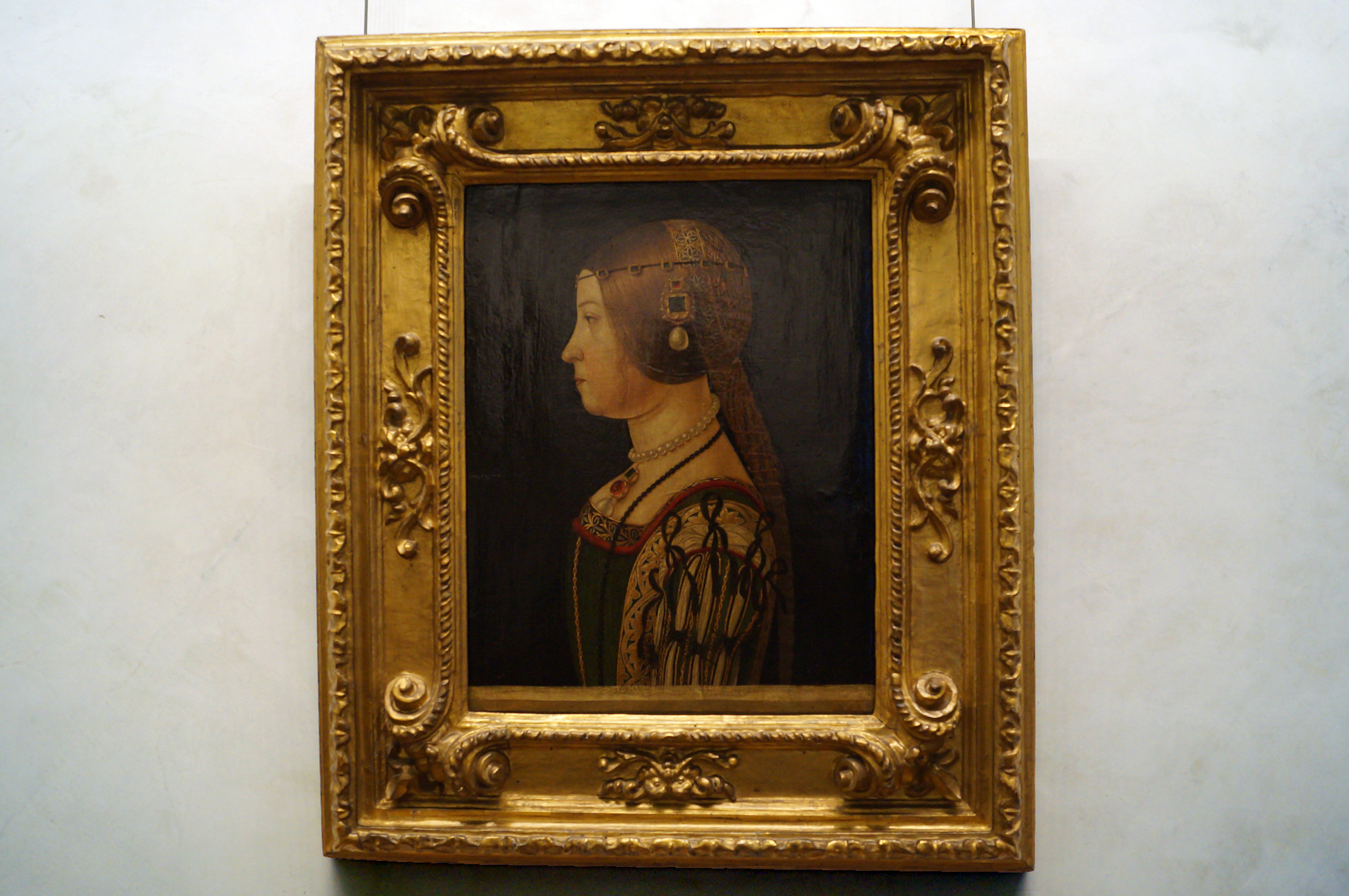 Это портрет Беатриче д’Эсте (Феррара 1475 – Милан 1497), жены Людовико Мария Сфорца, известного как Людовико иль Моро, герцога Милана с 1494 года, написанный в 1495 году, ранее находился во Дворце Питти и поступил в Уффици в 1919 г. Девушка носит драгоценные украшения и даёт великолепный пример "coazzone" с длинными косами, закрепленными элегантной сеткой для волос. Портрет относят к школе Ломбардии и считают работой художника из Пармы Алессандро Аральди (Alessandro Araldi, 1460 – 1528/29). Алессандро был художником итальянского Возрождения, о котором мало что известно, но часть его работы сохранилась. Он родился в Северной Италии в провинции Парма, главной достопримечательностью столицы которой является её архитектура. Современниками Аральди, также родившиеся в Парме, были Антонио да Корреджо и Микеланджело Ансельми. Корреджо часто назыается самым выдающимся художником школы Пармы в итальянском Возрождении; он и Аральди создали фрески для аббатства в Джованне да Пьяченца. Аральди напиал сцены из истории святой Екатерины в 1514 году для аббатства Джованны Пьяченца (Giovanna Piacenza): "Спор между императором Максимилианом, Св. Екатериной и Св. Иеронимом", а также необычное "Благовещение". Несмотря на некоторые сходства с современниками Аральди из школы Пармы, в его картинах видно большое влияние венецианских художников эпохи раннего Возрождения. К ним относятся работы Джованни из семьи художников Беллини, а также семьи художников Виварини. Эта венецианская школа художников привнесла более яркие оттенки и чувственный стиль в итальянскую живопись эпохи Возрождения, что можно видеть в картинах Аралди. На его стиль также повлияли школы художников Феррары, особенно Лоренцо Коста, родившегося в Ферраре, чьё влияние было велико в болонской школе живописи. Помимо прочего, Аральди написал фрески для бенедиктинского монастыря в Сан-Пауло и портрет Барбары Паллавичино (1510-е годы), выставленный в Галерее Уффици.