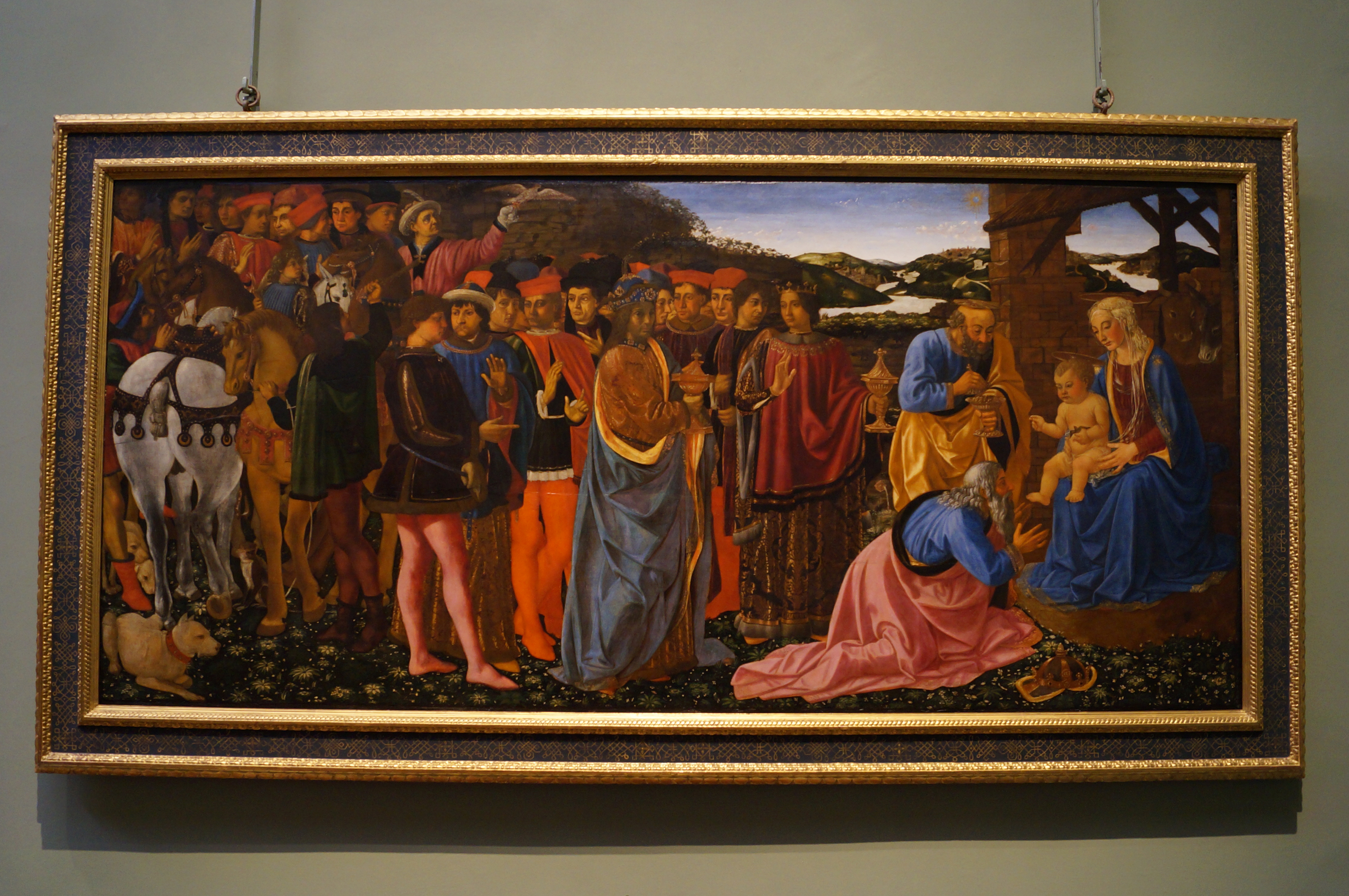 Козимо Росселли (Cosimo Rosselli; 1439 - 1507) был художником-флорентийцем итальянцев Кватроченто, который обучался у Нери ди Бичи (Neri di Bicci, 1419-1492). Он написал для церквей во Флоренции, Лукке и Фьезоле. В 1480 году он был среди группы художников, приглашенных Папой Сикстом IV (1414-1484) для работы над фресками в Сикстинской капелле. У Росселли были два видных ученика и помощники: Пьеро ди Козимо (1462-1522) и Фра Бартоломео (1472-1517). Происхождение картины "Поклонение волхвов" неизвестно, хотя присутствие семейного герба Медичи с перьями и бриллиант, украшающий убор лошади на левом переднем плане, может указывать на связь с семьей. Возможно, полотно было написано для конгрегации волхвов, прикрепленной к монастырю Сан-Марко, который находился под патронажем Медичи. Картина содержит множество портретов, хотя, к сожалению, ни один из них не был идентифицирован с какой-либо определенностью.