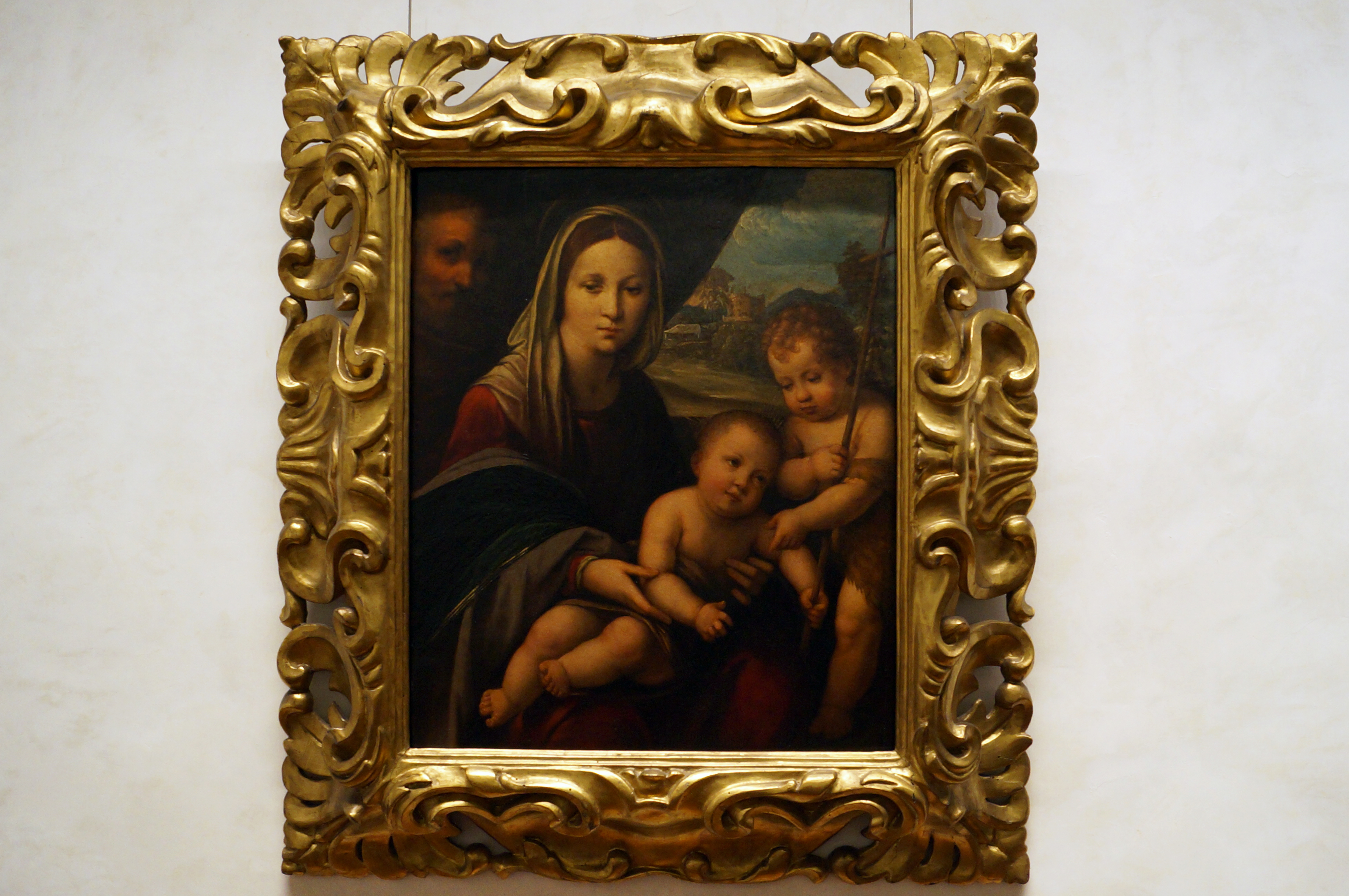 Написанная ок. 1505 – 1510 гг., картина "Святое семейство с юным Св. Иоанном Крестителем" поступила в Уффици в 1925 году из Палаццо Питти. Её автор – живописец Никколо Пизано (Niccolo di Bartolomeo dell'Abbrugia, прозванный Niccolo 'Pisano; 1470 – 1537). Никколо Пизано провел большую часть своей жизни в Ферраре, региона Эмилия-Романья, и разделил своё имя с великим скульптором XIII века. Художник Пизано стал известен, когда работал в соборе Феррары над заказом герцога Альфонсо I д'Эсте в 1499 году. В этом городе он также написал Мадонну на троне с ангелами и святыми. В период Феррара Пизано сотрудничал с Лоренцо Коста (1460 – 1535) и Никколо Россетти. В Болонье Пизано создал несколько крупных алтарей. Одни из первых его работы задокументированы в Пизе; среди них есть алтарь Мадонны, возведенный на престол с ангелами и святыми, с пределлами, изображающими "Поклонение волхвов" и "Убийство невинных". Картина Святого Семейства показывает интерес Никколо к классицистическим моделям, популярным в районе долины реки По, и стилистическому подходу, близкому к искусству Феррарезе Гарофало Ортолано. Художник также развил влияние Рафаэля, что заметно в работах, сделанных около Болоньи, "Снятие с креста" и "Мадонна с Младенцем", музицирующие ангелы на облаках и святые Джованни Евангелиста, Элеутропио и Петронио. Некоторые из его последних работ, таких как "Кара сыновей Аарона", были завершены в соборе города Пиза около 1537 года. Никколо Пизано не возвращался в свой родной город до самой смерти, примерно в 1537 году.