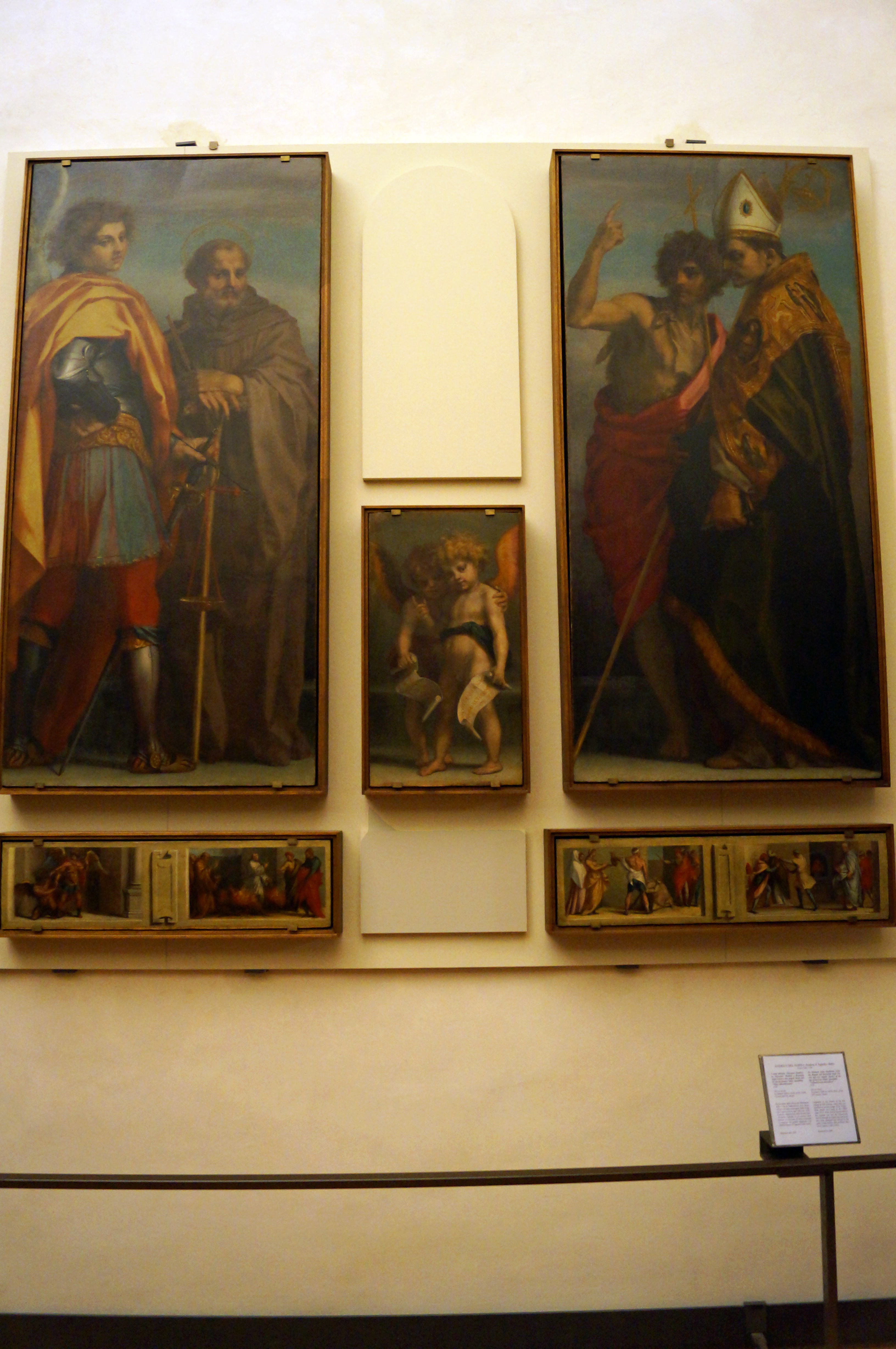 Итальянский художник Андреа дель Сарто (Andrea del sarto), прозванный Андреа д’Аньоло (Andrea d'Agnolo, 1486 – 1530), написал ок. 1528 года панели с изображением святых Михаила, Иоанна Гуальберт, Иоанна Крестителя, Бернардо дельи Уберти и двух Ангелов к полиптиху церкви монастыря Валломброза, которыми окружил образ Богородицы. Пределлы полиптиха, соданные для "Аалтаря Валломбросана", рассказывают Истории о жизни четырех святых. Панели хранятся в Уффици с 1919 года. Их нынешний макет следует оригинальному, а рамки, известные благодаря гравировке, были, вероятно, спроектированы и вырезаны великим резчиком и архитектором Баччо д'Анноло (Baccio d'Agnolo; 1462 – 1543). Андреа дель Сарто был одним из самых известных художников Высокого Возрождения. Его ярко выраженная цветовая палитра непревзойдённа в флорентийской живописи. Несмотря на то, что при жизни он был высоко оценен как artisat senza errori ("без ошибок"), после безвременной смерти его слава затмилась успехами современников Леонардо да Винчи, Микеланджело и Рафаэля. Работая в Риме вместе Микеланджело и Рафаэлем, Андреа дель Сарто стал ведущим художником во Флоренции после смерти Фра Бартоломмео в 1517 году, а с помощью своих учеников Россо Фьорентино (Rosso Fiorentino) и Якопо Понтормо (Jacopo da Pontormo) оказал формирующее влияние на развитие маньеризма. Андреа родился во Флоренции 16 июля 1486 года. Он был сыном портного Аньоло ди Франческо (Agnolo di Francesco), отсюда и имя Сарто (портной). По словам Вазари, который был учеником Андреа, он обучался у ювелира с 7 лет. В более раннем источнике от Рафаэллино дель Гарбо (Rafaellino del Garbo) Андреа характеризуется весьма убедительно, как большой и успешный художник конца XV века. Примерно в возрасте 20 лет Андреа вместе с Франчабиджо (Franciabigio; 1482 – 1525) создал мастерскую, хотя он не зачислялся в гильдию живописцев до 11 декабря 1508 года. Андреа был добрым, непритязательным человеком с высокими художественными стандартами и глубоким пониманием человечества. Он был по-настоящему благочестивым, иногда работая за номинальную плату или, как в случае с Мадонной дель Сакко (SS. Annunziata, 1525), полностью отказался от своего вознаграждения. Вазари интерпретирует это как робость и слабость, но более вероятно, что Андреа, которого покровительствовал Папа и король Франции, был достаточно процветающим, чтобы позволить себе такую щедрость. Популярность Сарто в XVI веке наглядно доказана "выживанием" огромного количества экземпляров его картин. Обычно вспоминаемый как Андреино, он был невысокго роста, как это заметно в автопортрете в "Путешествии волхвов" (SS Annunziata).