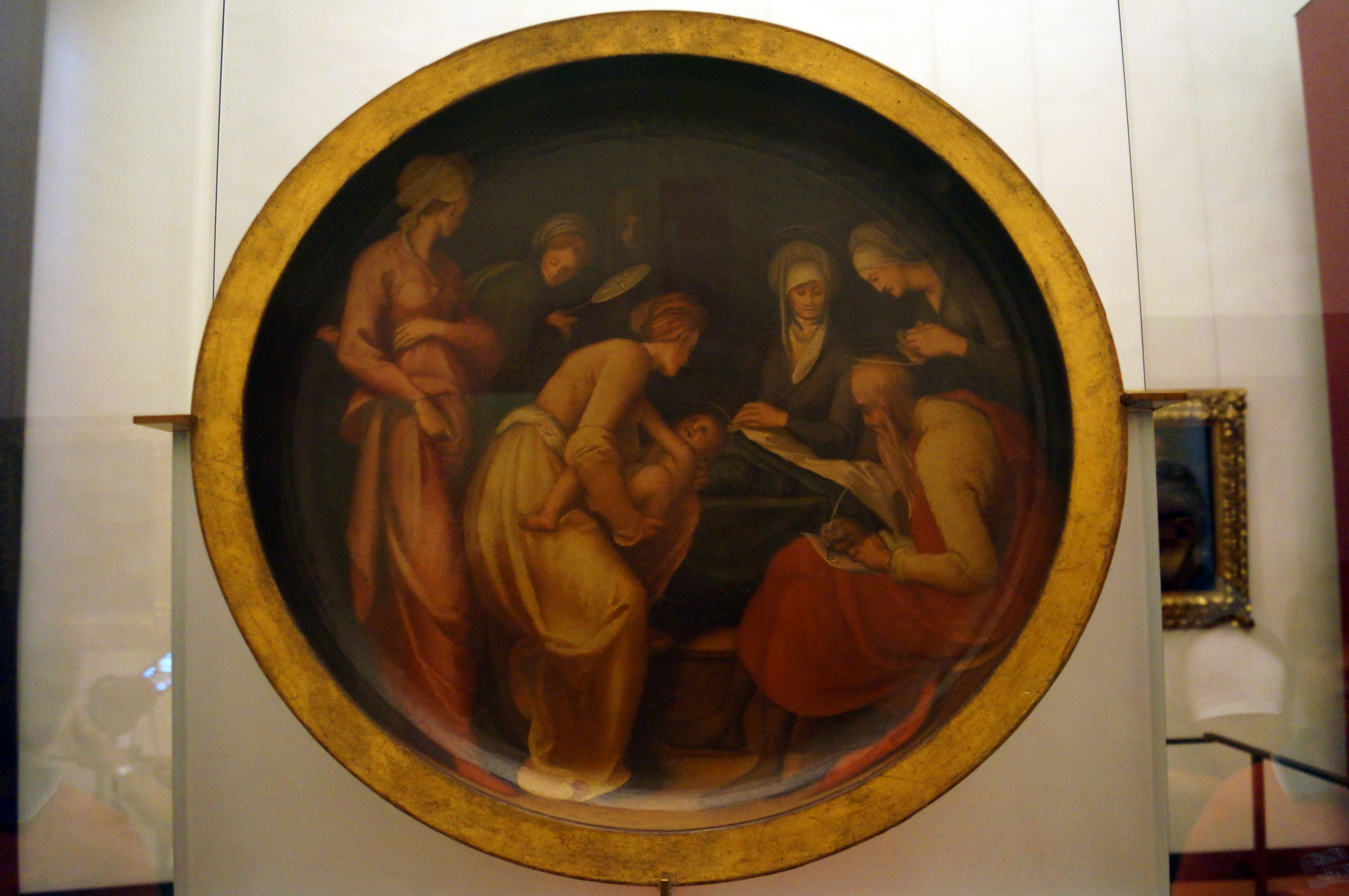 Тондо "Рождение святого Иоанна Крестителя" создал ок. 1526 флорентийский художник Якопо Каруччи (Jacopo Carrucci) по прозвищу Понтормо (Pontormo; 1494 – 1556). Прозвище происходит от деревушки Эмполи (Понторм), в которой он родился 24 мая 1494 года в семье художника по имени Бартоломео (Bartolomeo), а его мать звали Алессандра ди Паскуале (Alessandra di Pasquale). Отец умер в 1499 году, а свою мать он потерял в 1504 году. Оставшись сиротой, Понтормо уезжает во Флоренцию в 1503 году. Первое образование флорентийскому искусству молодой художник получил в мастерской Леонардо да Винчи. Затем работал у Мариотто Альбертинелли, Пьеро ди Козимо и Андреа дель Сарто. Якопо да Понтормо оказал большое влияние на развитие маньеризма и стал предтечей позднего барокко XVI века. Он предложил своим современникам противоречивую и странную живопись, противоположную искусству эпохи Возрождения, но в то же время свободную и современную. Его меланхоличные и одинокие, а также невротические, беспокойные, независимые образы вошли в историю искусства. Картина "Рождение святого Иоанна Крестителя" стилистически близка фрескам Понтормо, вдохновленного немецкой школой, в церкви Св. Лоренцо во Флоренции и вызывает архаичное чувство изображением специального лотка, предназначенного женщинам при родах, что, вероятно, связано с Историей из Святого Писания и с династической приемственностью семьи.