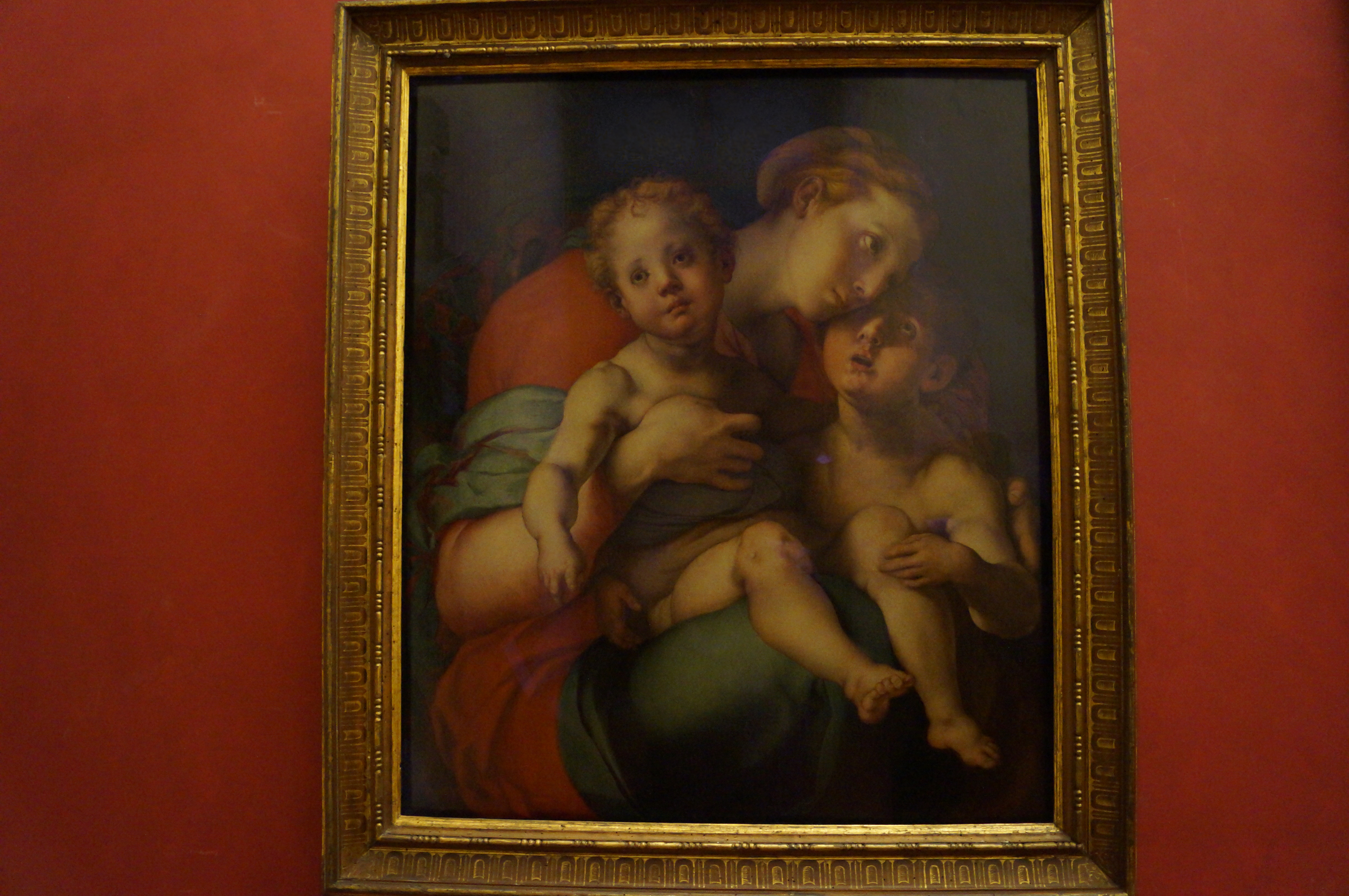 Франческо Маццола (Francesco Maria Mazzola), прозванный Пармиджанино (Parmigianino). Богородица с младенцем. 1525-1530. Масло на доске. Тема молящейся Девы Марии рядом со своим Сыном касается не только детства Иисуса, но и предсказывает через несколько символов его трагическую судьбу в зрелом возрасте. Голубь олицетворяет чистоту, а книги содержат христианские тексты. Стол, покрытый пеленой, напоминает камень, на котором лежало мертвое тело Христа перед погребением. Пармиджанино глубоко вдохновлен живописью Рафаэля, которую он тщательно изучал во время своего пребывания в Риме, примерно с 1522 по 1527 год.