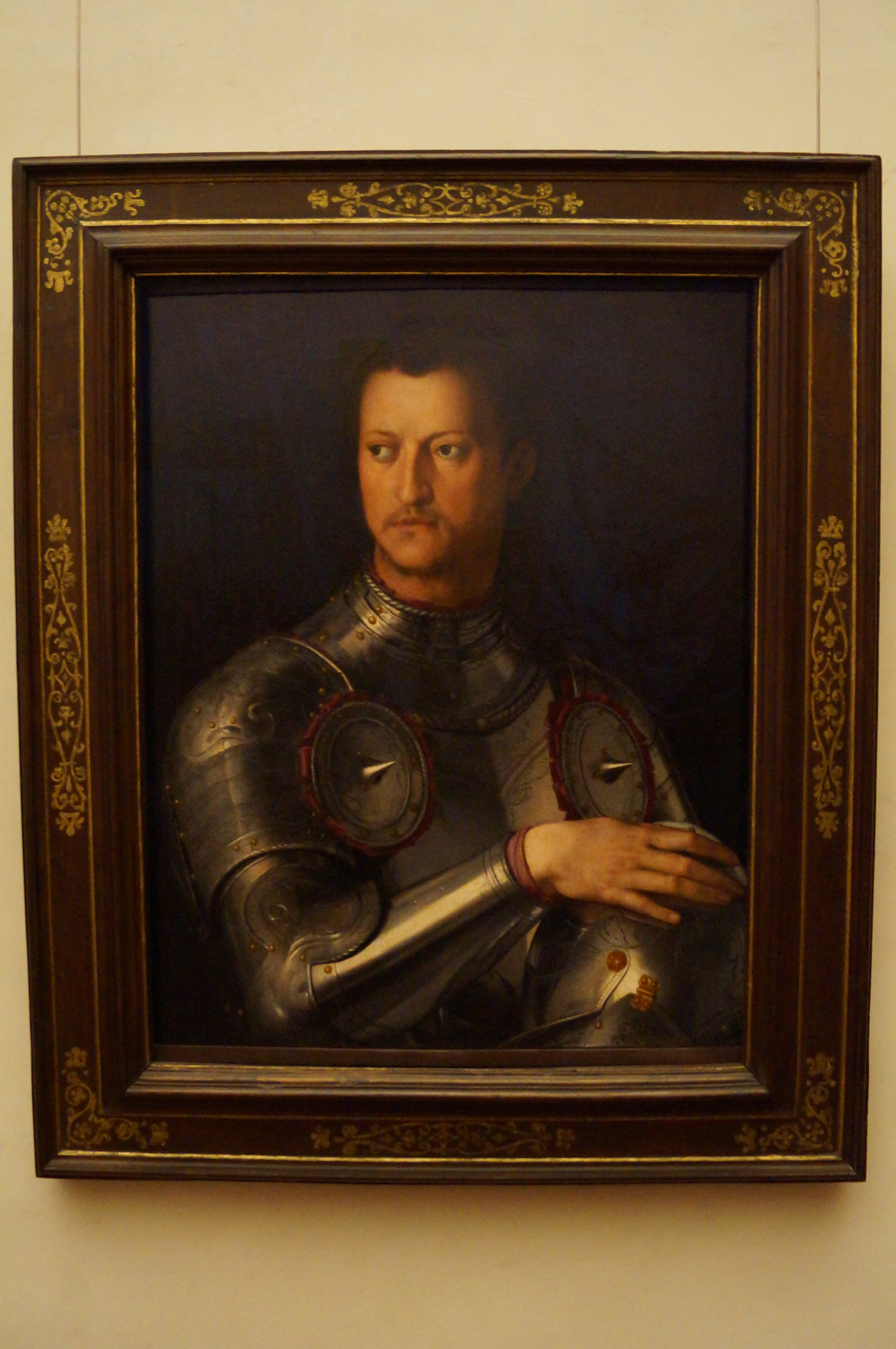 Портрет девушки с книгой Бронзино написал ок. 1542 – 1545 гг. Хотя часто предполагалось, что девушка с по-детски надменным выражением лица является принцессой Медичи, её личность до сих пор не ясна. Однако с учётом даты картины и стилистического сходства, которое она разделяет с портретами Биа Медичи, Элеоноры ди Толедо и её сына Джованни, вполне вероятно, что натурщица – Юлия Медичи..Юлия родилась в 1535 году, была дочерью герцога Алессандро, осиротела и воспитывалась вместе с детьми Козимо I. Картина экспонируется на трибуне с 1926 года. Вазари рассказывает, что Бронзино писал в 1543 – 1546 гг. портрет Козимо I с натуры и с большим усердием, изображая молодого Козимо I, "одетого в доспехи с рукой на шлеме". Картина, которую описывает Вазари, может быть отождествлена с той, на которой герцог изображён смотрящим вправо, чтобы скрыть тот факт, что он был косоглаз. Поэтому Козимо I показан без медали "Тойсон д'Ор", которую император Карл V только что даровал ему в 1546 году и которая видна в многочисленных репродукциях картины. Портрет выставлен в зале Трибуна с 1948 года.