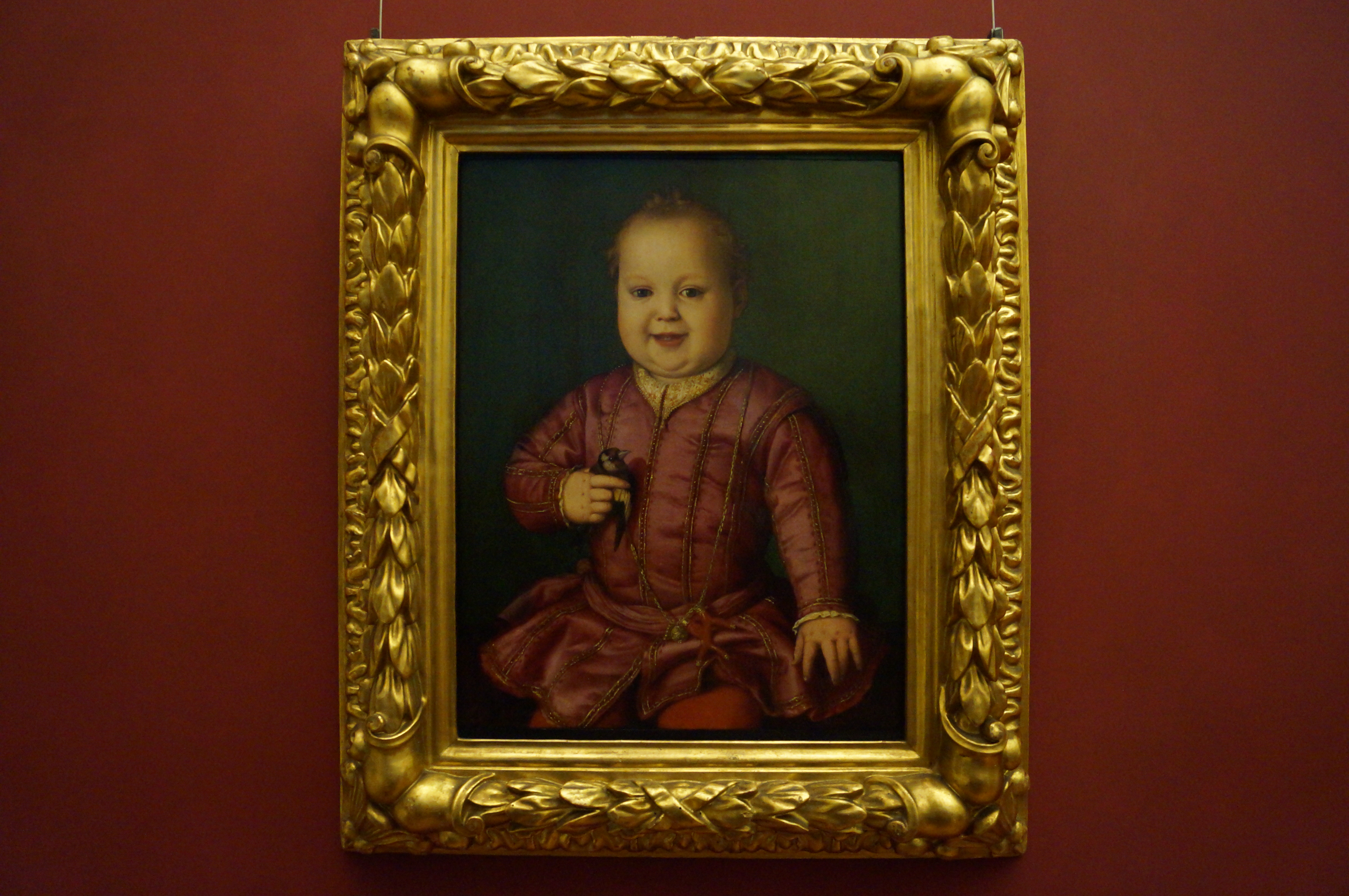 На этой живописной картине, отмеченной Вазари, изображена герцогиня Флоренция Элеонора Толедская со свои маленьким сыном Джованни. Она была написана в 1545 году учеником Понтормо и художником-портретистом двора Медичи Аньоло Тори по прозищу Бронзино (1503 – 1572). Аньоло из Флоренции был художником маньеризма. Смешивая стили позднего Высокого Ренессанса с ранним барочным периодом, маньеристы часто изображали своих подданных в неестественных формах. Работы Бронзино были описаны как "ледяные" портреты, которые ставят пропасть между субъектом и зрителем. Несмотря на официальный характер портрета из-за очень изысканной одежды и великолепием ювелирных украшений, Бронзино соединяет фигуры матери и ребенка в ласковой позе, создавая один из шедевров европейской портретной живописи XVI века. Картина находится в Зале Трибуна с 1620 года.