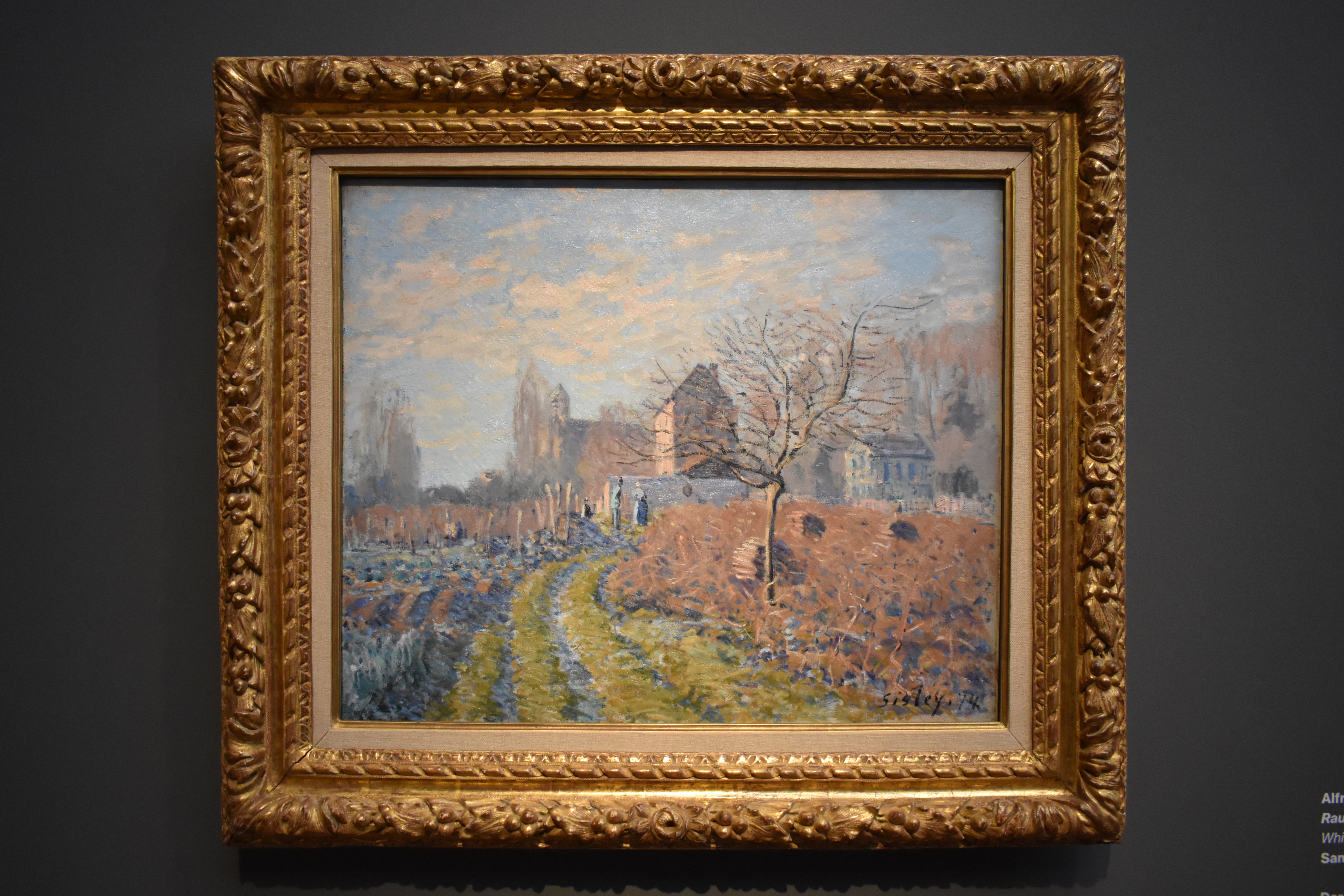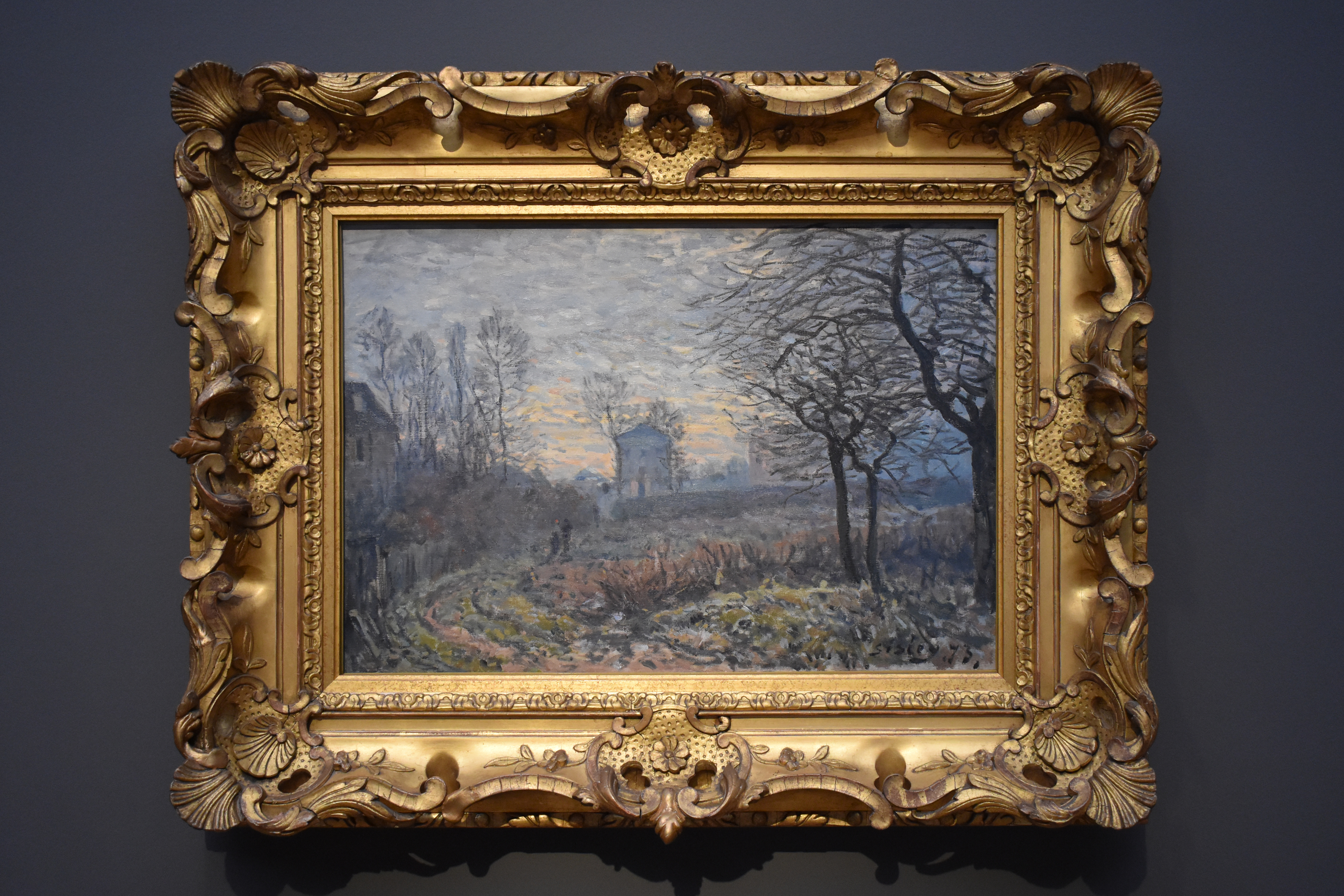 Альфред Сислей (1839-1899). Около Лувесьенна. 1873. В холодных тонах Альфред Сислей воспроизвел впечатление позднего осеннего вечера. В простом пейзаже деревни под Парижем преобладали огороды. Сислей, живший там с 1870 по 1874 год, опробовал динамичный, импрессионистский мазок на случайных мотивах.