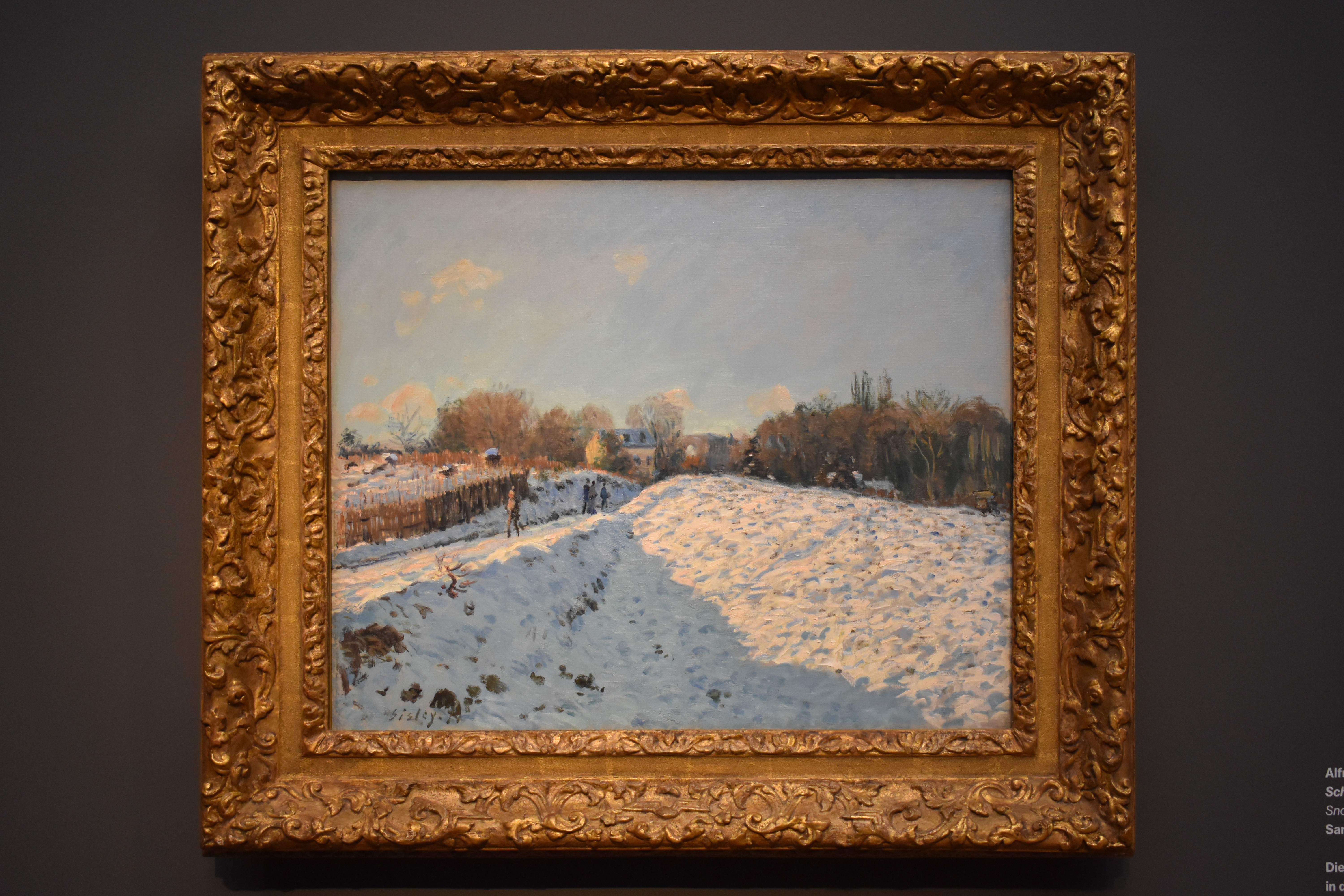 Альфред Сислей (Alfred Sisley/1839-1899). Снег в Лувесьенне. 1874 год. Эта зимняя картина была написана в 1874 году – в год, когда Альфред Сислей привлек к себе внимание своим участием в первой выставке импрессионистов в Париже. Сильные тени, отбрасываемые на переднем плане, направляют взгляд зрителя на группу гуляющих, придавая картине элемент сиюминутности.
