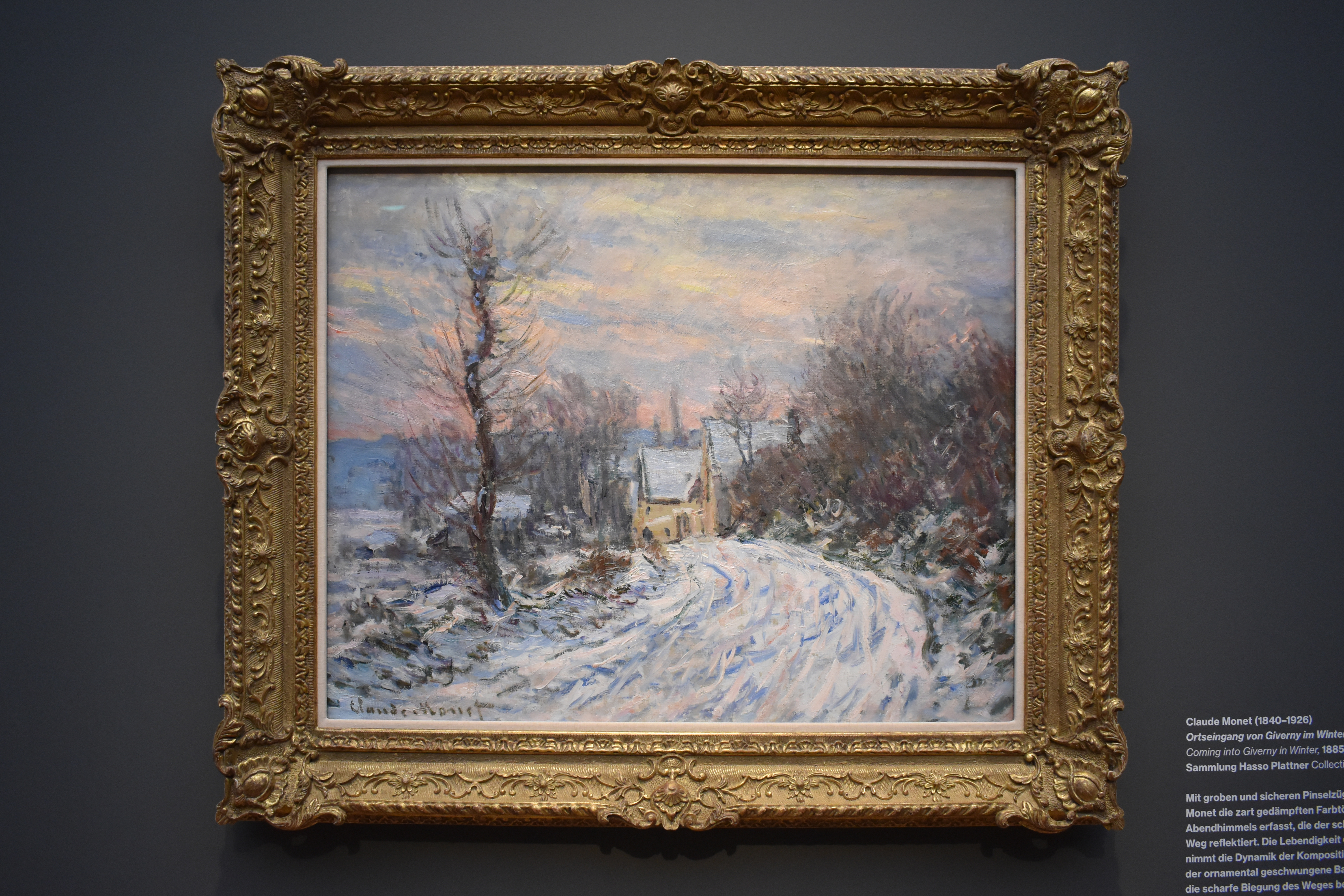 Клод Моне (Claude Monet/1840-1926). При въезде в Живерни зимой. 1885. Клод Моне передал нежные приглушенные цвета вечернего неба, которые отражаются в заснеженной дороге, используя грубые и уверенные мазки. Яркие световые эффекты подчеркивают динамику композиции, в которой доминируют декоративная форма ствола дерева и резкий изгиб дороги.