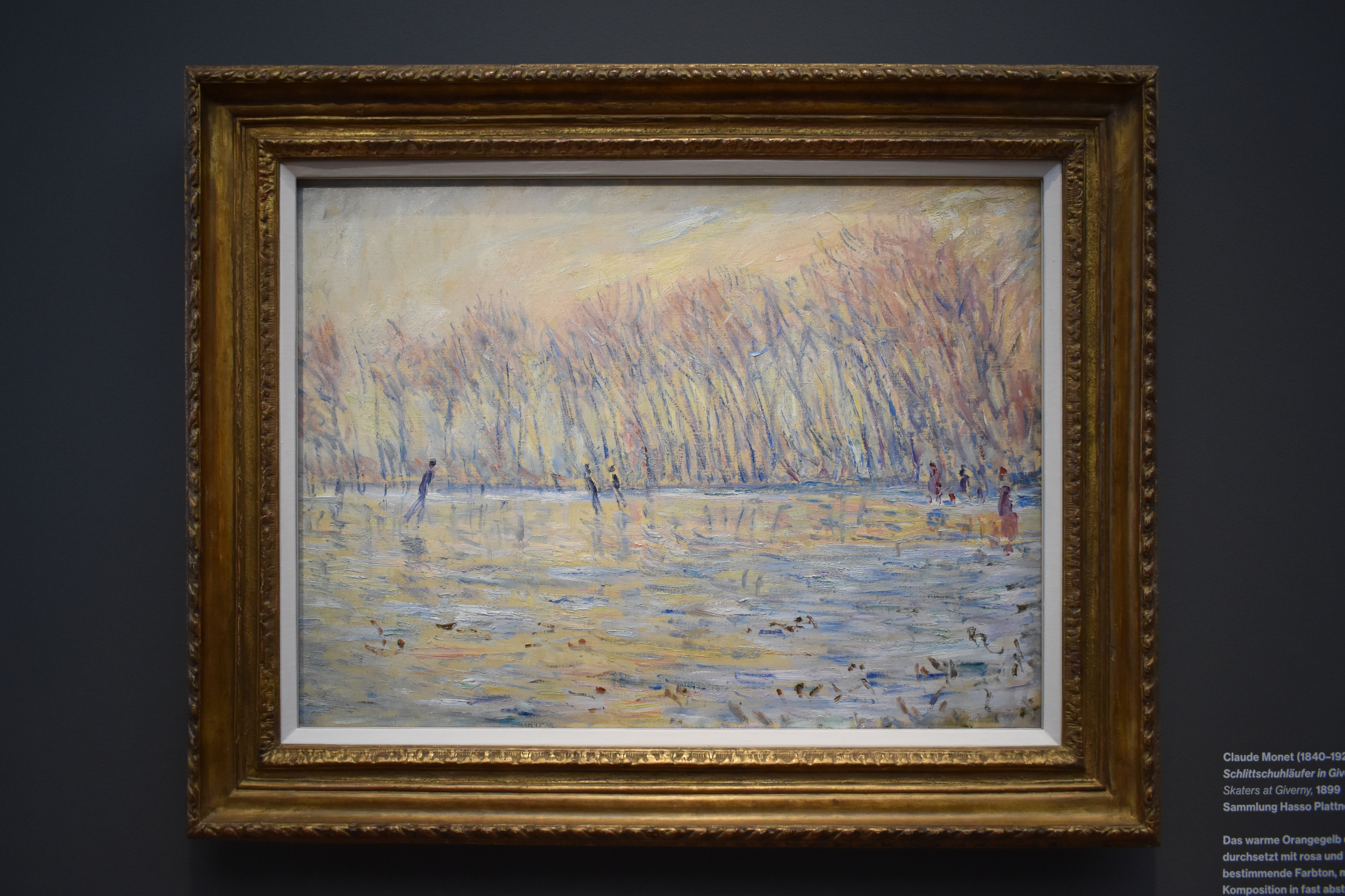 Клод Моне (Claude Monet/1840-1926). Конькобежцы в Живерни, 1899. Теплый оранжево-желтый цвет заходящего солнца, перемежающийся с розовыми и голубыми акцентами, является доминирующим оттенком, с помощью которого Клод Моне выстроил композицию в почти абстрактной манере. Движение фигуристов и наклон тополей придают картине динамизм, который контрастирует с жесткой холодностью.