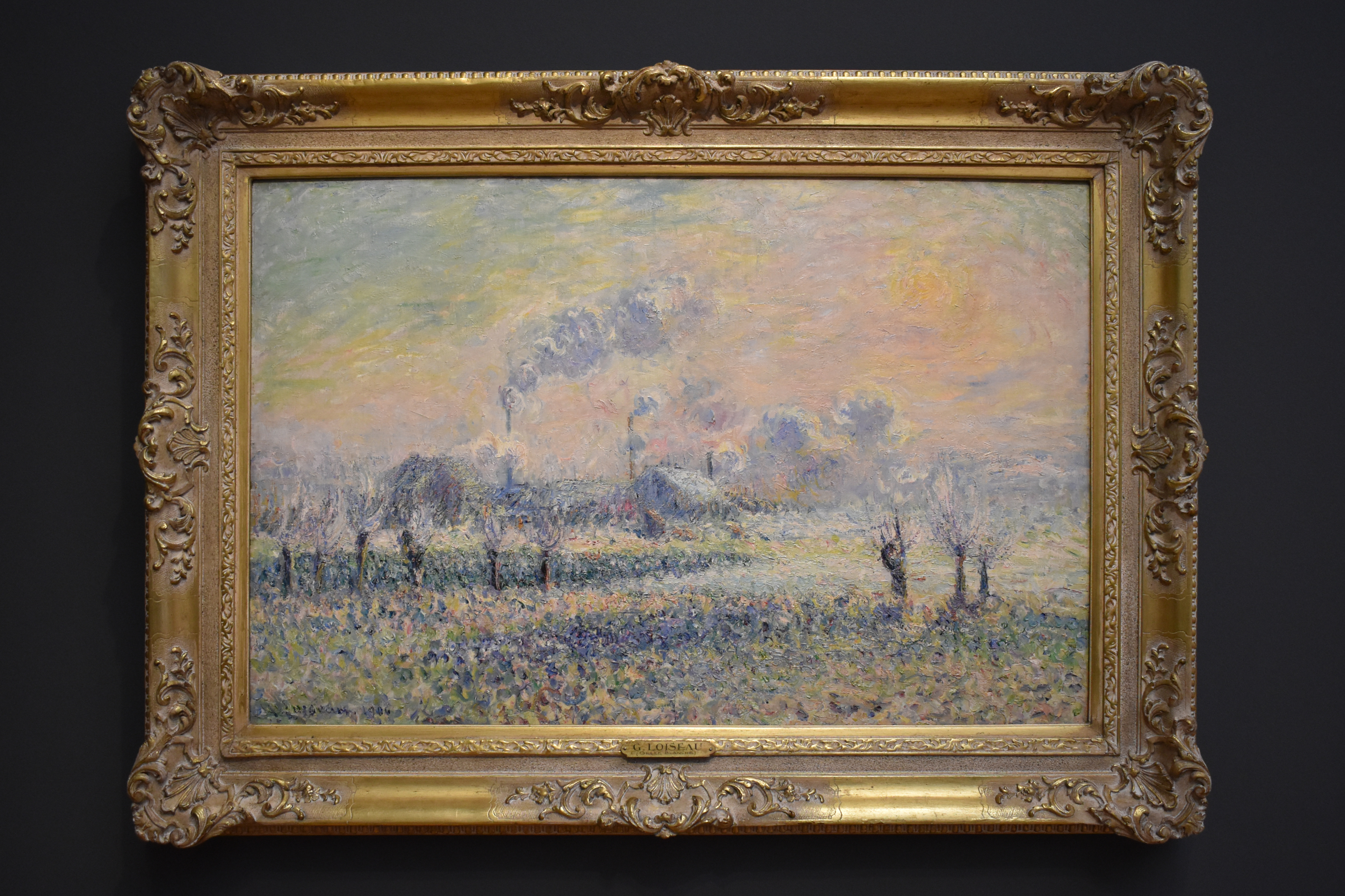 Гюстав Луазо (Gustave Loiseau/1865-1935). Иней в Понтуазе. 1906. Во многих пейзажах импрессионистов фигурируют фабричные трубы как признак современности, но редко они так заметно выделяются своими клубами дыма. Гюстав Луазо передал вид полей и деревьев, покрытых инеем, с помощью коротких мазков. Нанесение краски методом импасто воспроизводит их поверхность.