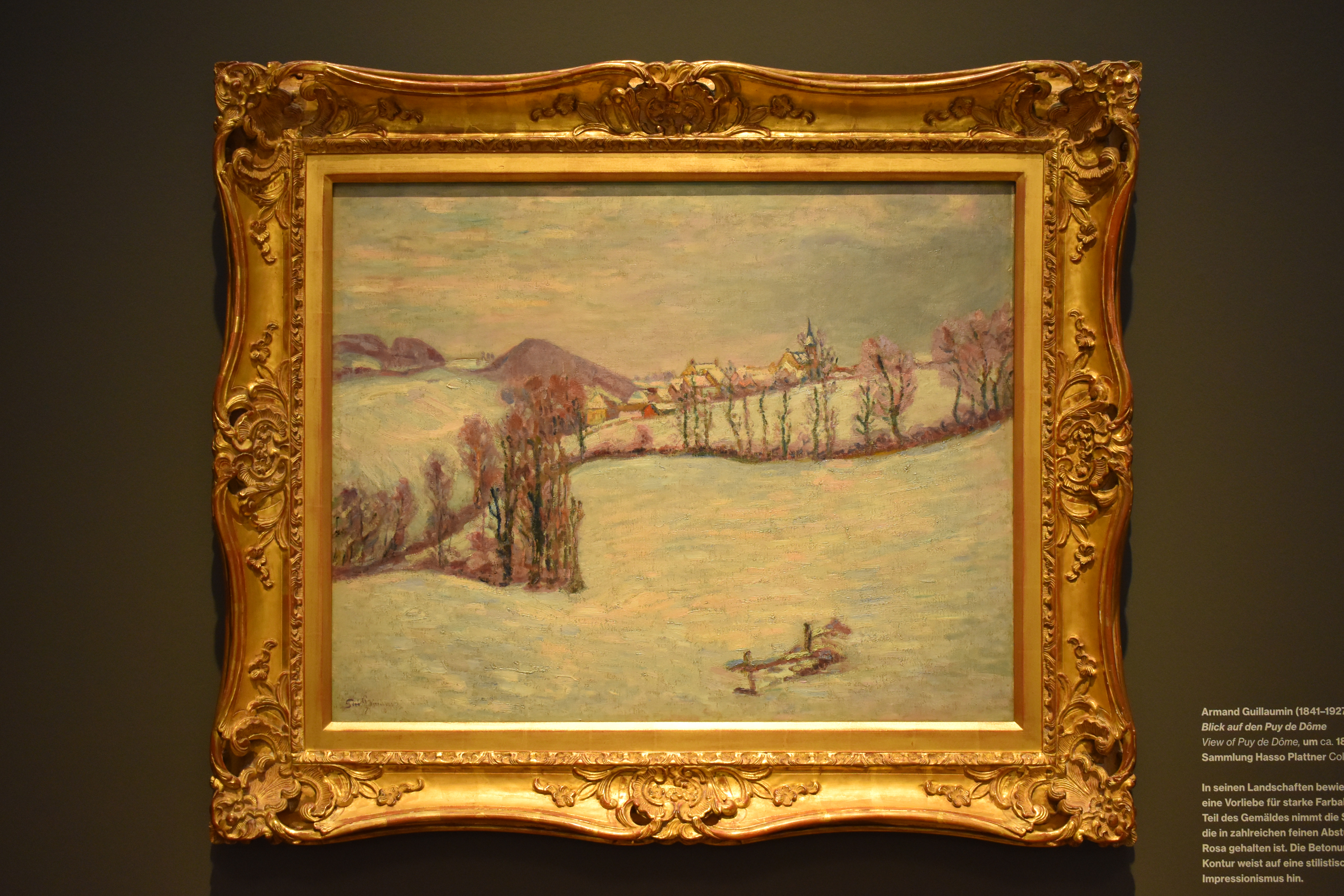 Арман Гийомен (1841-1927). Вид на Пюи-де-Дом. 1899. В своих пейзажах Арман Гийомен отдавал предпочтение сильным цветовым аккордам. Большую часть картины занимают просторы снега, изображенные в многочисленных тонких градациях голубого и розового. Акцент на поверхности и контурах указывает на стилистическое отдаление от импрессионизма.