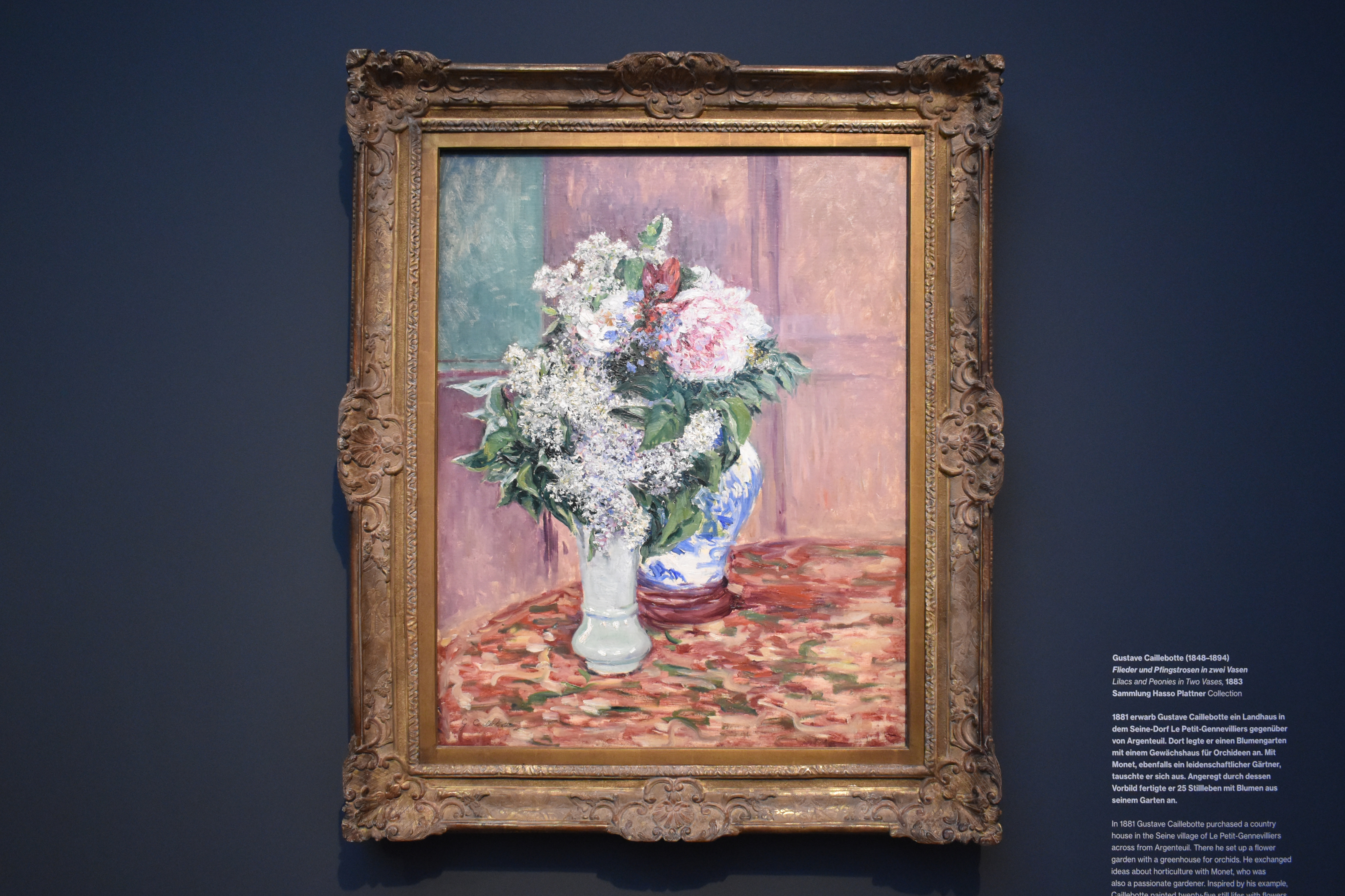Гюстав Кайботт (Gustave Caillebotte/1848-1894). Сирень и пионы в двух вазах. 1883. В 1881 году Гюстав Кайботт купил загородный дом в деревне Ле Пти-Генневилье на Сене напротив Аржантёя. Там он разбил цветочный сад с оранжереей для орхидей. Он обменивался идеями с Моне, который также был страстным садоводом. Вдохновленный примером Моне, Кайботт создал 25 натюрмортов с цветами из своего сада.