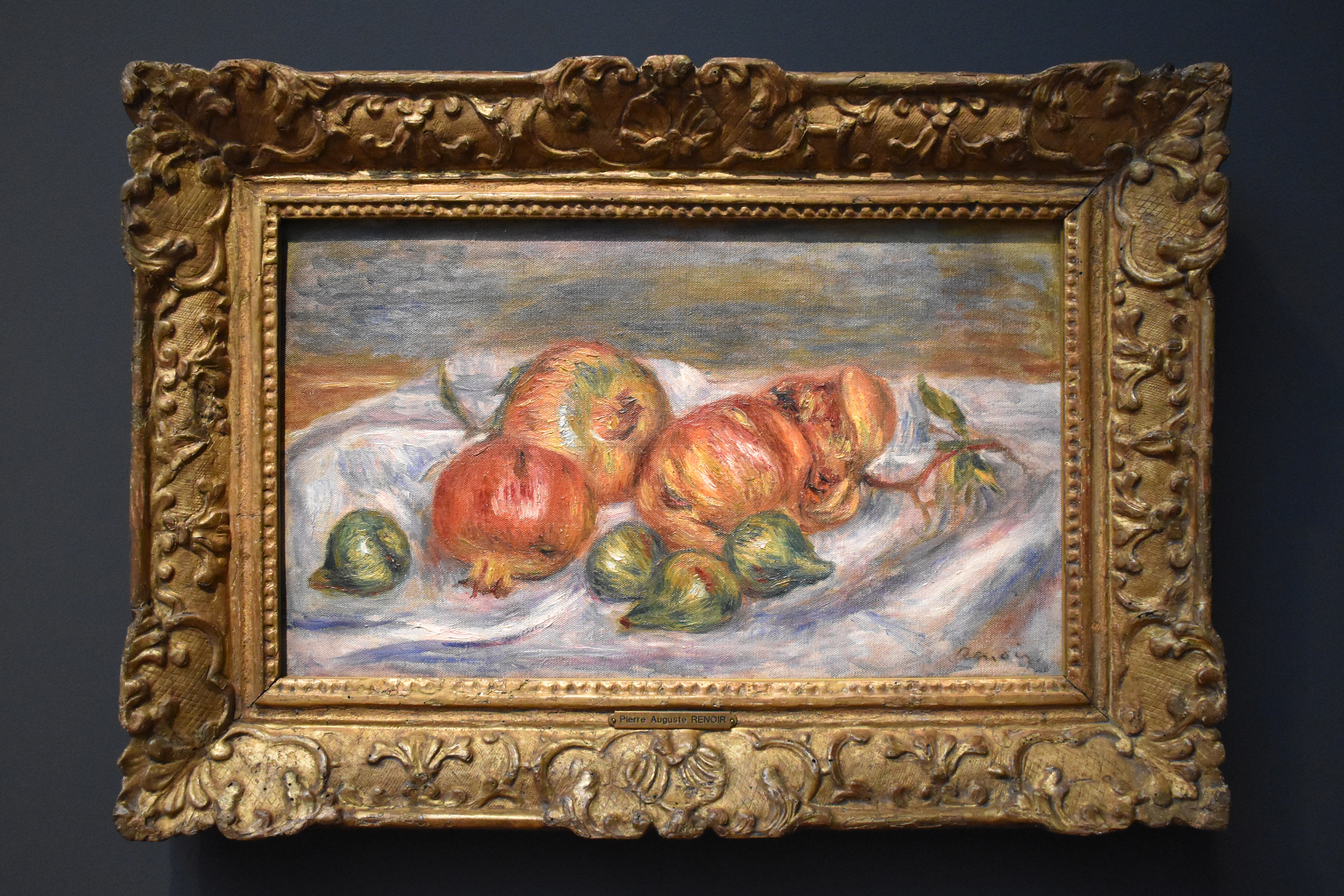 Пьер-Огюст Ренуар (Pierre-Auguste Renoir/1841-1919). Гранаты, 1913 год. Гранаты и инжир декоративно разложены на белой ткани. Контраст между дополняющими друг друга красным и зеленым цветами заставляет их сиять. Тесное живописное пространство словно пульсирует благодаря использованию динамичной кисти. Ренуар перенес опыт пленэрной живописи на все жанры: ничто не определено, и все является сенсацией.