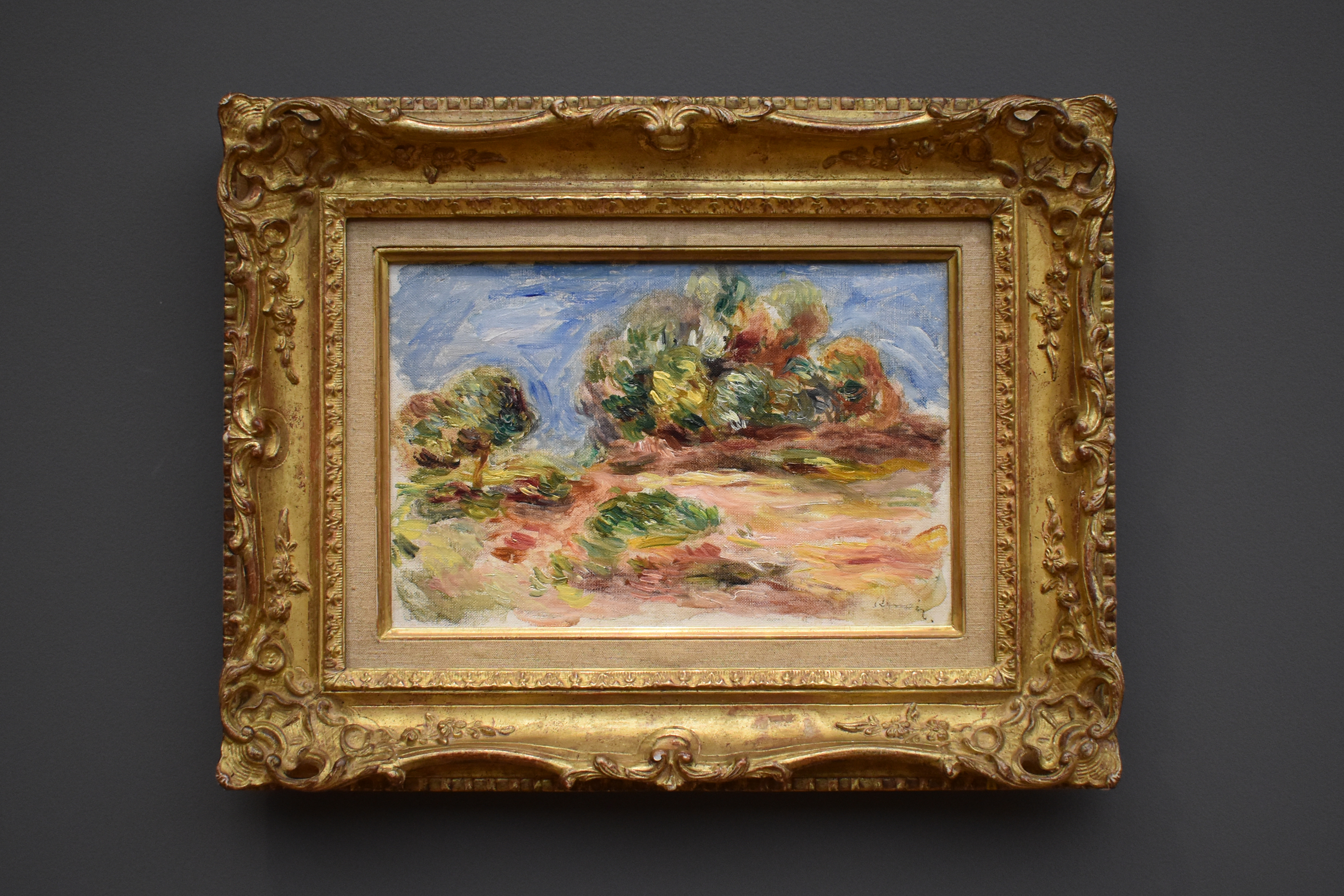 Пьер-Огюст Ренуар (Pierre-Auguste Renoir/1841-1919). Пейзаж Кань. 1900. Ренуар запечатлел окрестности своего средиземноморского дома в работе, напоминающей эскиз. В дополнение к акцентам белого и ярко-желтого цвета, грунтовка холста проявляется во многих местах, способствуя яркости сцены. Быстрая работа кистью придает неожиданно динамичную силу неброскому мотиву в этом небольшом формате.