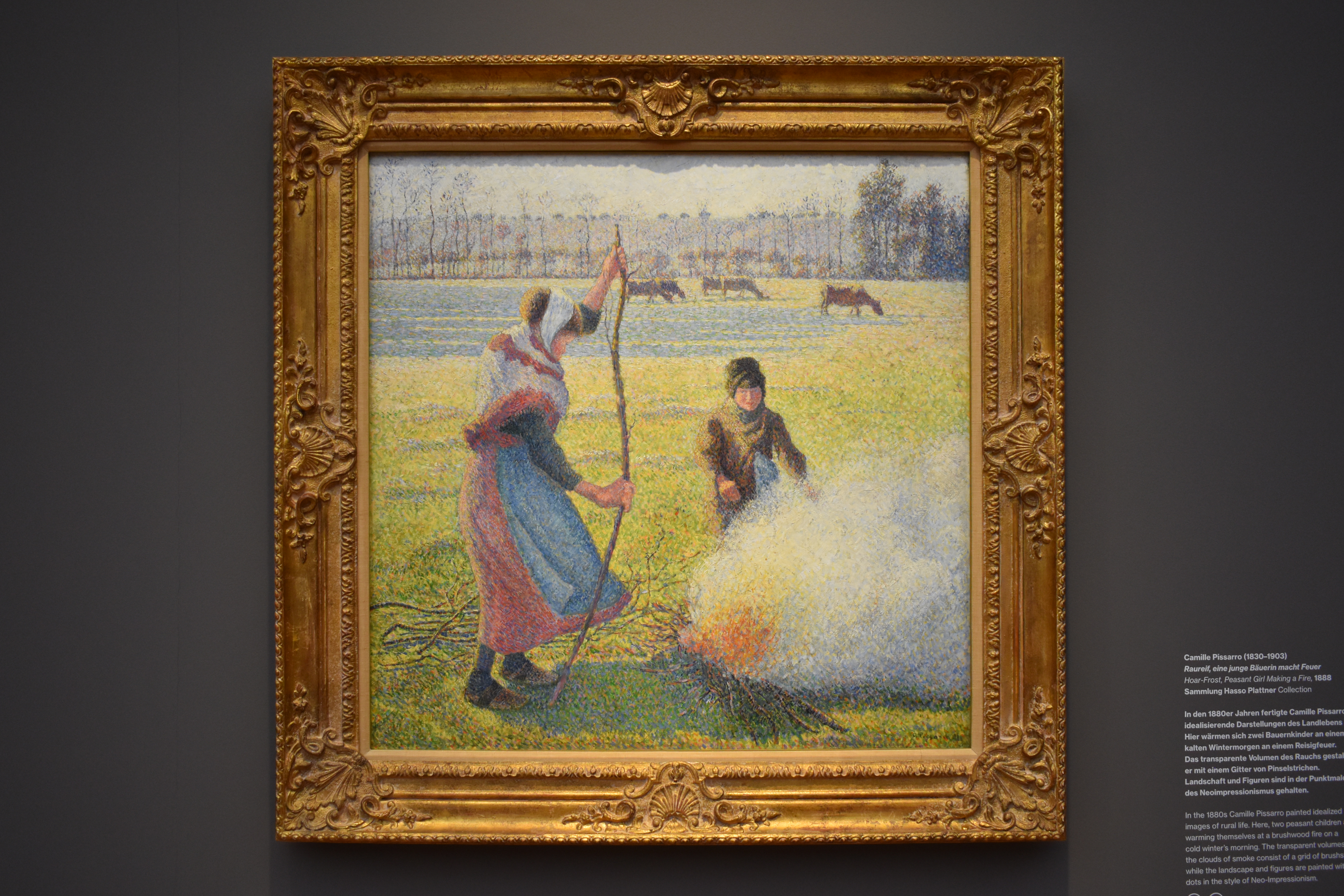 Камиль Писсарро (Camille Pissarro/1830-1903). Изморозь, крестьянская девочка разводит костёр. 1888. В 1880-х годах Камиль Писсарро писал идеализированные картины сельской жизни. Здесь двое крестьянских детей греются у костра из хвороста холодным зимним утром. Прозрачные облака дыма состоят из сетки мазков, а пейзаж и фигуры написаны точками в стиле неоимпрессионизма.