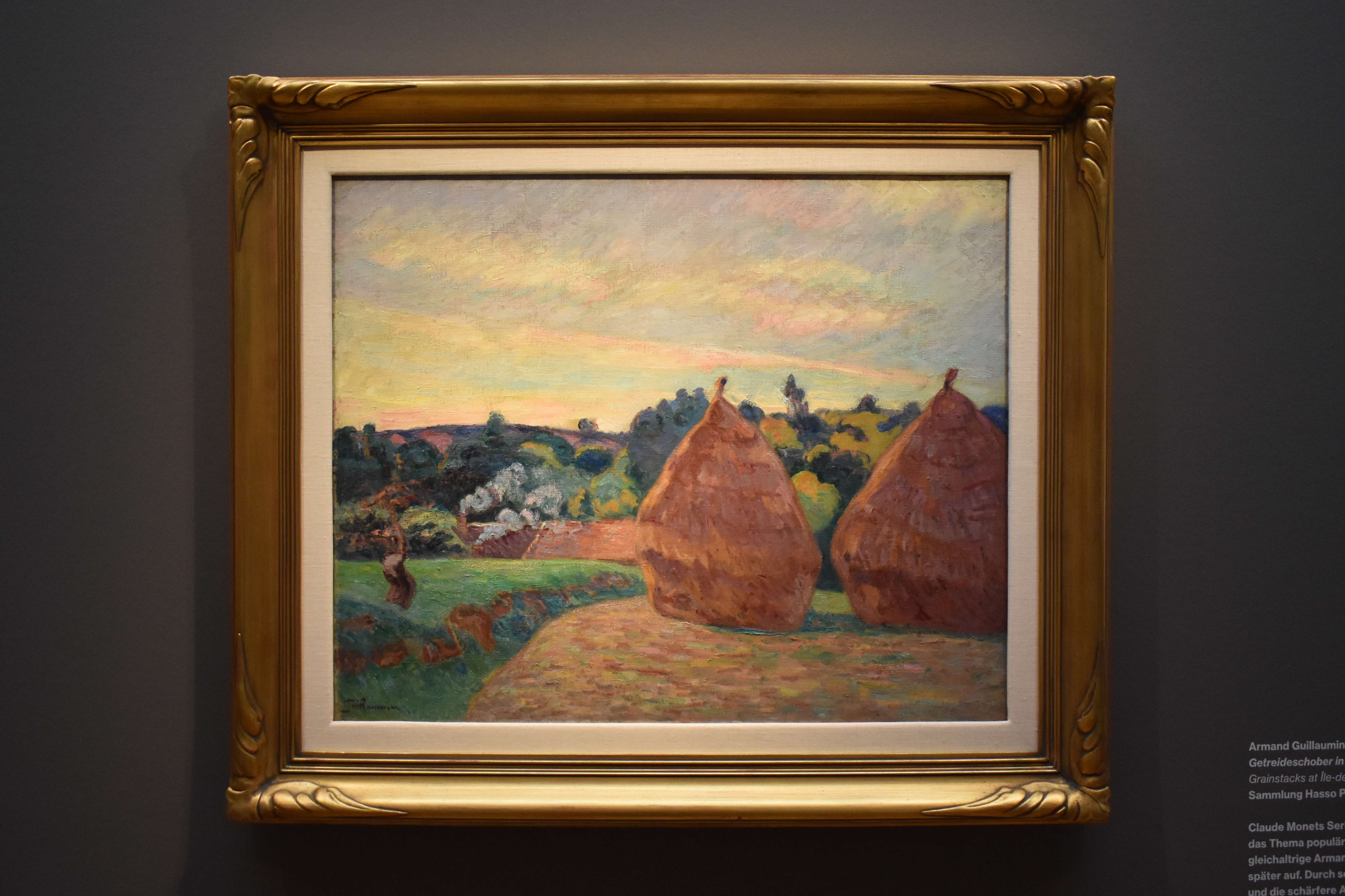 Арман Гийомен (Armand Guillaumin/1841-1927). Стога зерна в Иль-де-Франс. 1894. Серия картин Клода Моне "Стога зерна" сделала эту тему популярной. Арман Гийомен, который был примерно одного возраста со своим коллегой, вскоре сам занялся этой темой. Его интенсивное нанесение краски и более четкое определение поверхностей исключают легкость и атмосферное мерцание. Точное описание форм, таким образом, контрастирует со стилем импрессионизма.