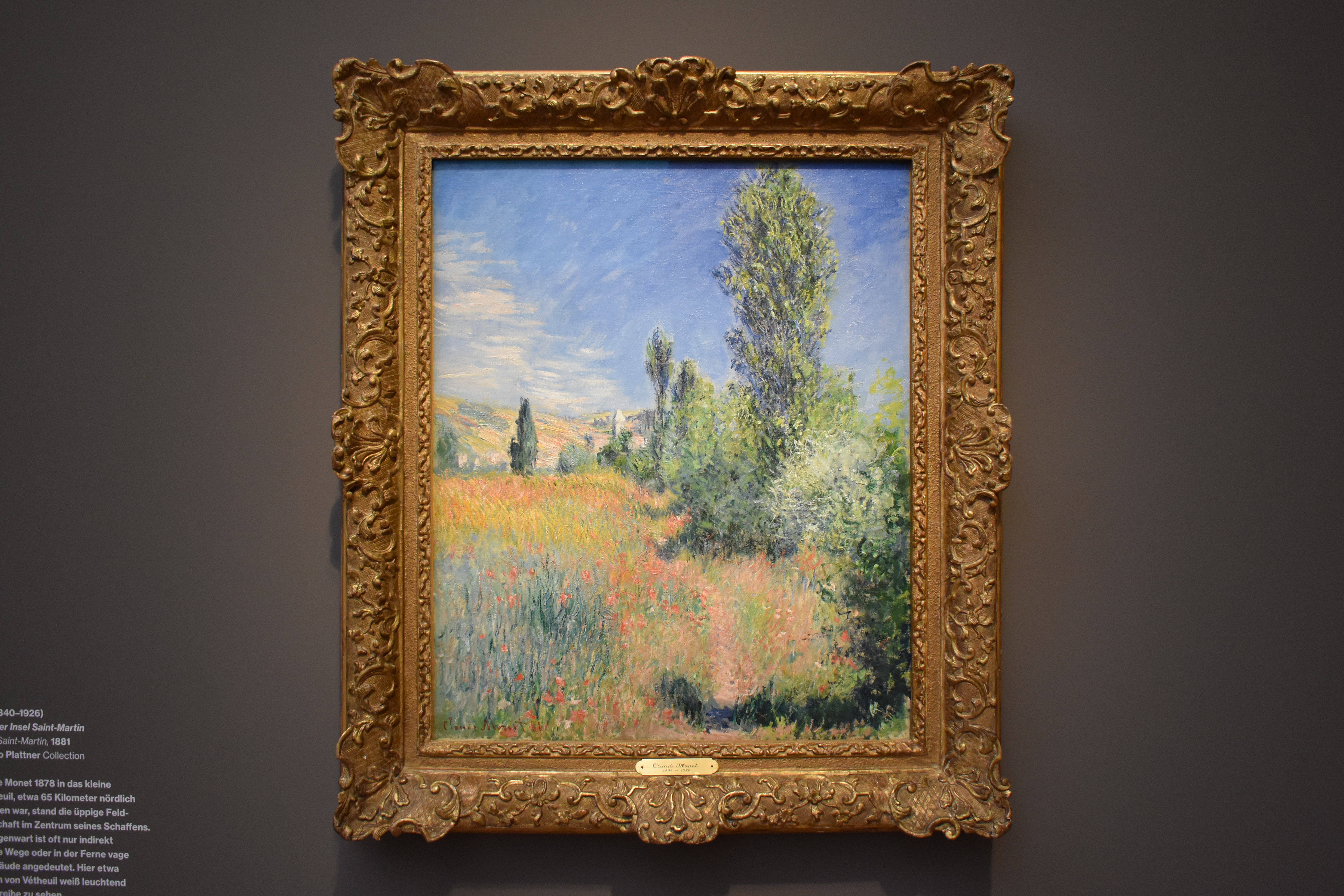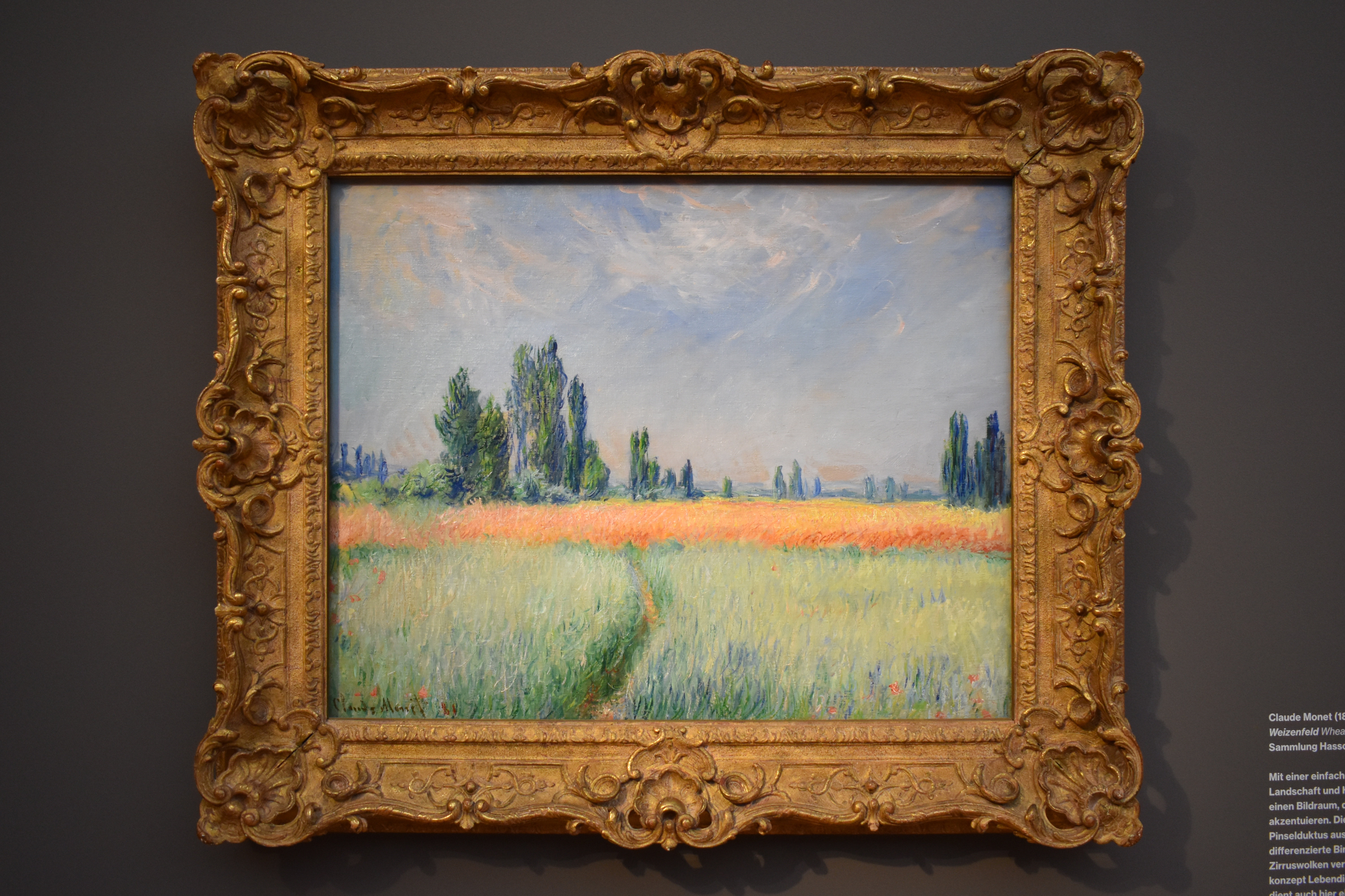 Клод Моне (Claude Monet/1840-1926). Пшеничное поле. 1881. С помощью простого горизонтального расположения пейзажа и неба Моне создал картинное пространство, которое подчеркивает группы тополей. Он закрасил поверхности нюансированной кистью. Тонкие градации цвета, сложные внутренние структуры и игра сизых облаков добавляют ощущение изобилия к общей статичной концепции. Как это часто бывает в картинах Моне, дорожка на переднем плане служит для направления взгляда в композиции.