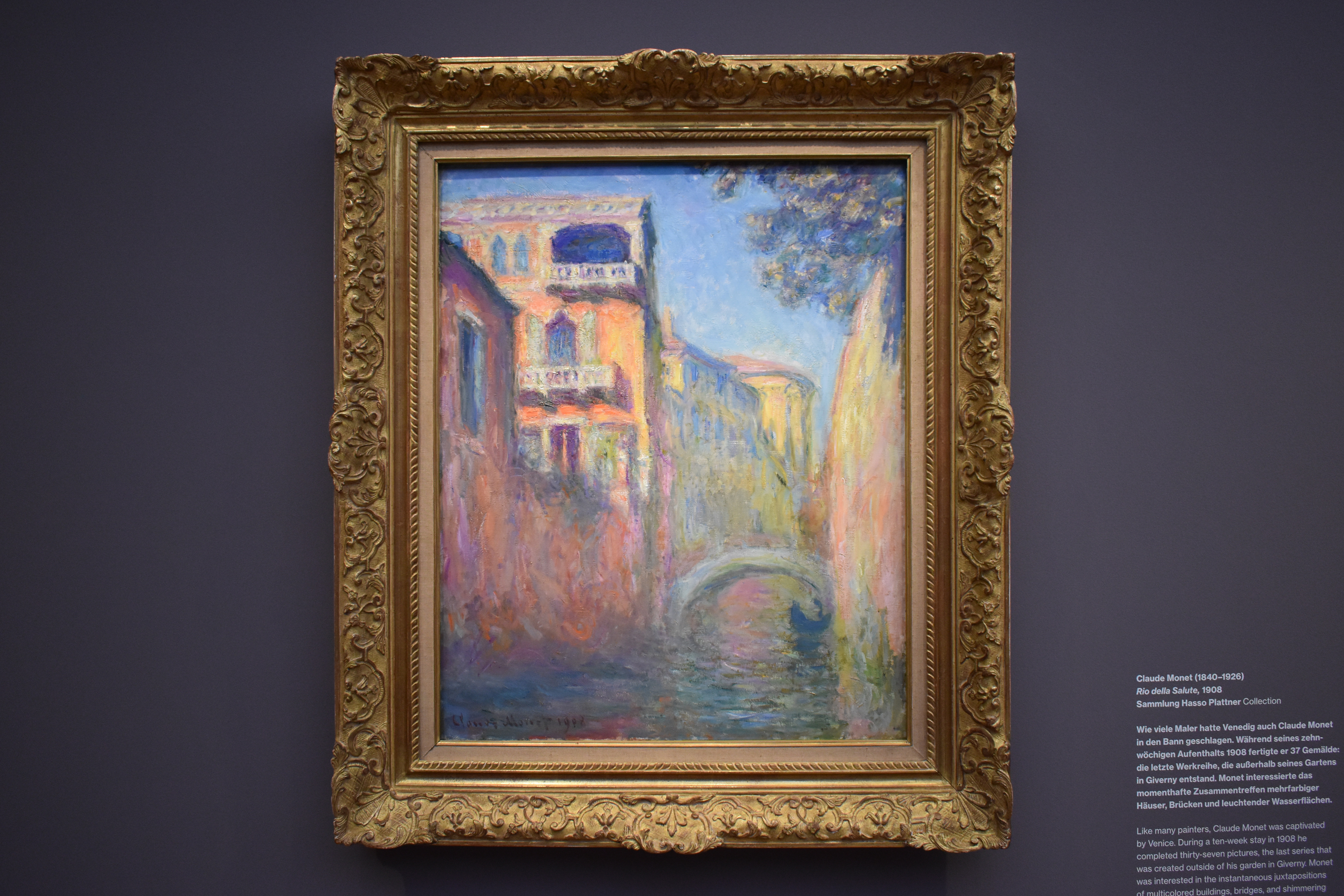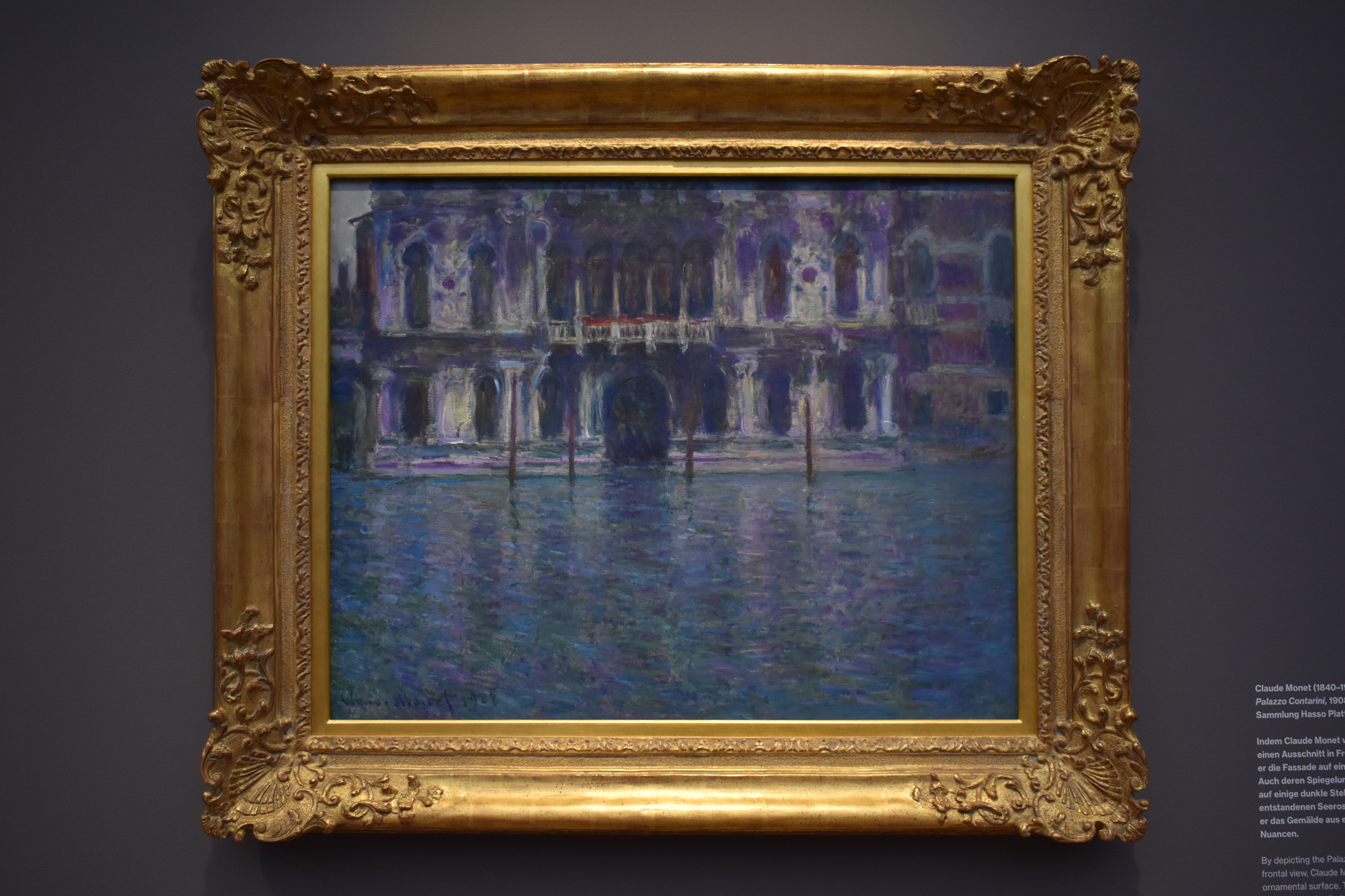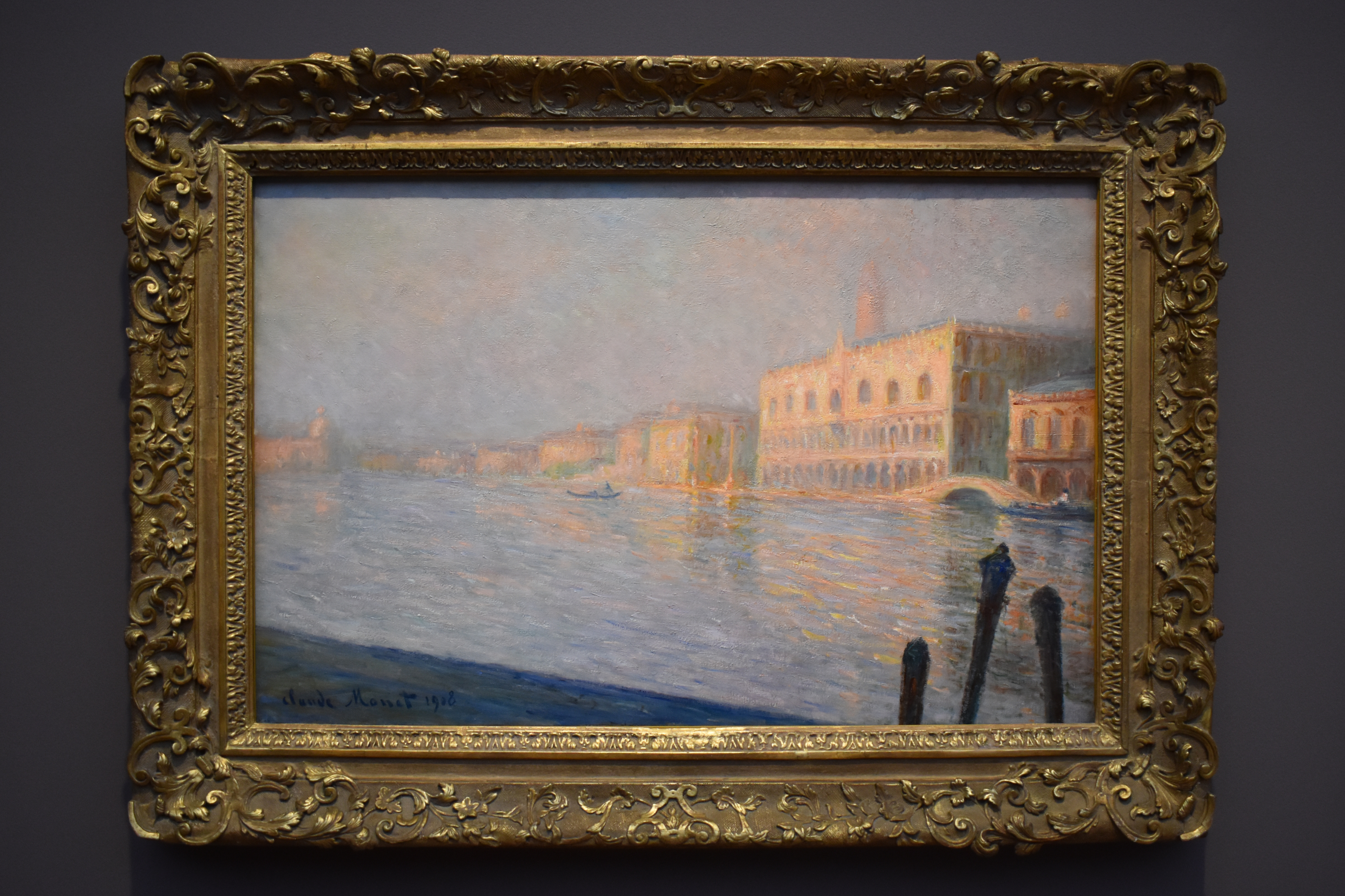 Клод Моне (Claude Monet/1840-1926). Палаццо Дукале. 1908. Контуры Дворца дожей четко очерчены, в то время как другие здания на Большом канале и Кампанила Святого Марка затянуты туманом. Причальные столбы справа, известные как пали, усиливают впечатление глубины произведения. Своими атмосферными градациями цвета пространство картины напоминает картины Уильяма Тернера, у которого Клод Моне учился в Лондоне.