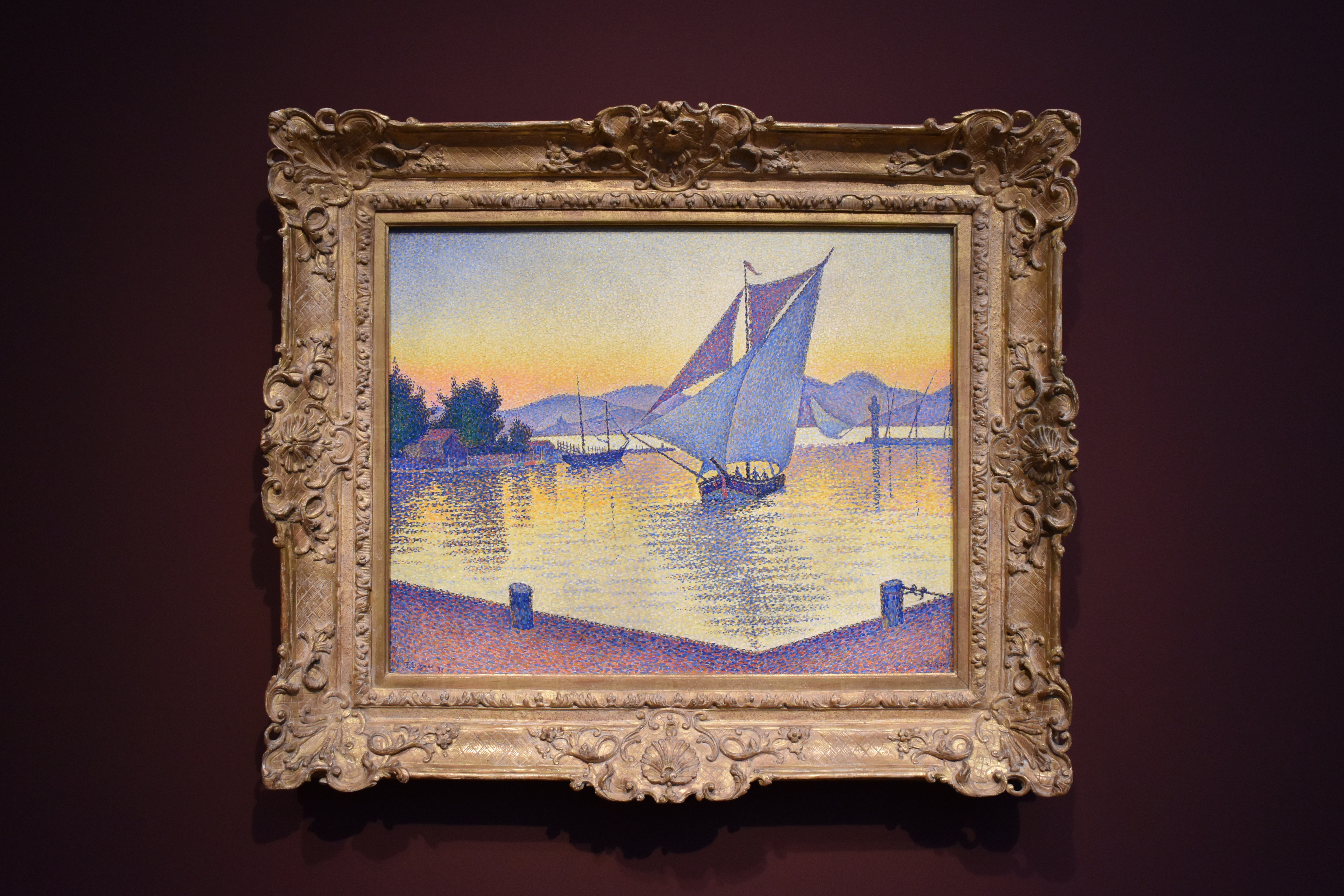 Поль Синьяк (Paul Signac/1863-1935). Порт на закате. Опус 236 (Сен-Тропе). 1892. Пейзаж южного порта изображен в вибрирующем переливе фиолетового и оранжевого цветов. Хотя солнца уже не видно, его свет пронизывает всю сцену, объединяя призматически преломленные цвета. В контрасте с фиолетовыми тенями лодок отражение солнечного света в воде создает интенсивное свечение.