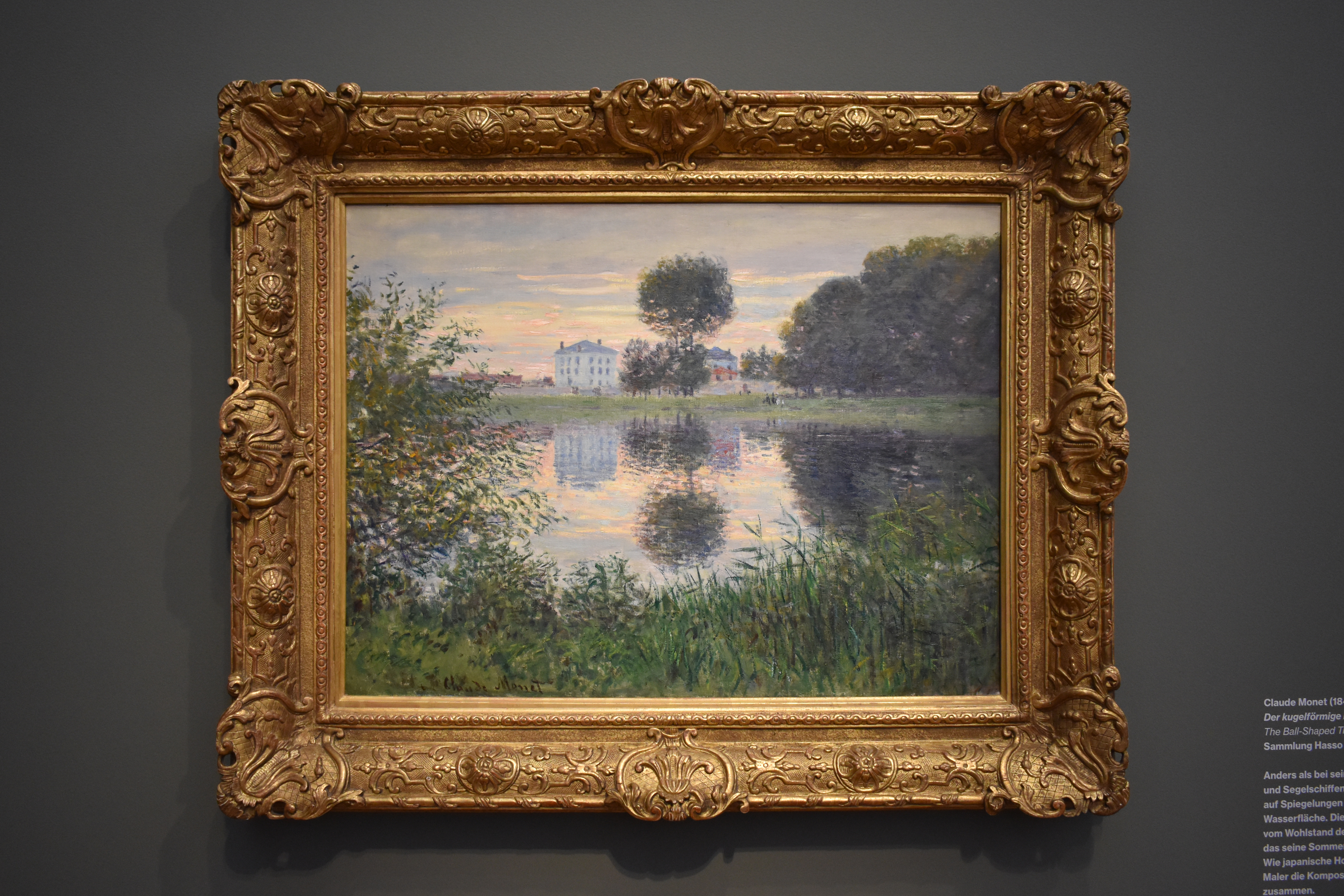 Клод Моне (Claude Monet/1840-1926). Дерево в форме шара. Аржантёй. 1876. В отличие от своих видов Сены с мостами и парусниками, здесь Моне сосредоточился на отражении домов и деревьев на поверхности воды. Величественные виллы свидетельствуют о богатстве состоятельных парижан, которые проводили свои летние каникулы в Аржентейле. Подобно японским художникам ксилографии, живописец составил композицию из параллельных полос.