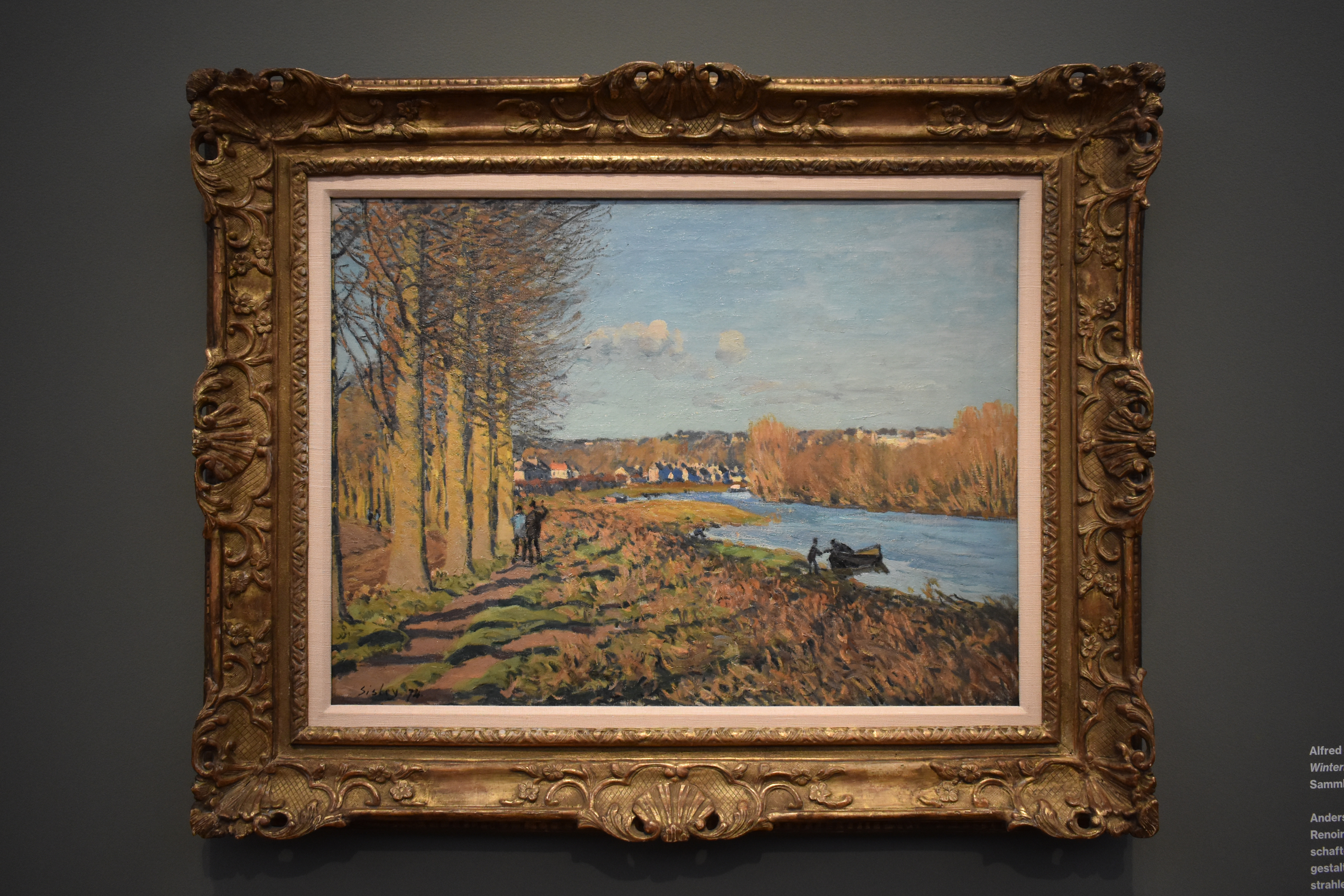 Альфред Сислей (Alfred Sisley/1839-1899). Зимнее утро. 1874. В отличие от Клода Моне и Пьера-Огюста Ренуара, Альфред Сислей писал исключительно пейзажи. Он написал эту утреннюю сцену зимой, используя яркие цвета, контрастируя ярко-синий цвет неба и реки с оранжевыми тонами кустов и деревьев. Длинные тени от тополей придают композиции ритмическое напряжение.