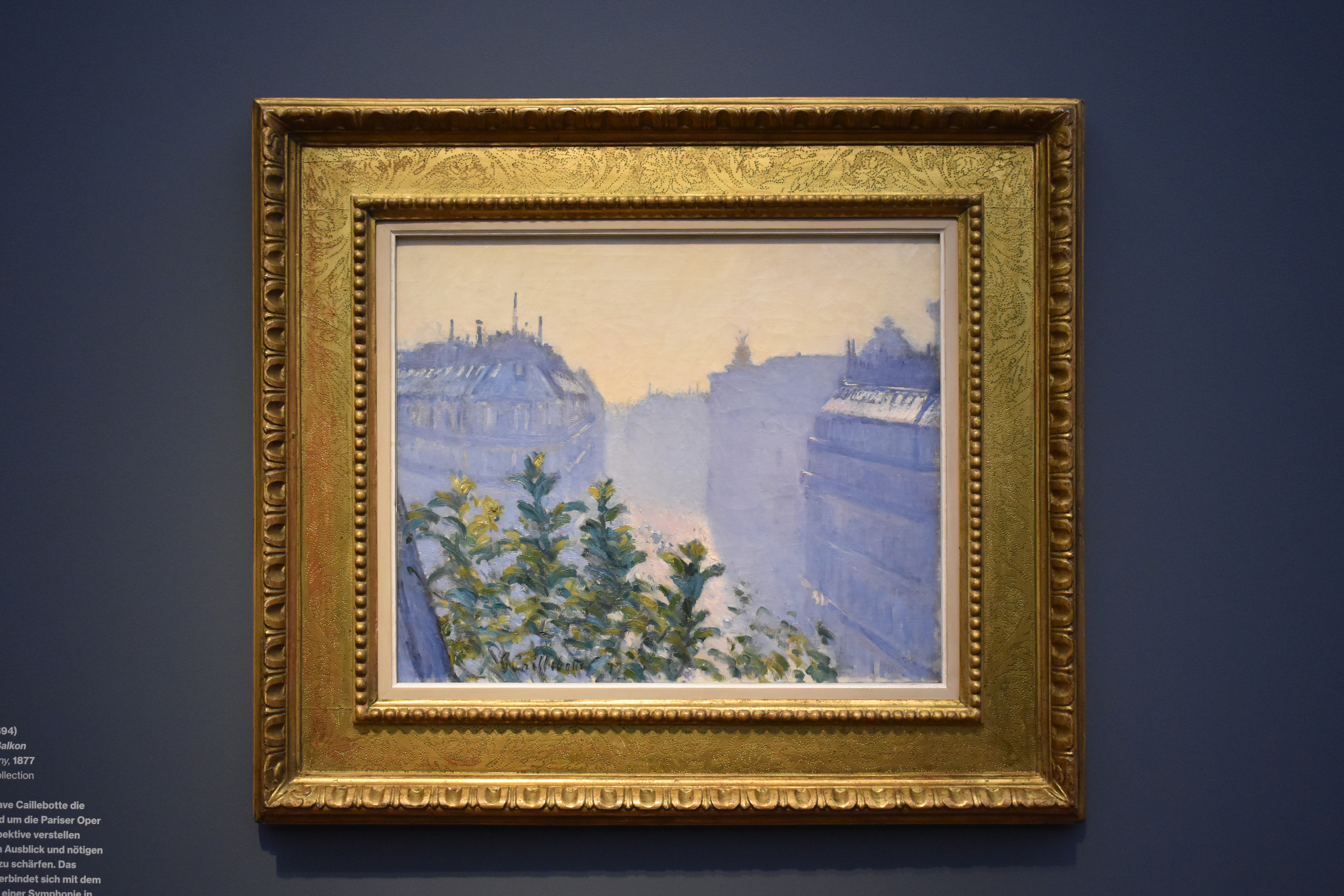 Гюстав Кайботт (Gustave Caillebotte). Улица Халеви, вид с балкона. 1877. Гюстав Кайботт изобразил впечатляющие многоквартирные дома вокруг Парижской оперы на трех картинах. В этом ракурсе растения на балконе загораживают вид, заставляя зрителя присмотреться. Холодный, туманный утренний свет в сочетании с серебристо-серым цветом цинковых крыш создает симфонию сине-фиолетовых оттенков.