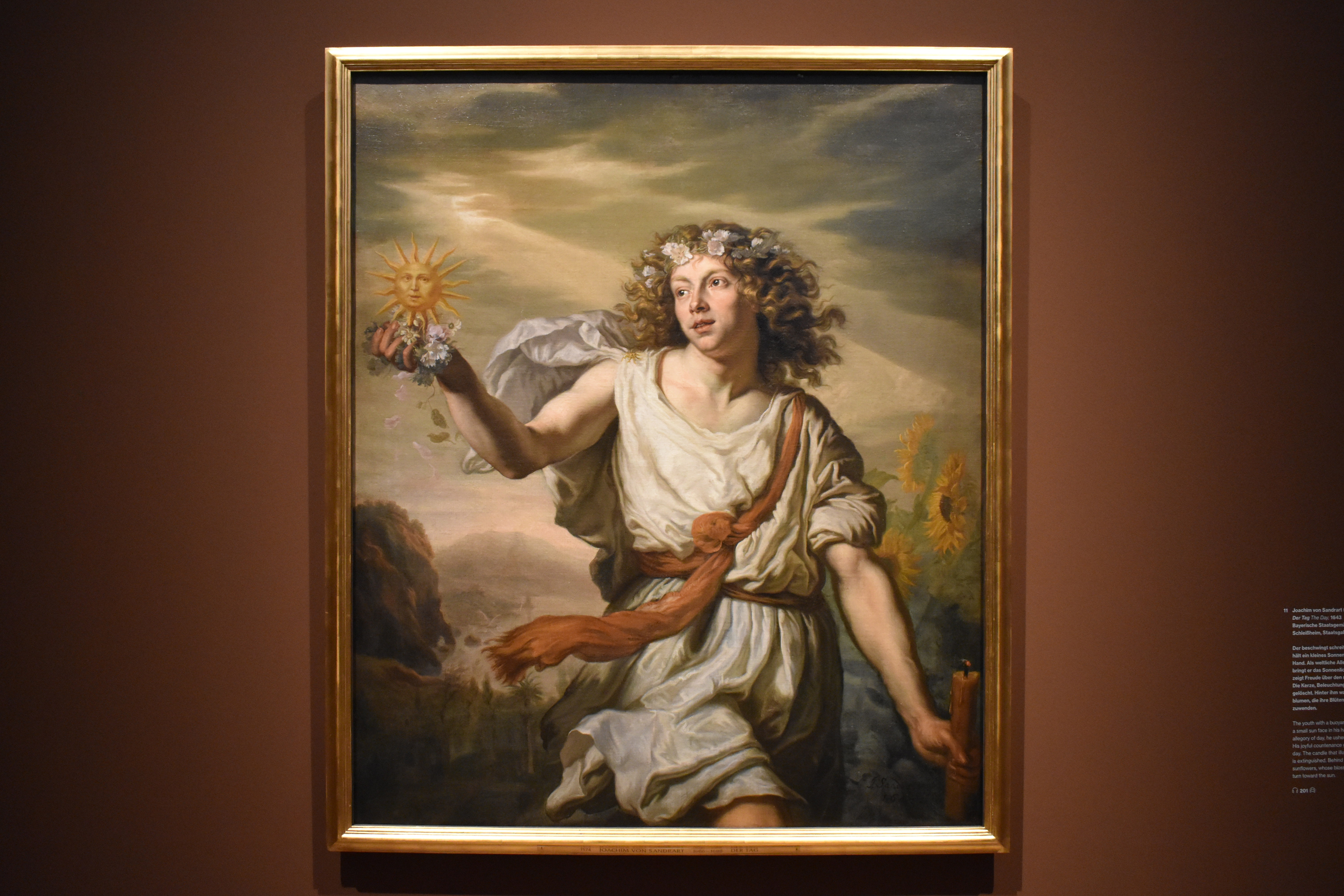 Иоахим фон Зандрарт (Joachim von Sandrart). День. 1643. Оживленно шагающий юноша держит в руке маленький символ солнца. В качестве светской аллегории дня он несет с собой солнечный свет. Его лицо выражает радость по поводу наступления нового утра. Свеча, освещающая ночь, погасла. За его спиной растут подсолнухи, всегда обращенные своими соцветиями к солнцу.