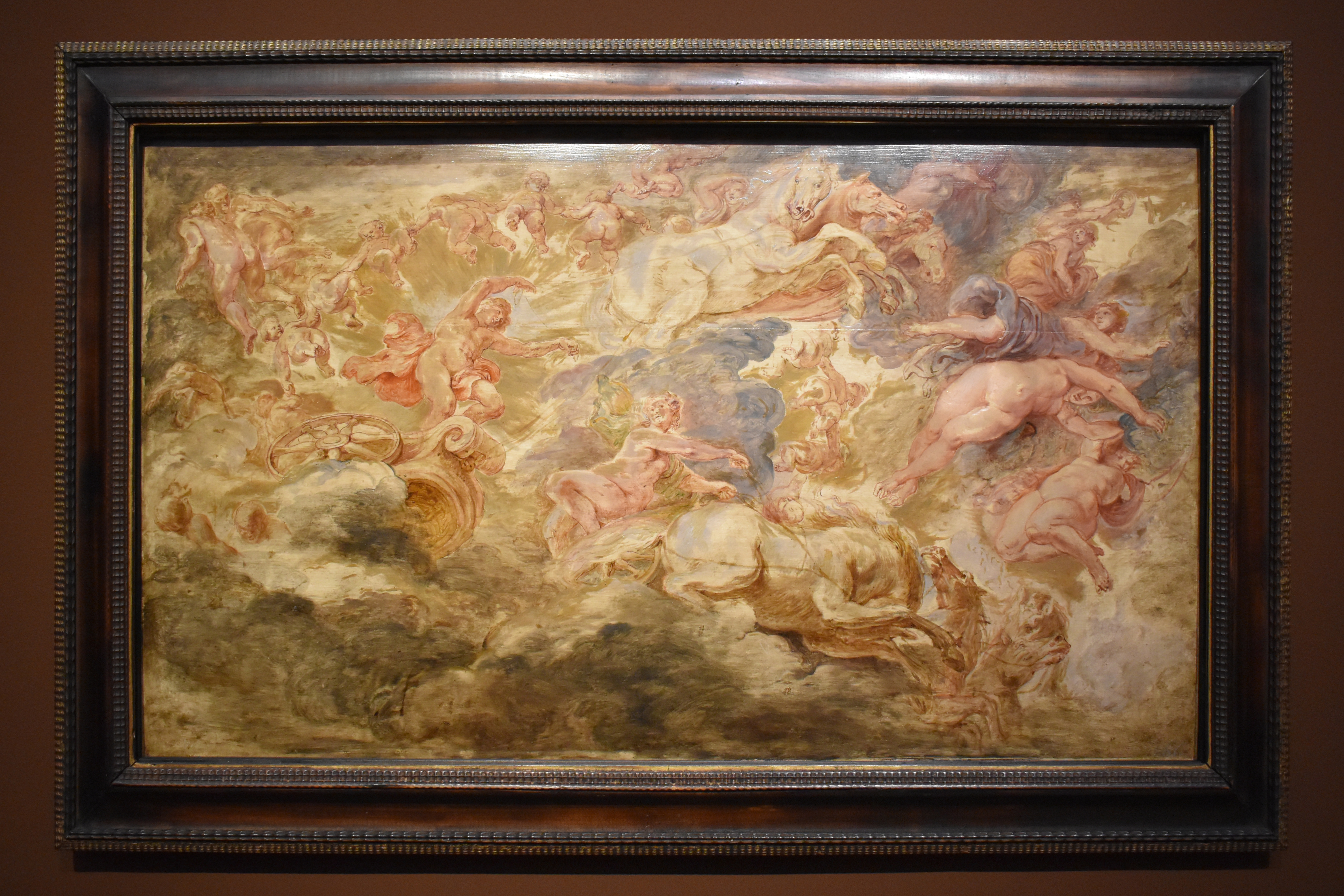 Питер Пауль Рубенс (Peter Paul Rubens). Падение Фетона" 1604/05, vermutlich überarbeitet um, вероятно, переделано ок. 1606-1608. Стремясь управлять солнечной колесницей, сын Аполлона Фетон переоценил свои силы. Он проехал слишком близко от земли, воспламенив ее. Молния Зевса положила конец неудачному путешествию. Фаэтон, кони и Горы – олицетворения часов – падают в диком беспорядке, под ними – горящая земля, а над ними – зодиак, символ космического порядка.