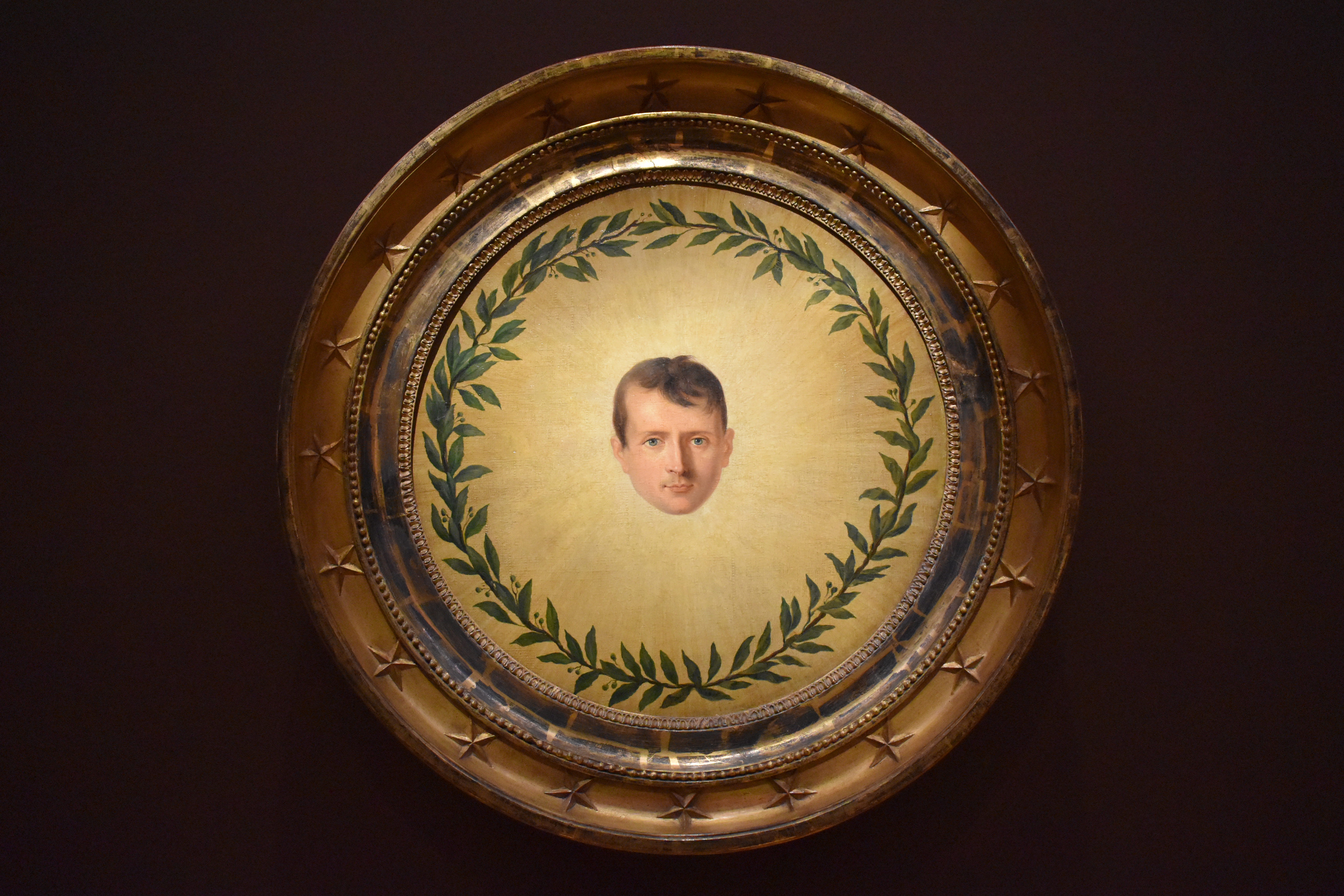 Лоран Дабос (Laurent Dabos) с Анны-Луи Жироде-Триозон (Anne-Louis Girodet-Trioson). Наполеон I в лучах солнца, 1806 г. В этом необычном изображении натуралистический портрет Наполеона I сочетается с символическим солнечным лучом. Лучи вокруг головы правителя говорят о том, что он, подобно солнцу, освещает землю. Лавровый венок является не только атрибутом Аполлона, но и символизирует императорский сан, который Наполеон занимал с 1804 года.