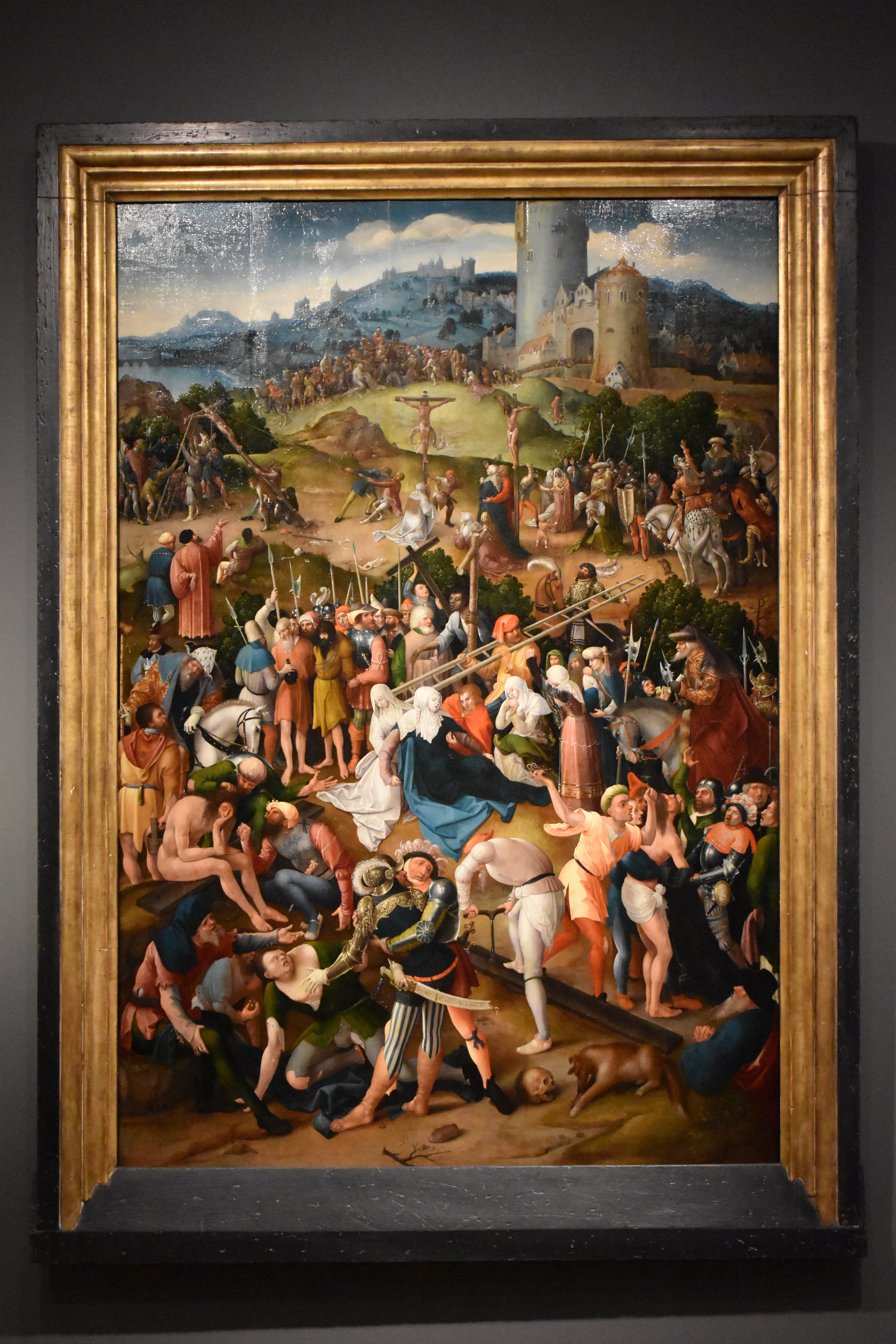 Для изображения Голгофы, горы, на которой был распят Христос, Якоб Корнелис ван Остсанен (Jacob Cornelisz van Oostsanen) выбрал высокую точку обзора. Поступая так, он создал обширный ландшафт, на котором одновременно изображались последовательные эпизоды Страстей Христовых. Эта повествовательная традиция часто использовалось в средневековой живописи. Посередине Христос на кресте с четырьмя ангелами, собирающими кровь. На переднем плане Мария Магдалина, Мария, Иоанн и святая Вероника с тканью. На краю её мантии написано: Salve Sact (a) Facies Nos (tri) Redemptor (is). Прямо на коне Лонгин и сотник. На заднем плане: распятие, прощание Христа с матерью и молитва в Елеонском саду в Гефсимании. Ближе к концу своей карьеры Лукас ван Лейден (Lucas van Leyden) написал несколько картин Богородицы с Младенцем, в том числе и эту, справа. Расположение матери и ребенка близко к картинной плоскости придает сцене интимность, которая еще больше усиливается ее нежной лаской. Чтобы создать личную связь со зрителем, Мария и Иисус смотрят на нас с поразительной прямотой. Мария сидит с младенцем Христом на коленях. В левой руке ребенок держит шар с крестом, а в правой – цветок.