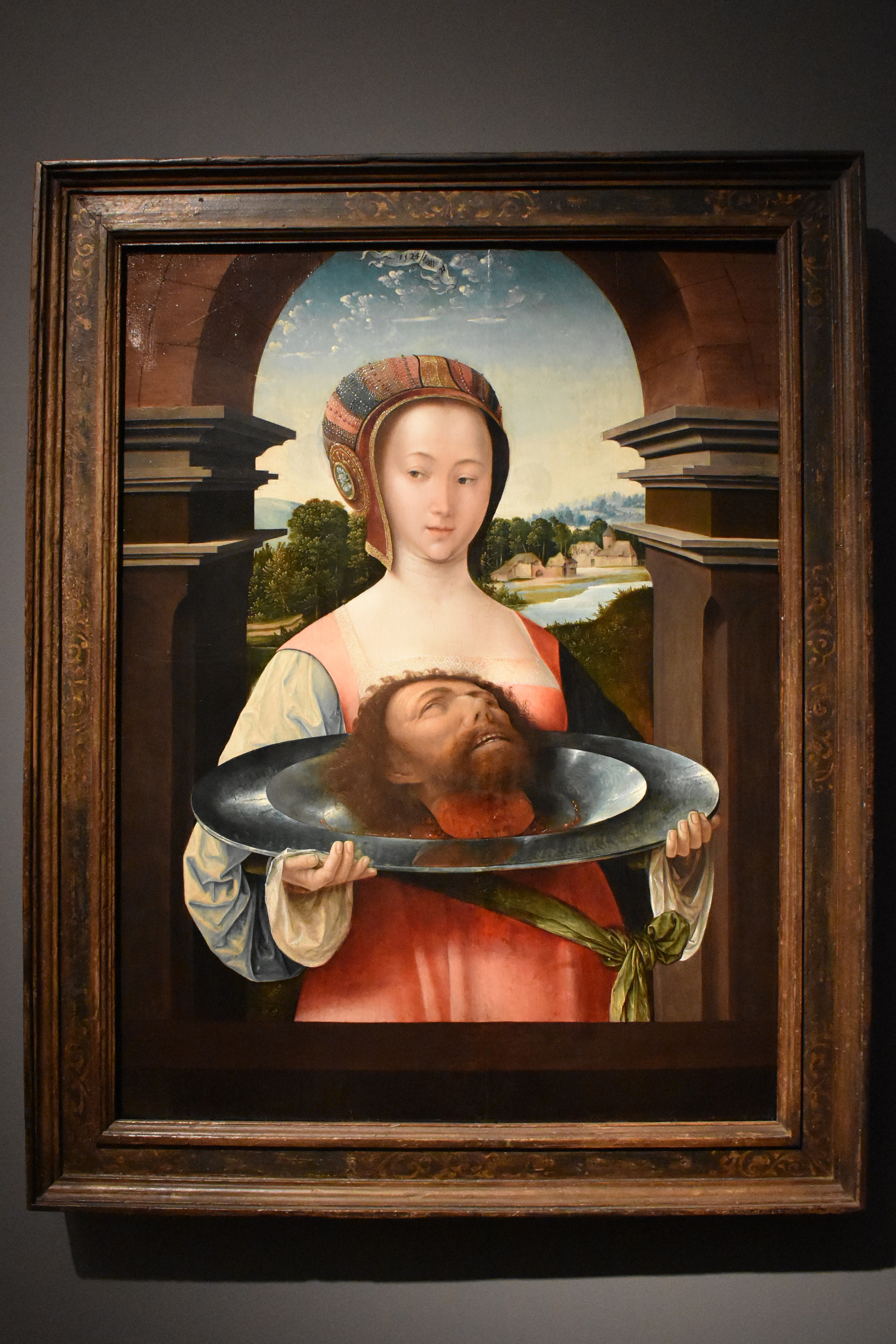Саломея соблазнительно танцевала для царя Ирода, и в награду ей было исполнено желание. По настоянию своей матери Иродиады Саломея попросила голову Иоанна Крестителя, критиковавшего прелюбодеяние Иродиады с царем. Саломея показывает нам свой приз – голову святой на блюде. Саломея стоит под аркой, вдали виднеется пейзаж с крестьянским хозяйством у реки.