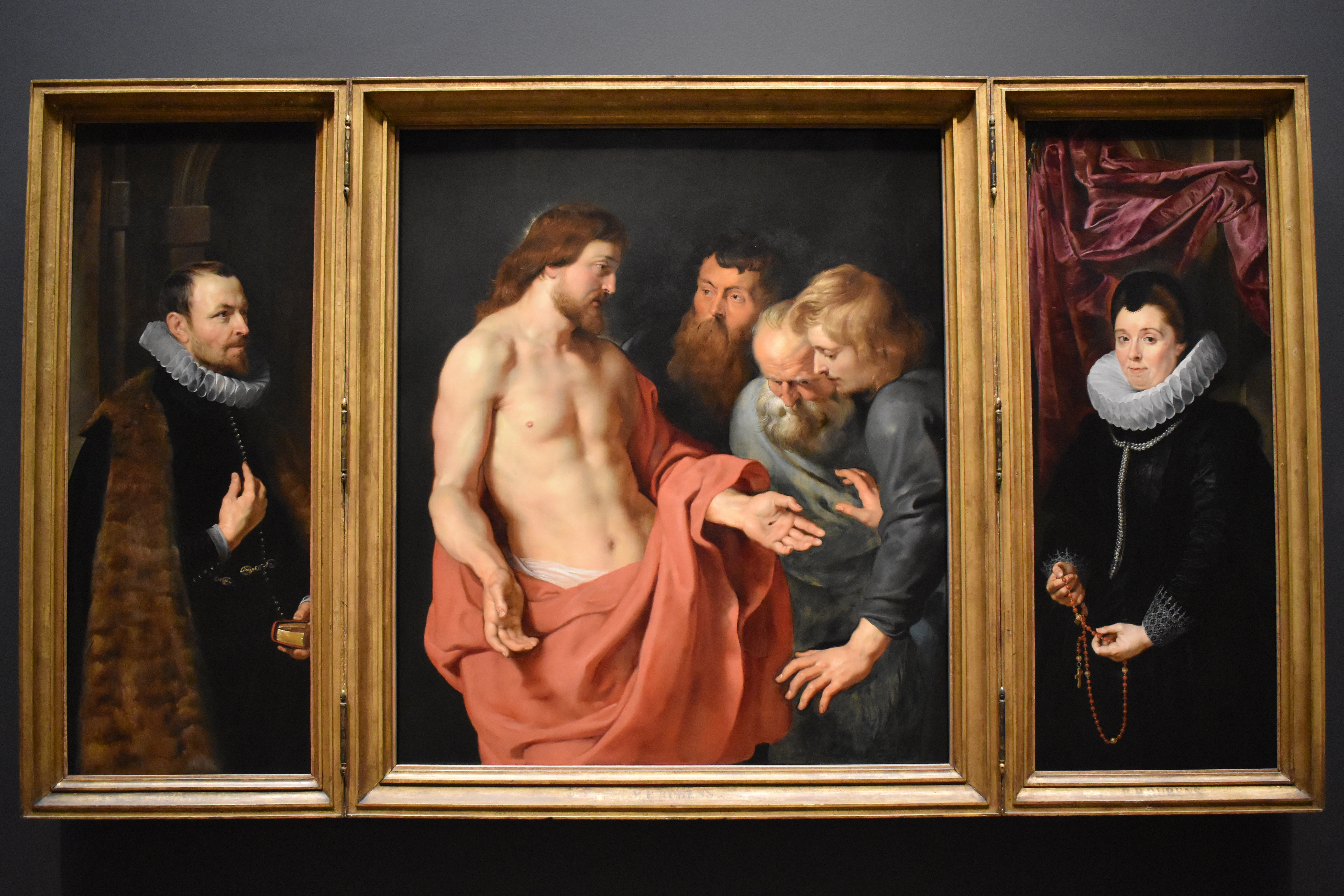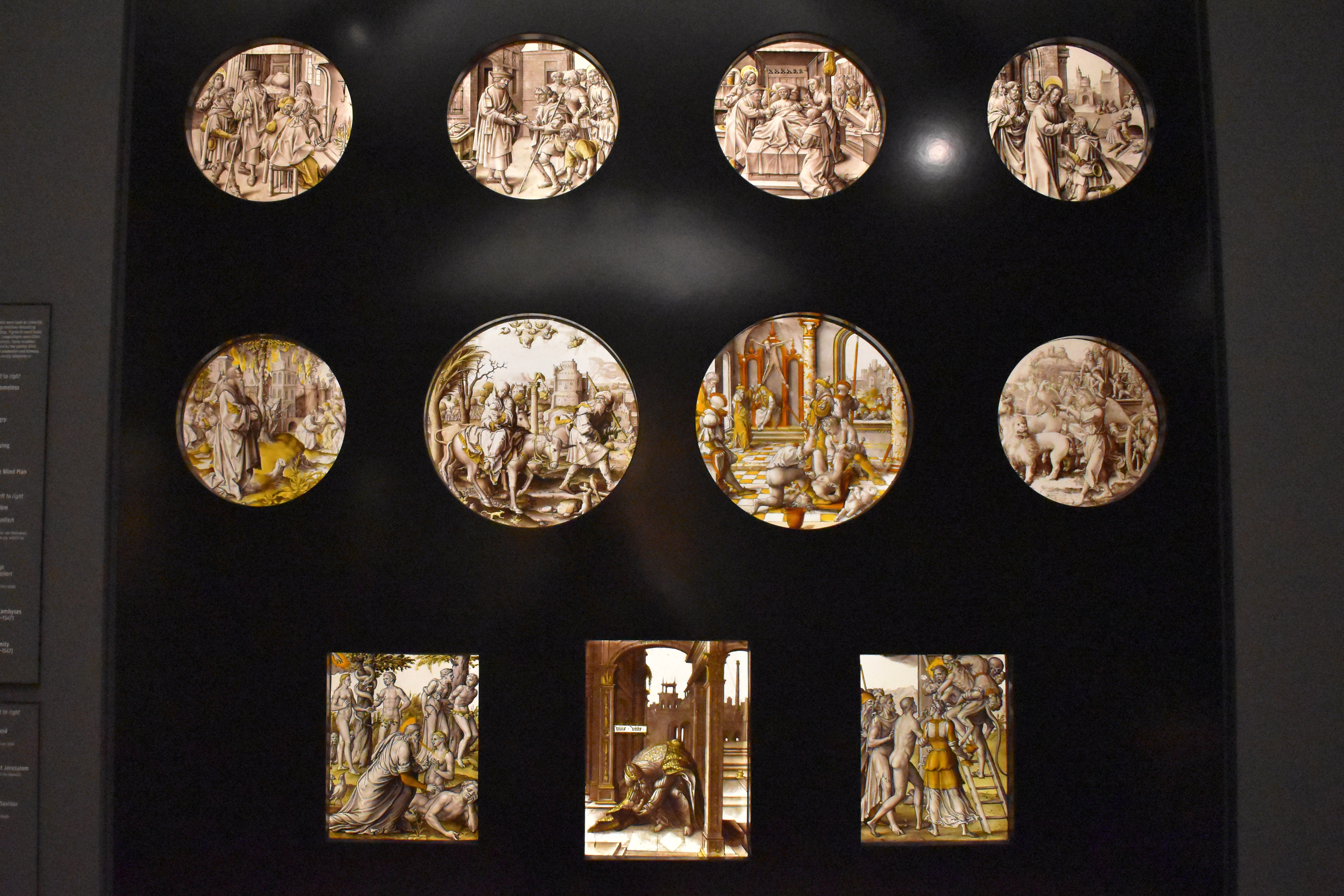 Эти три группы изображают сцены из жизни Христа, в которых он появляется за трапезой (Христос в доме Марии и Марфы; Тайная вечеря; Ужин в Эммаусе) созданы неизвестным мастером в 1520 году. Первоначально они составляли часть предллы (нижней зоны) большого резного алтаря. Три сцены за столом относятся к празднованию Мессы, когда хлеб и вино преподносятся к алтарю как тело и кровь Христа. Миниатюрный алтарь справа – один из самых красивых образцов работы французских ювелиров периода около 1400 года. Возможно, он происходил из аббатства Шок (Па-де-Кале) и, несомненно, принадлежал кому-то, связанному с парижским двором. Видя измученное тело Христа, хозяин мог в любой момент задуматься о его страданиях.
