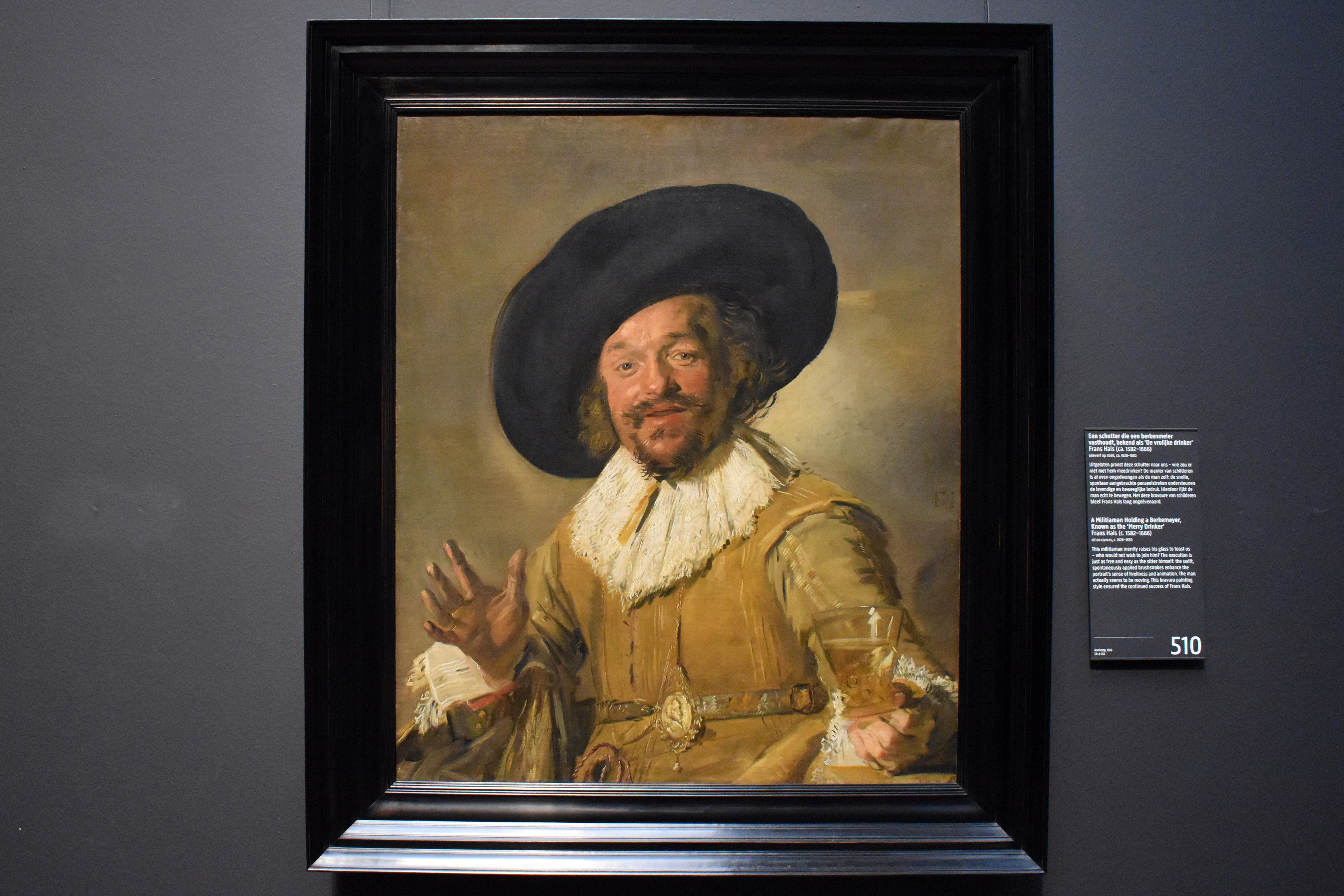 Мужчина в экстравагантной итальянской одежде застал нас врасплох. Он появляется из-за гобелена и высовывается из окна, в правой руке скрипач держит стакан с вином (беркенмайер), в левой – скрипку с смычком. На голове шапка с перьями. Исполнение Хонтхорста настолько реалистично и убедительно, что скрипач, кажется, выскользнул из рамы картины, чтобы присоединиться к нам, пытаясь взаимодействовать со зрителем, чтобы чокнуться.