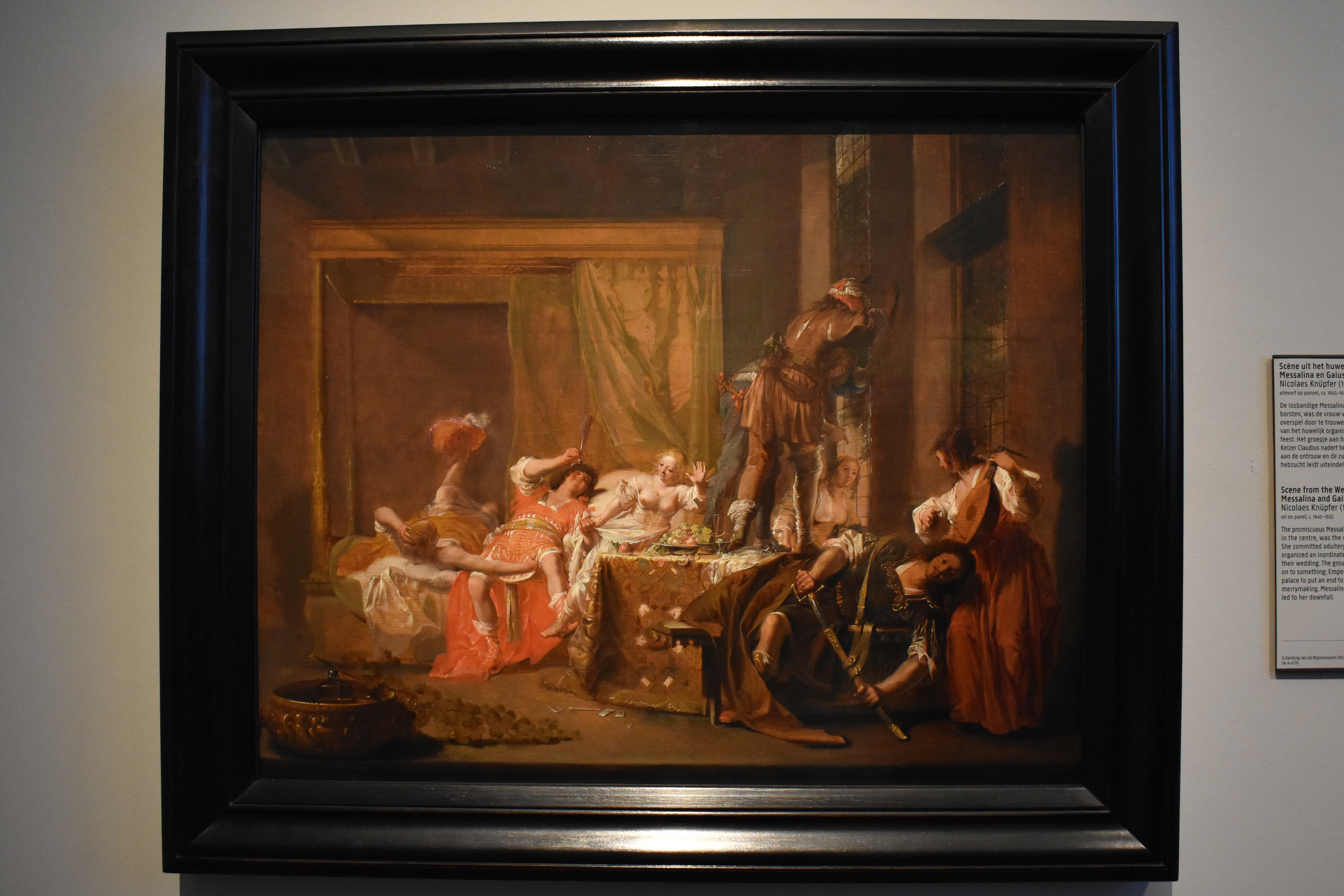 Распутная Мессалина, обнаженная женщина в центре, была женой императора Клавдия. Она совершила прелюбодеяние, выйдя замуж за Силия, и они устроили чрезмерно пышный банкет, чтобы отпраздновать свою свадьбу. Группа, выглядывающая из окна, что-то подмечает; Император Клавдий приближается ко дворцу, чтобы положить конец неверности, пьянству и веселью. Неистовая жадность Мессалины в конечном итоге привела к её падению.