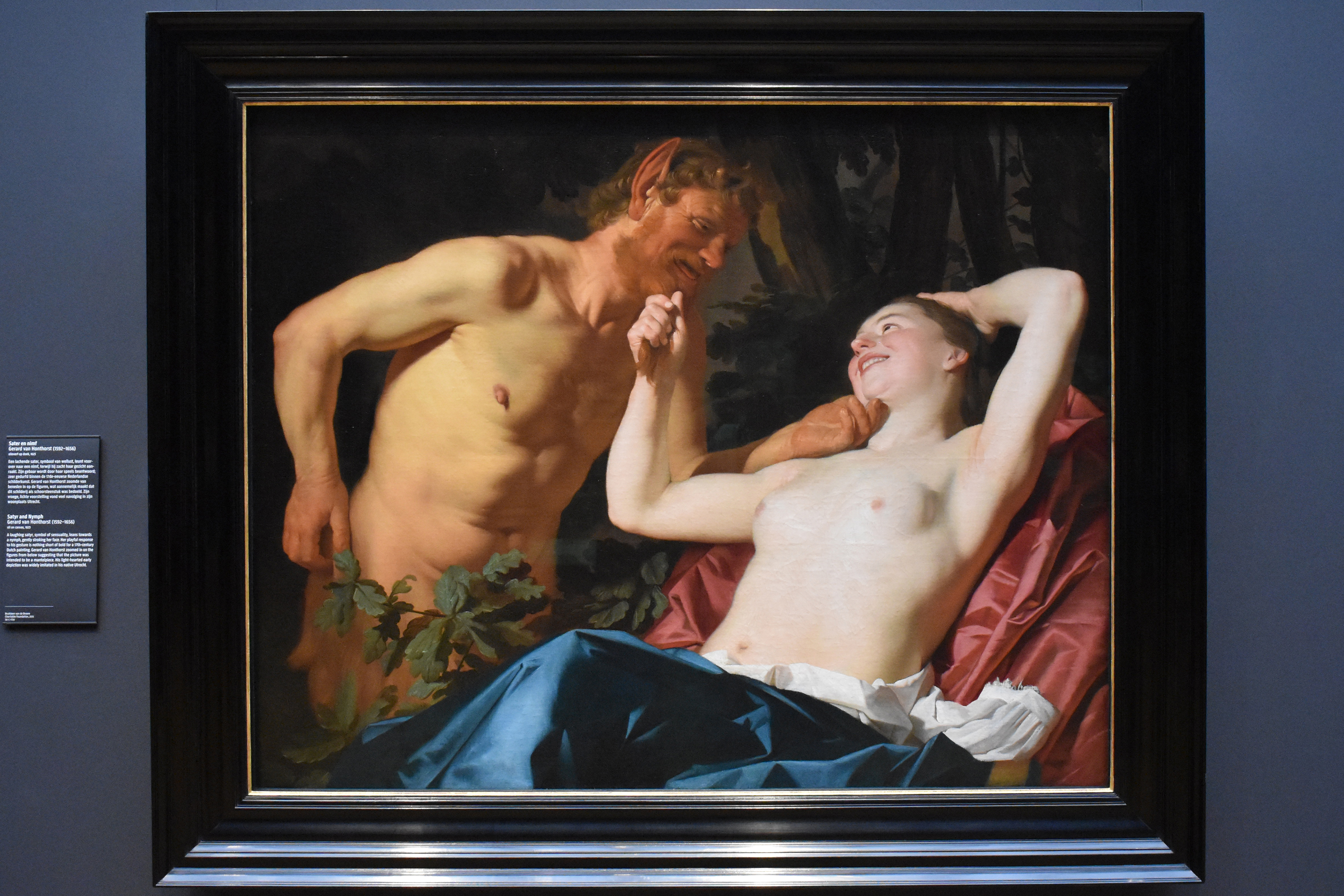 Смеющийся сатир наклоняется над нимфой и нежно касается ее лица, а нимфа теребит его за бороду. Геррит ван Хонтхорст нарисовал две мифологические фигуры на переднем плане композиции, отвлекая внимание от леса на заднем плане и уходящего вдаль вида.