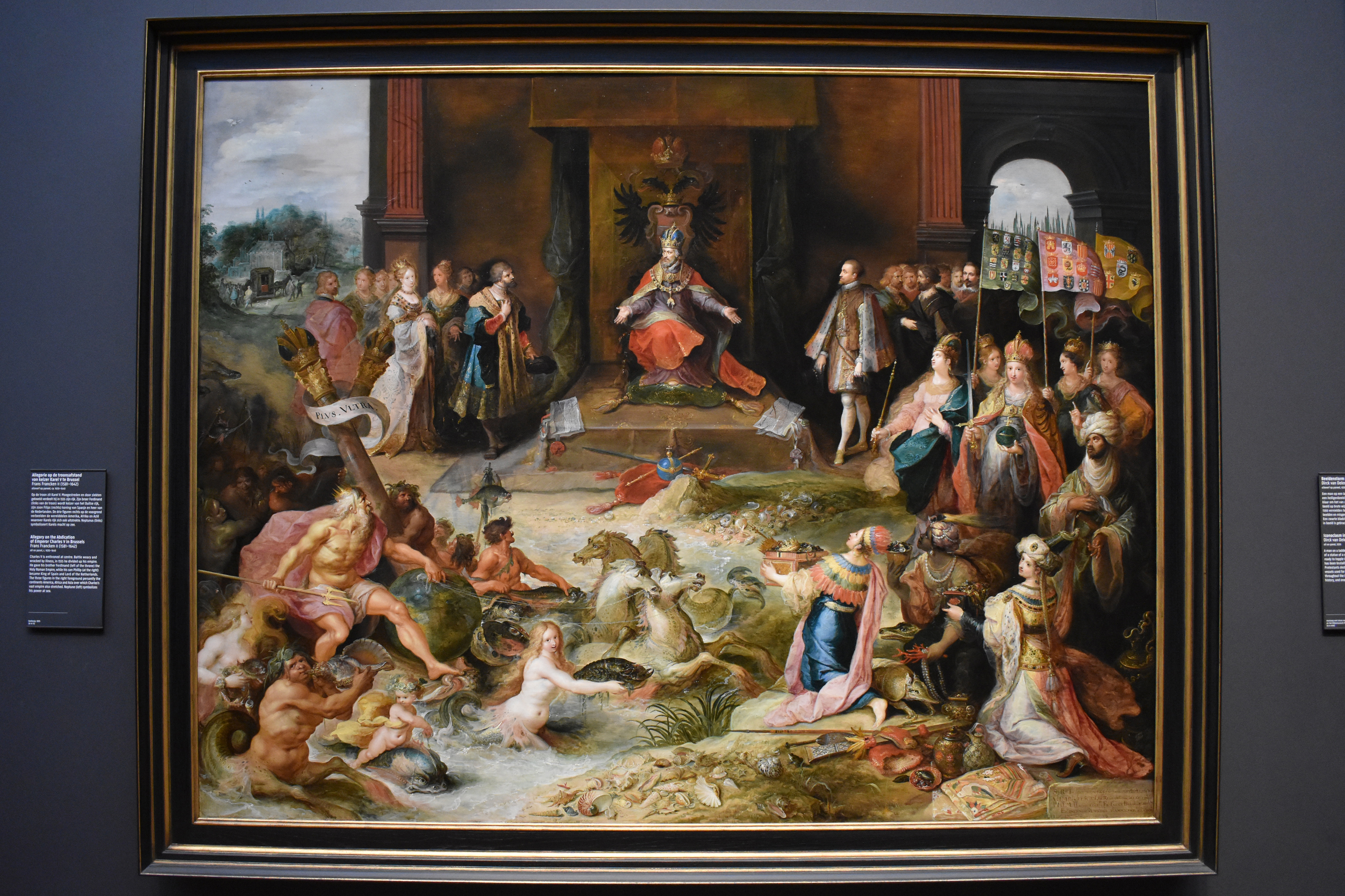 Карл V восседает на троне в центре. Утомленный битвой и измученный болезнью, в 1555 году он разделил свою империю. Он дал своему брату Фердинанду (слева от трона) Священную Римскую империю, а его сын Филипп (справа) стал королем Испании и лордом Нидерландов. Три фигуры на правом переднем плане олицетворяют континенты Америку, Африку и Азию, на которые также простиралась огромная империя Чарльза. Нептун (слева) символизирует его силу на море.