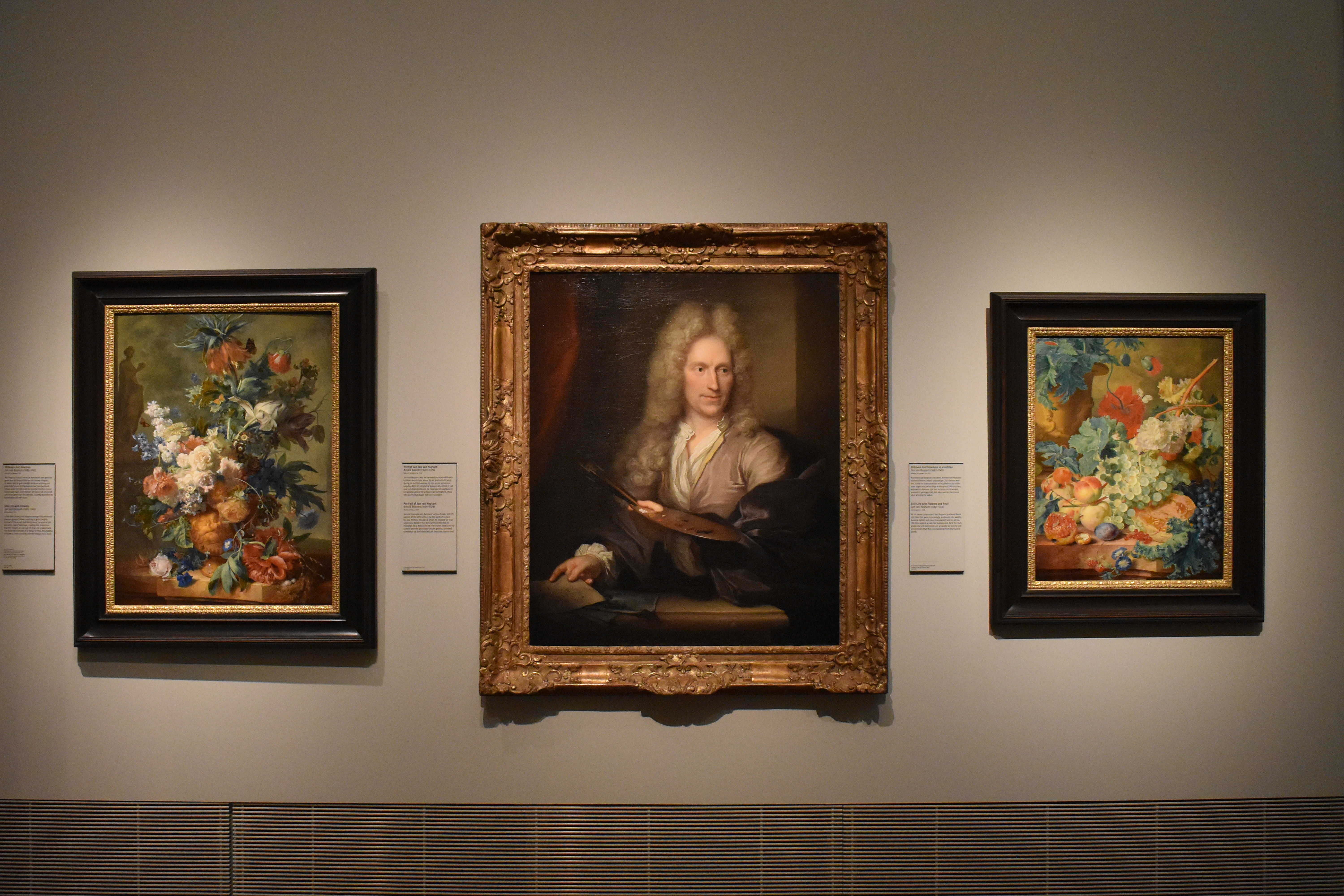В XVIII веке Ян ван Хёйсум (Jan van Huysum) поднял чрезвычайно популярный жанр цветочной живописи на большие высоты. Вместо обычного темного фона он использовал светлый с парковым пейзажем, создавая впечатление, будто цветы расставлены на открытом воздухе на балюстраде. Декор здесь состоит из статуи Флоры, богини цветов, немного нарисованной листвы и пруда. Ян ван Хюйсум был самым известным художником-натюрмортами 18 века. На этом портрете ему чуть больше тридцати, и в этом возрасте он добился первых успехов. Боонен вполне мог нарисовать это в обмен на цветочный натюрморт. Стильный плащ и занавеска придают картине определенную серьезность, которую несколько смягчает неформальность открытой рубашки натурщика. По мере развития своей карьеры Ван Хейсум создавал цветочные натюрморты, которые становились все более яркими. Его палитра стала светлее и прозрачнее, натюрморты он противопоставил парковому фону. Здесь фрукты, виноградная лоза и мальвы расположены так рыхло и ненадежно, что рискуют упасть с мраморного постамента.