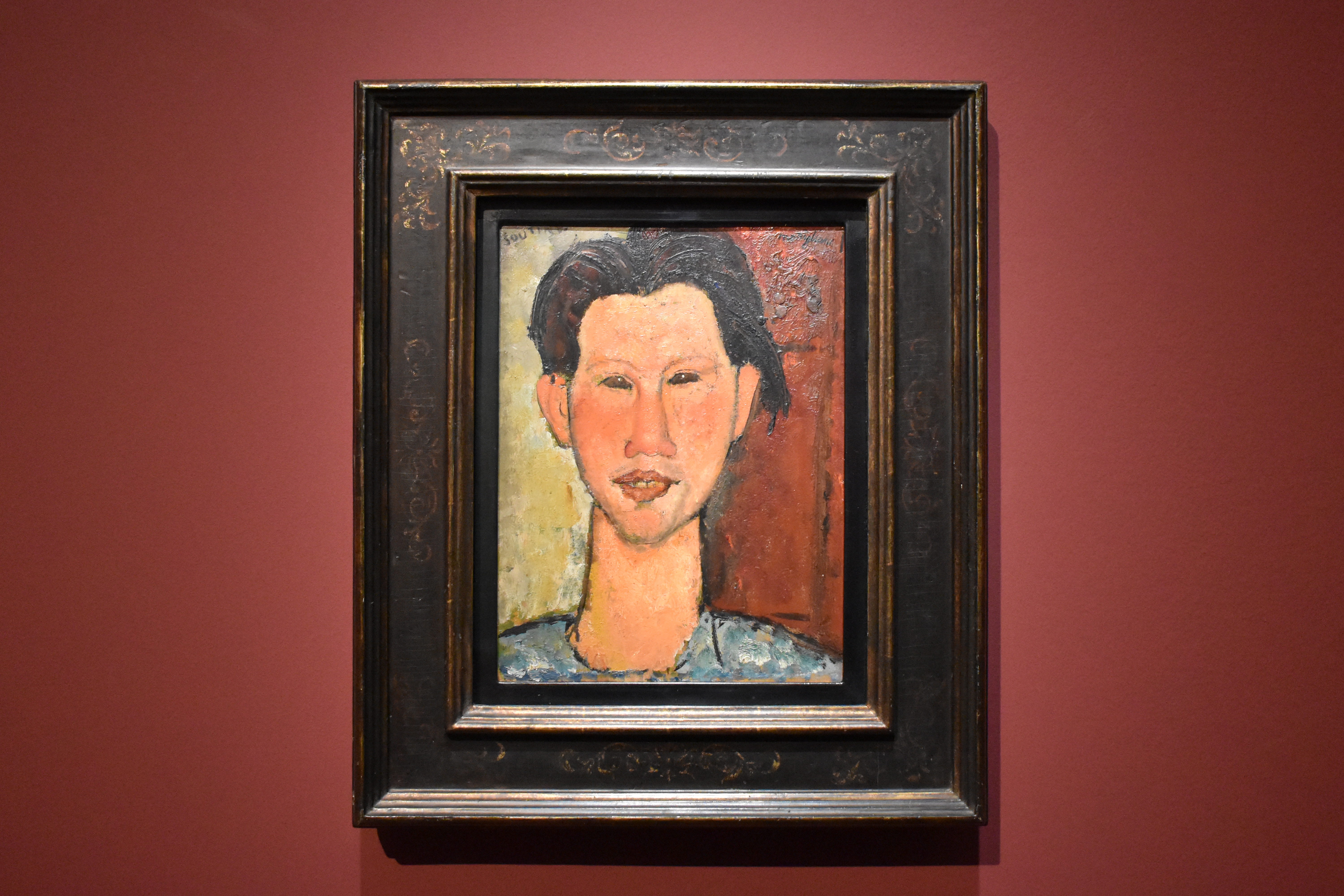 Модильяни написал несколько портретов художника Хаима Сутина (1894-1943), который был младше его на десять лет, его соседом по Парижу и произвел фурор своими экспрессивными картинами. Фронтальный этюд головы отличается большей непосредственностью, чем более поздние поясные портреты. Модильяни с четкой акцентированностью передает диковатое мальчишество 21-летнего литовца, грубые черты лица которого с раскосыми глазами, широкими скулами и полными губами так тщательно вылеплены, что их уродство (от которого Сутин страдал всю жизнь) кажется иконически одухотворенным, несмотря на их живость.