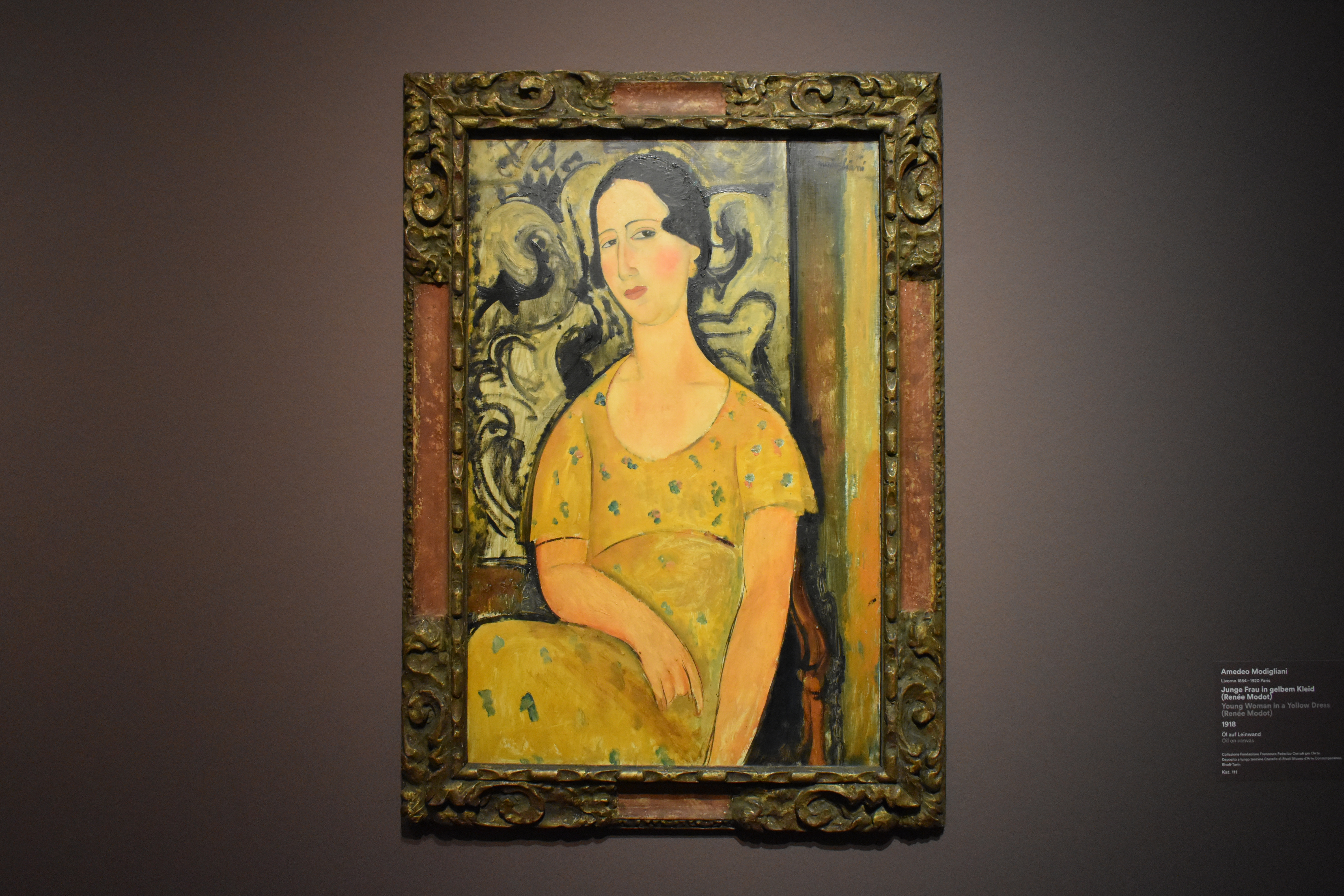 Женский портрет, характеризующийся меланхоличным взглядом, живым тоном желтого платья и арабесковым фоном, относится к тому напряженному периоду творчества незадолго до преждевременной смерти в возрасте 35 лет Амедео Модильяни, в котором определились основные черты его поэтики. Очевидны ритмическая сила и конструктивная функция линии, выработанная в контакте с африканской скульптурой и впоследствии подвергшаяся прямому эксперименту в скульптуре архаических каменных голов. Работа, в которой слышны матиссианские отголоски, – портрет Рене Модо, жены Гастона Модо, художника-любителя и известного актера парижского кино первой половины XX века.