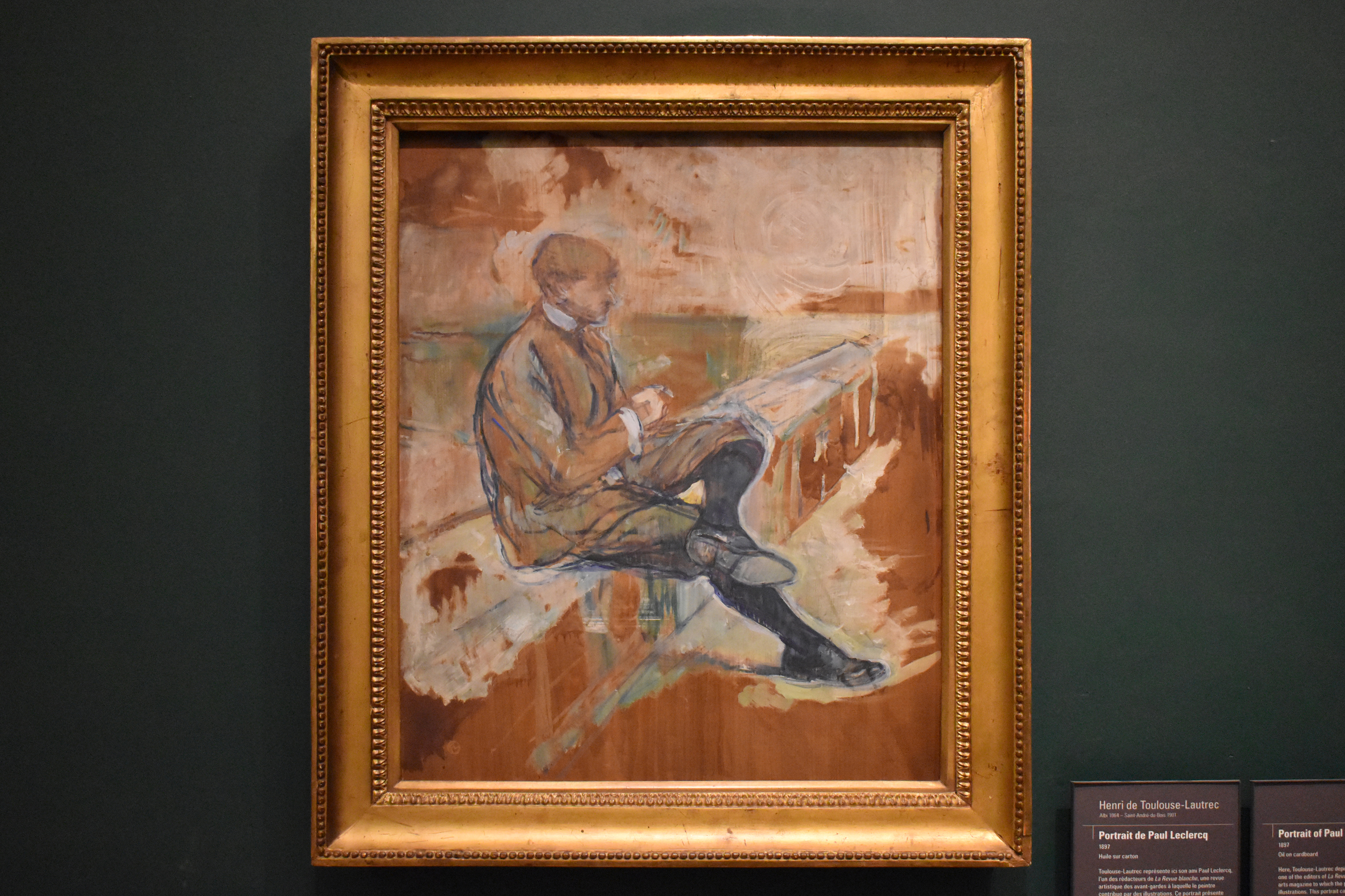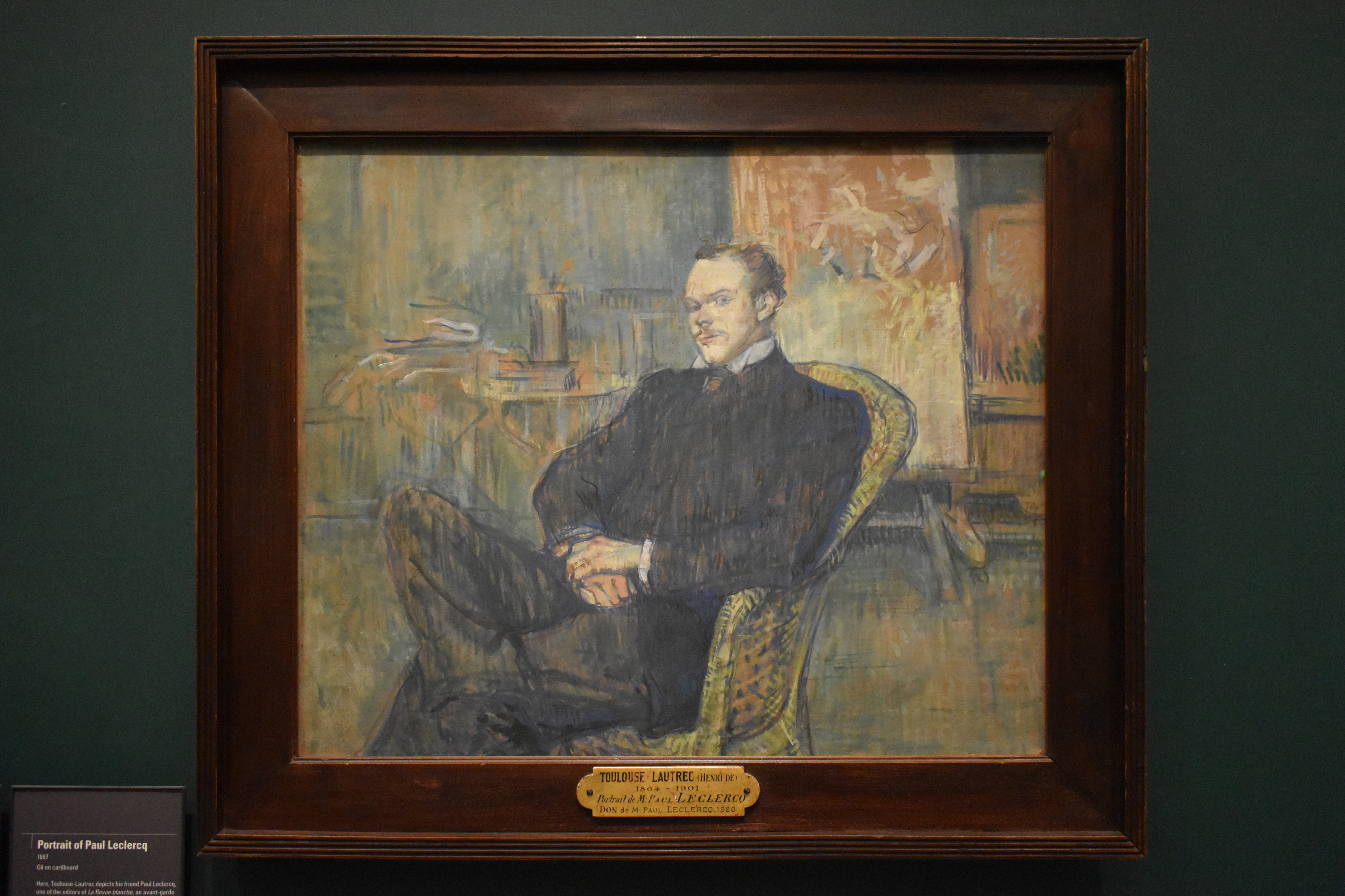 В 1897 году Лотрек решил написать портрет Поля Леклерка (1872-1856), молодого писателя, одного из основателей журнала La Revue Blanche. В течение месяца Леклерк приходил в парижскую студию художника на авеню Фрошо. Он сам рассказывал о том, что происходило во время этих встреч: "Как только я приходил, он просил меня сесть в большое плетеное кресло. [...] Затем он пристально смотрел на меня сквозь очки, зажмуривал глаза, доставал кисть и, внимательно изучив то, на что смотрел, наносил на холст несколько мазков довольно жидкой краски. Затем он откладывал кисть и требовательно заявлял: "Хватит работать. Погода слишком хороша!, и мы отправлялись на прогулку по кварталу". Надо сказать, что, в отличие от Сезанна, который требовал от своих моделей длительного сохранения позы, Лотрек предпочитал видеть более оживленные объекты. Таким образом, он создал очень красноречивый портрет Леклерка. Писатель кажется совершенно непринужденным в обстановке студии. Но его вопросительный взгляд показывает, что он был озабочен тем, какой эффект он хотел передать художнику. Видно также, что его интересует метод работы Лотрека. Несомненное присутствие модели на этом исключительном портрете является доказательством успешного диалога между двумя мужчинами.